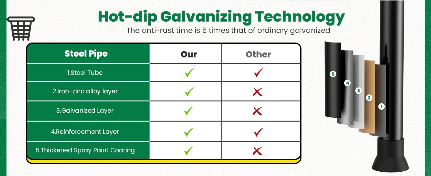 The trampoline features advanced hot - dip galvanizing technology, providing triple - layer protection. Each steel pipe is shielded by a robust iron - zinc alloy, a galvanized layer, and a protective black coat. This superior steel performs exceptionally well in salt spray tests, lasting much longer than standard options. We're so confident in its durability that we offer a 10 - year frame guarantee. -