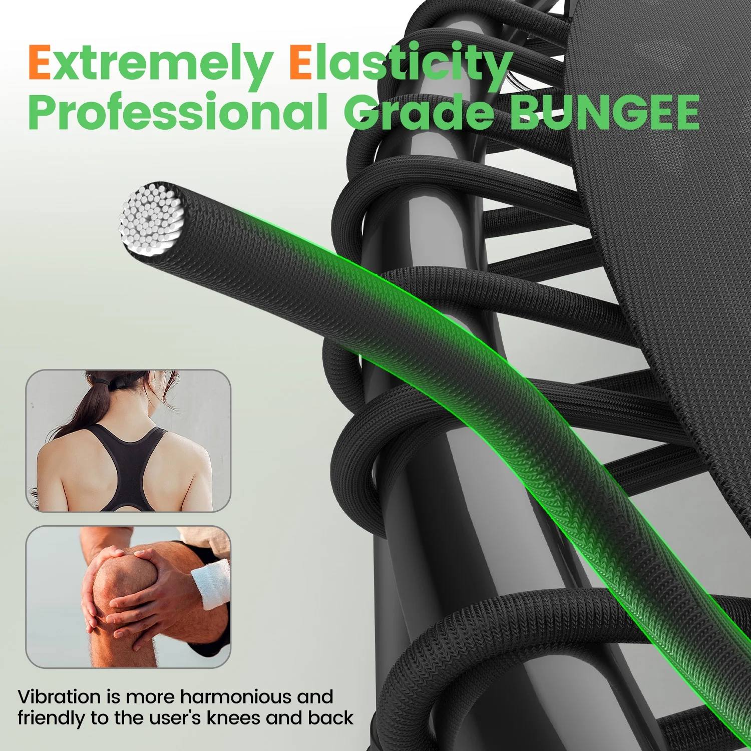 - 【Stable Structural Design】: This fitness trampoline is made of STRONG PP MESH, anti-wear and tear resistant round rebounding surface, joint-friendly suspension by 32 thickened bungee ropes, thick steel pipe, 6 legs supports user up to 450 pounds(204kg), gives you a great jumping experience.
