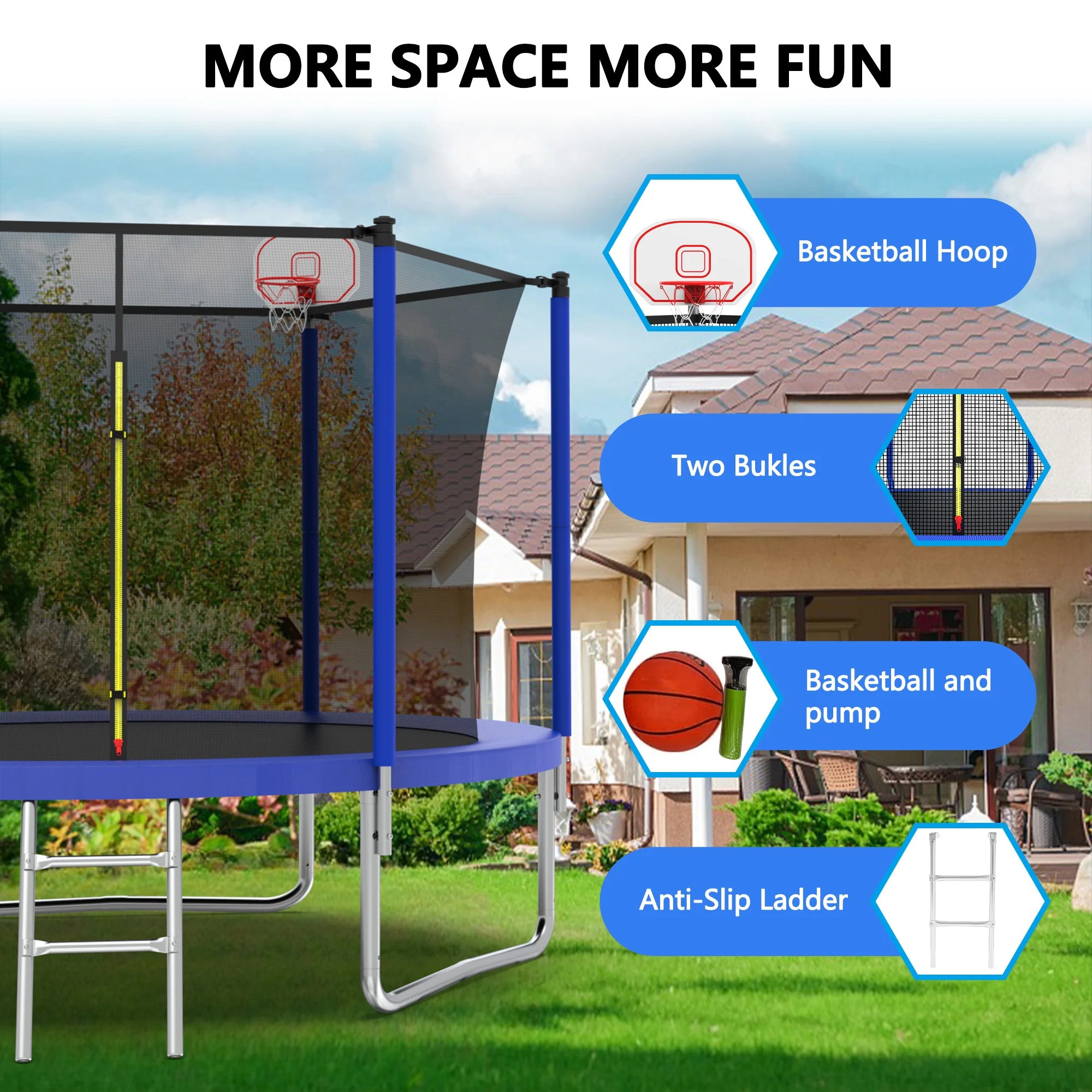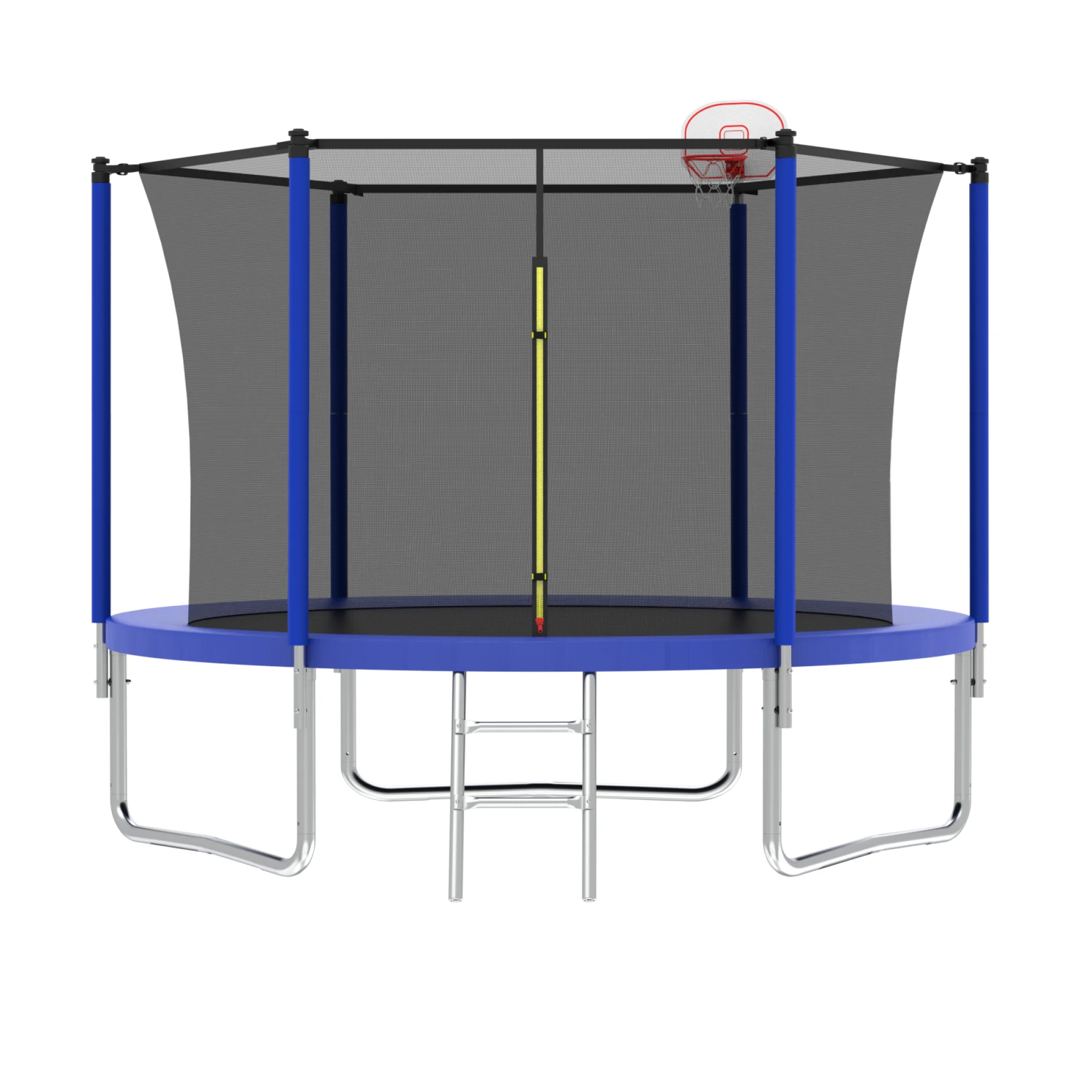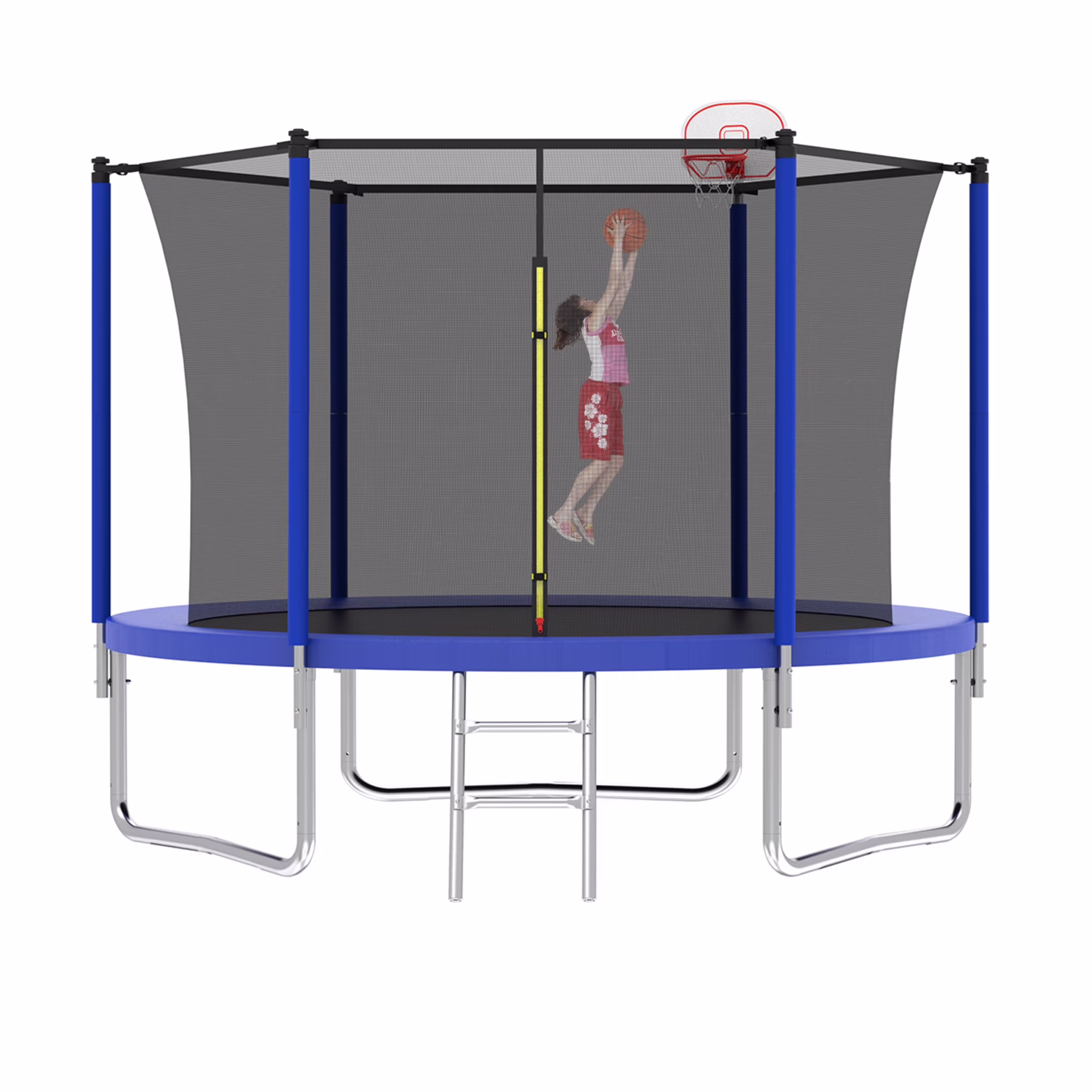 - Solid Structure-6 foam padded poles to support UV-proof safety trampoline enclosure net for maximum safety while jumping. Heavy duty 2-step galvanized steel ladder offers convenient maneuverability in and out of the trampoline.