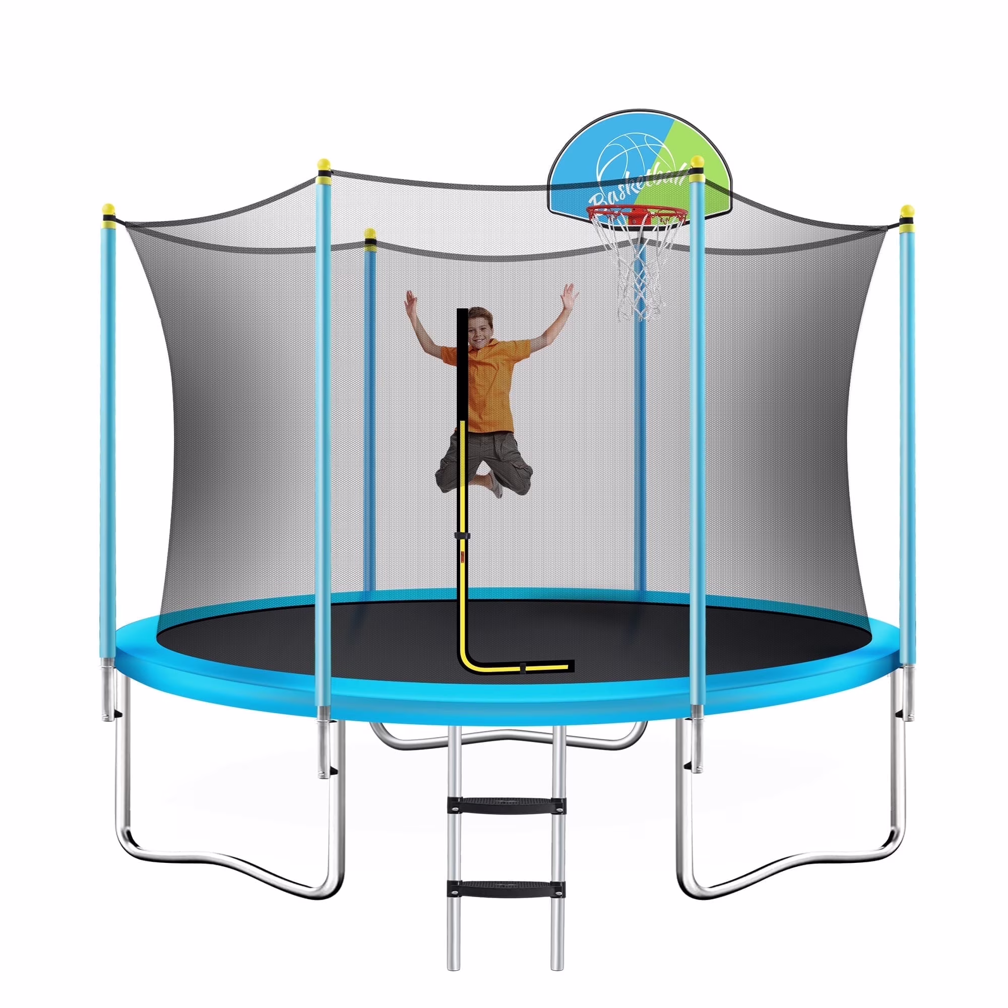 - [Careful Care] We this trampoline is equipped with a full-size safety cover pad and is fixed by high-quality elastic bands to protect your children from any potential injuries while playing. The sturdy two-step ladder provides straight navigation on and off the trampoline. The round design of the overall edge aimed to fully protect children from scratches and squeezing.
