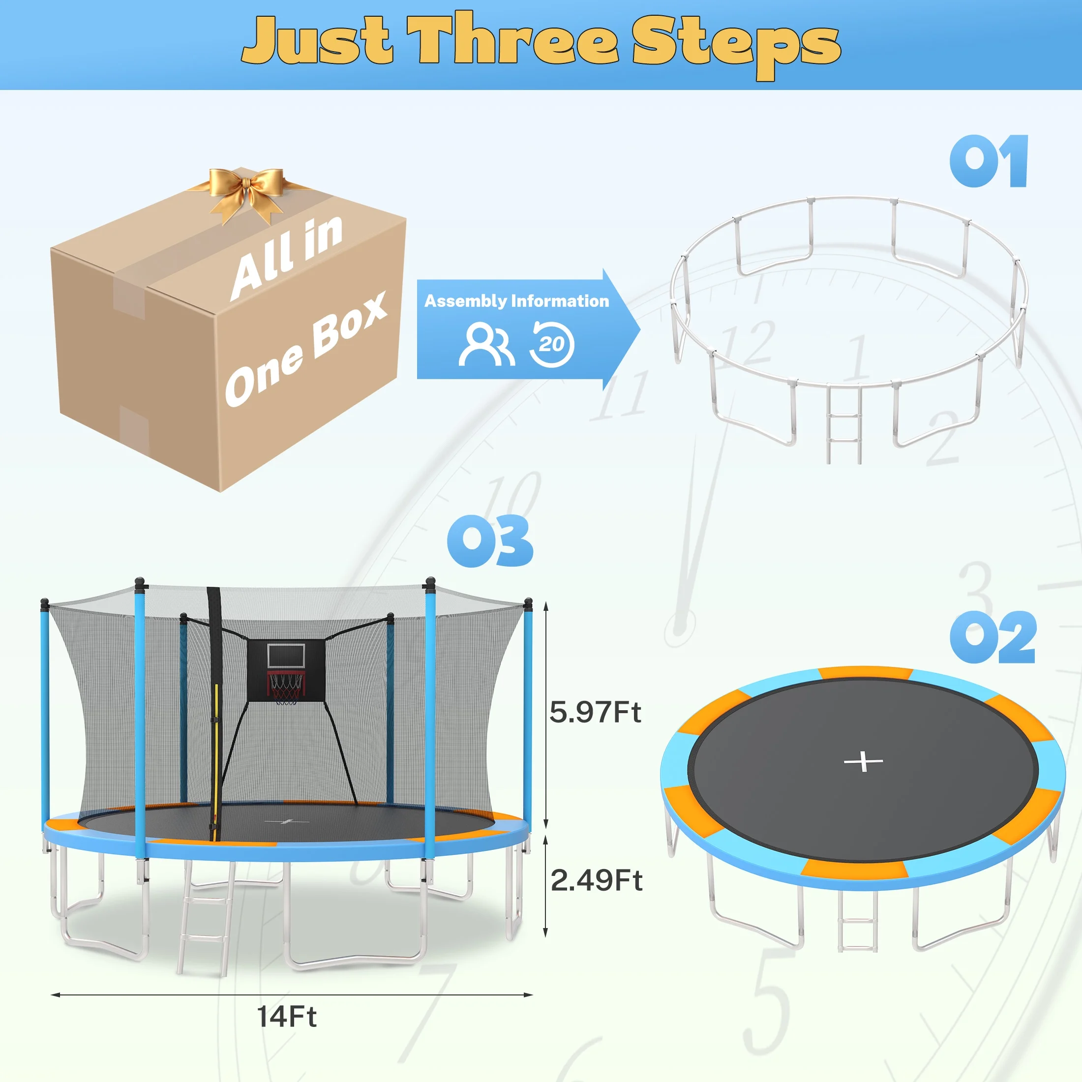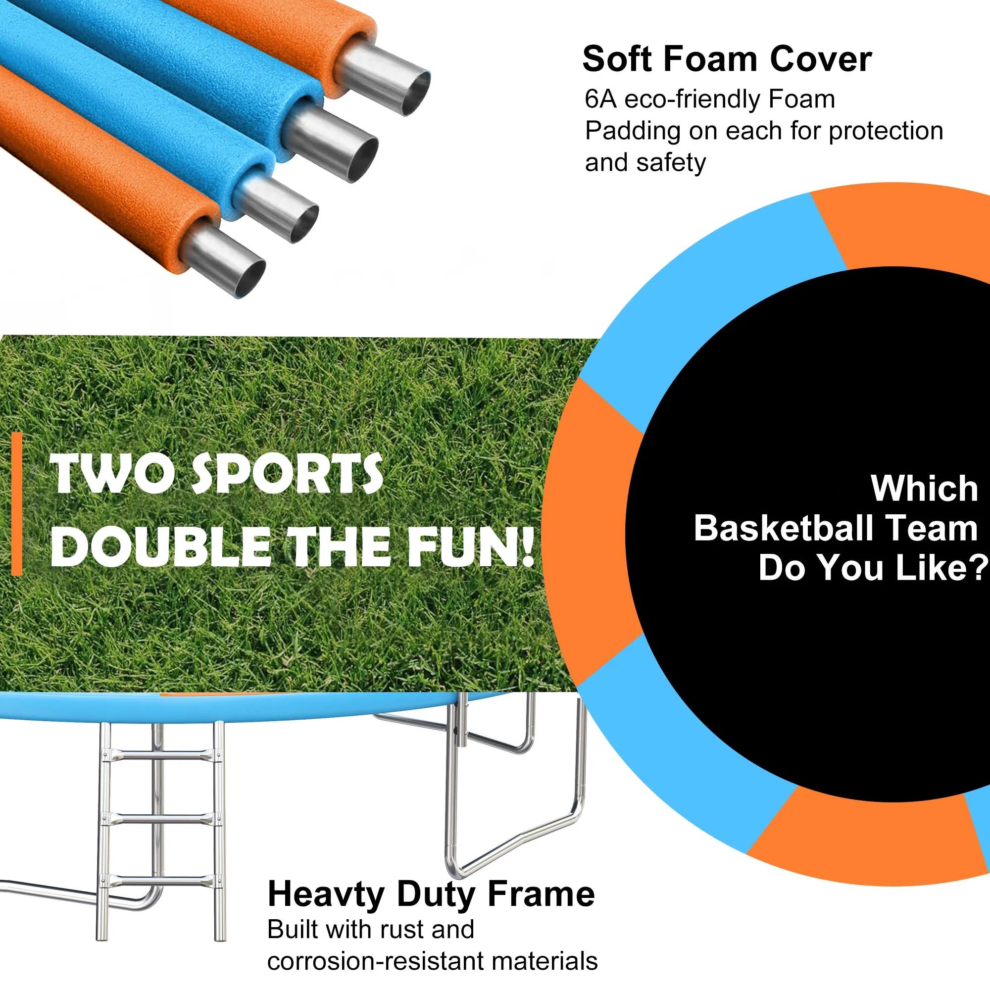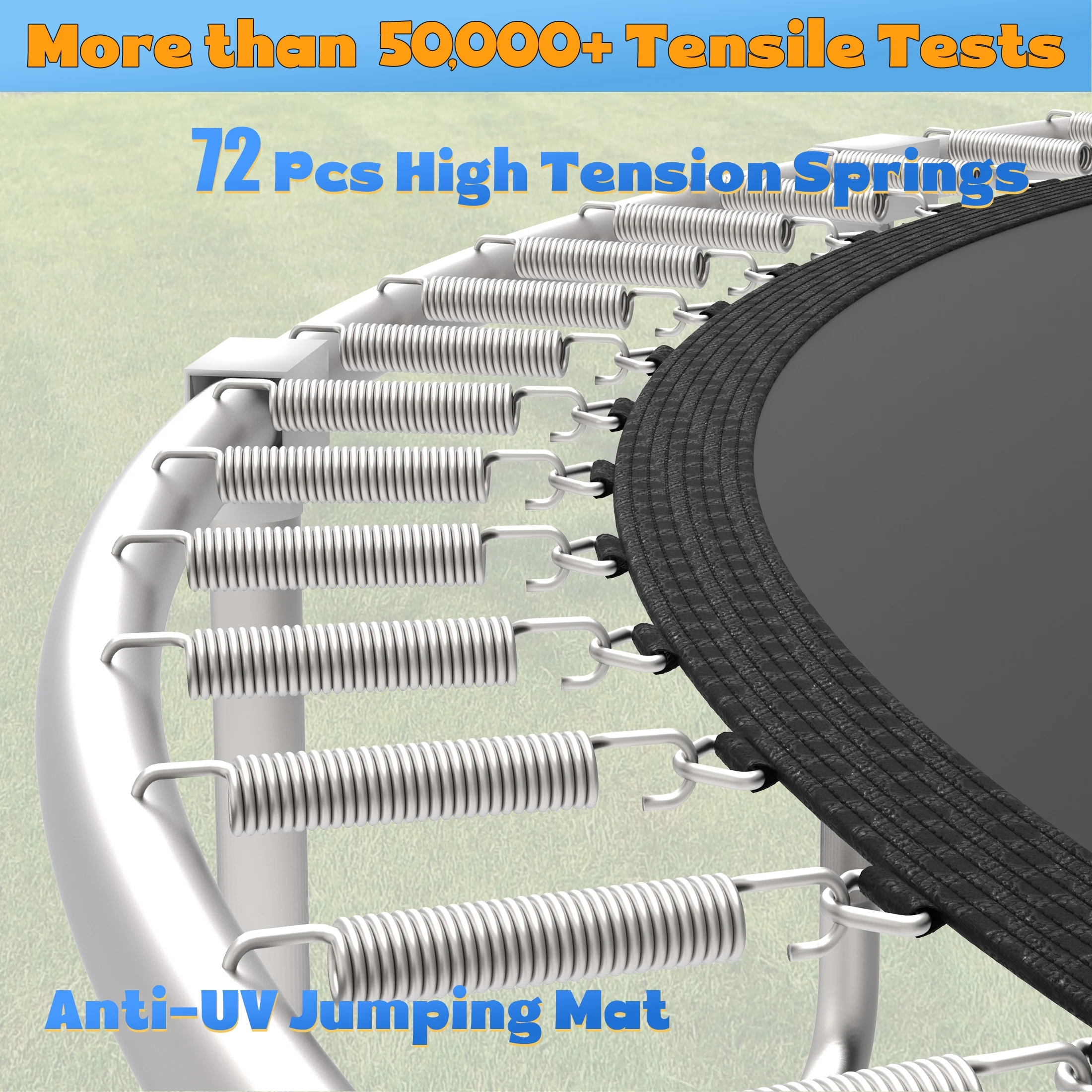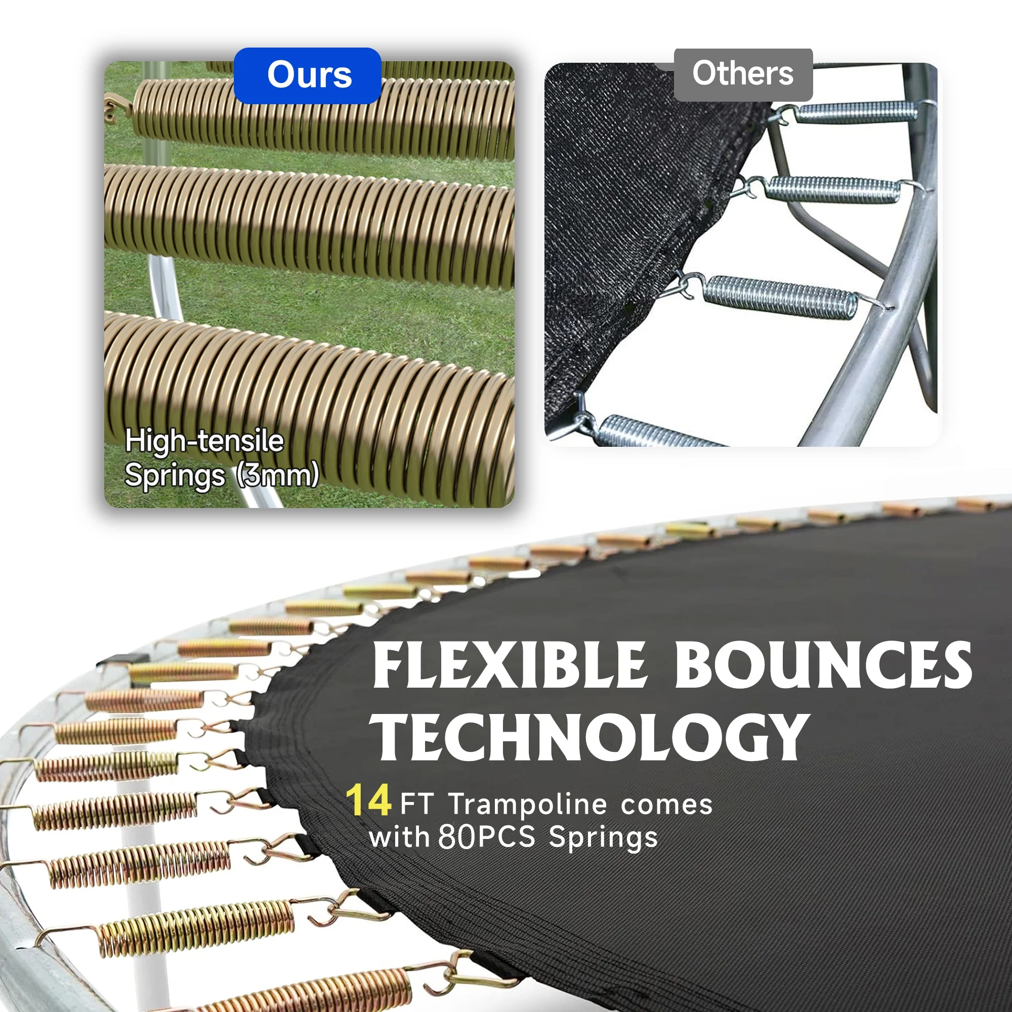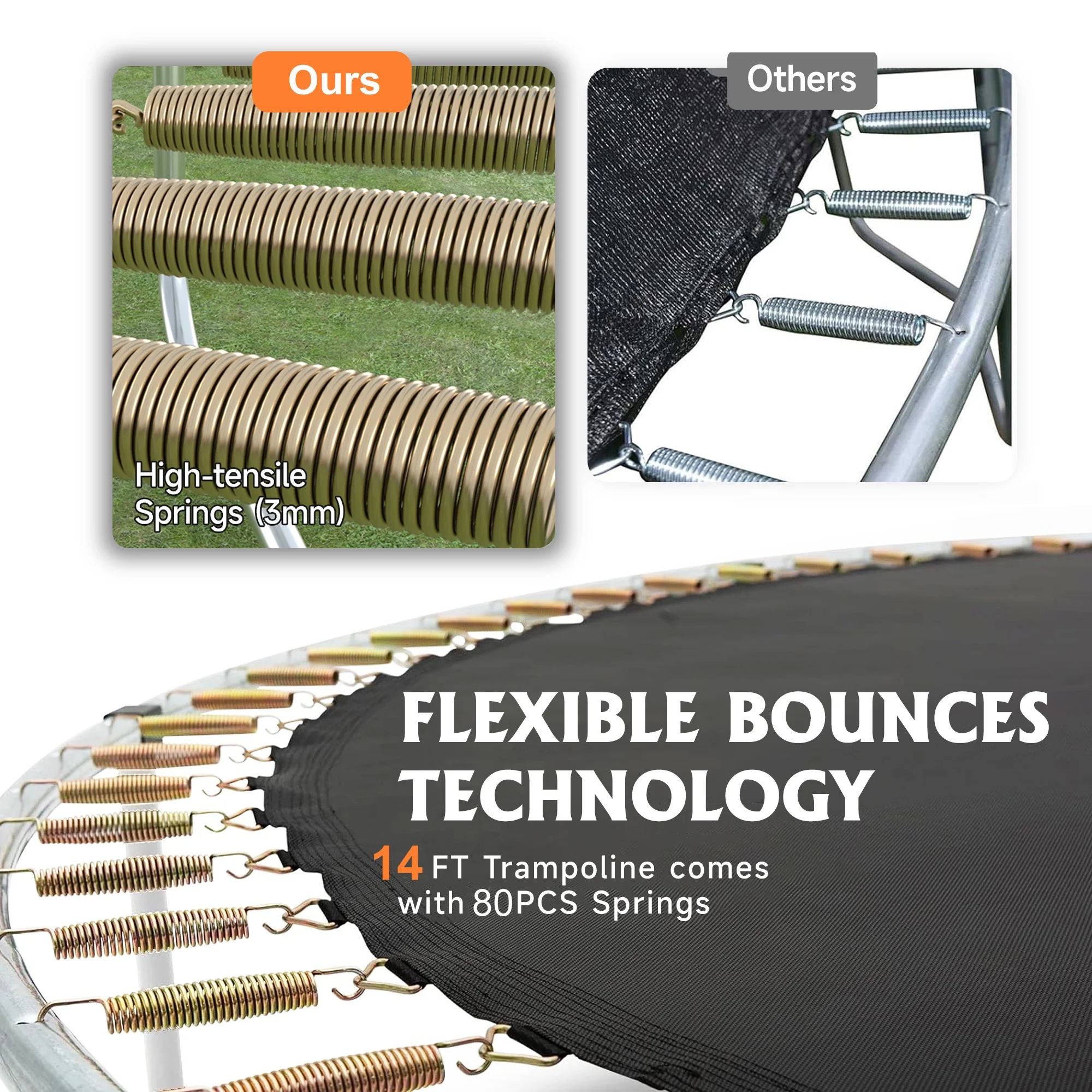 💪[Superb Bouncing Experience -80 Galvanized Steel Springs]: Our 14ft trampoline with basketball hoop is equipped with 80 galvanized steel springs, providing your child with an exceptional bouncing experience. The springs are made of galvanized steel material, which not only provides excellent elasticity, but also has top-notch quality assurance. You can rest assured that your children can play on their own.