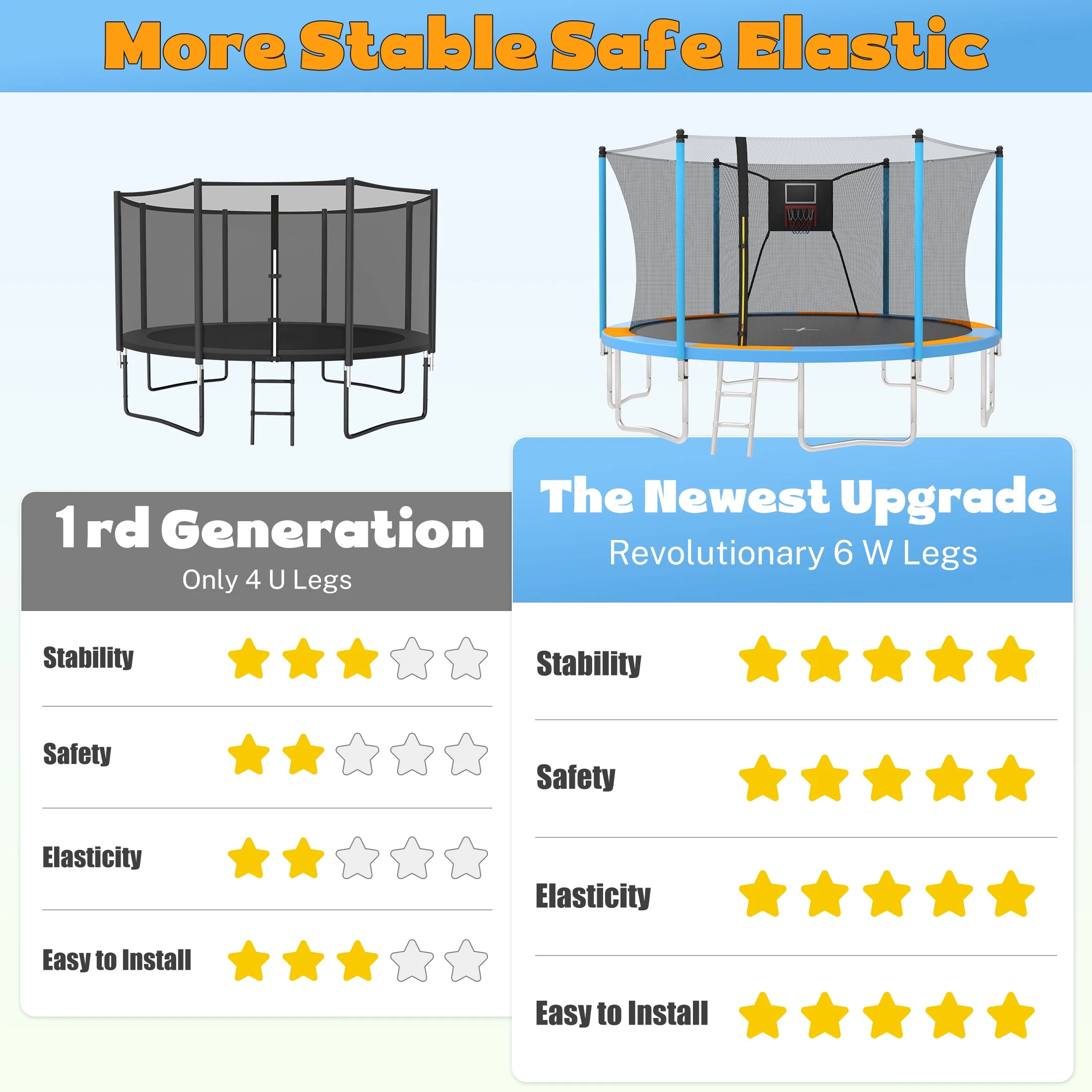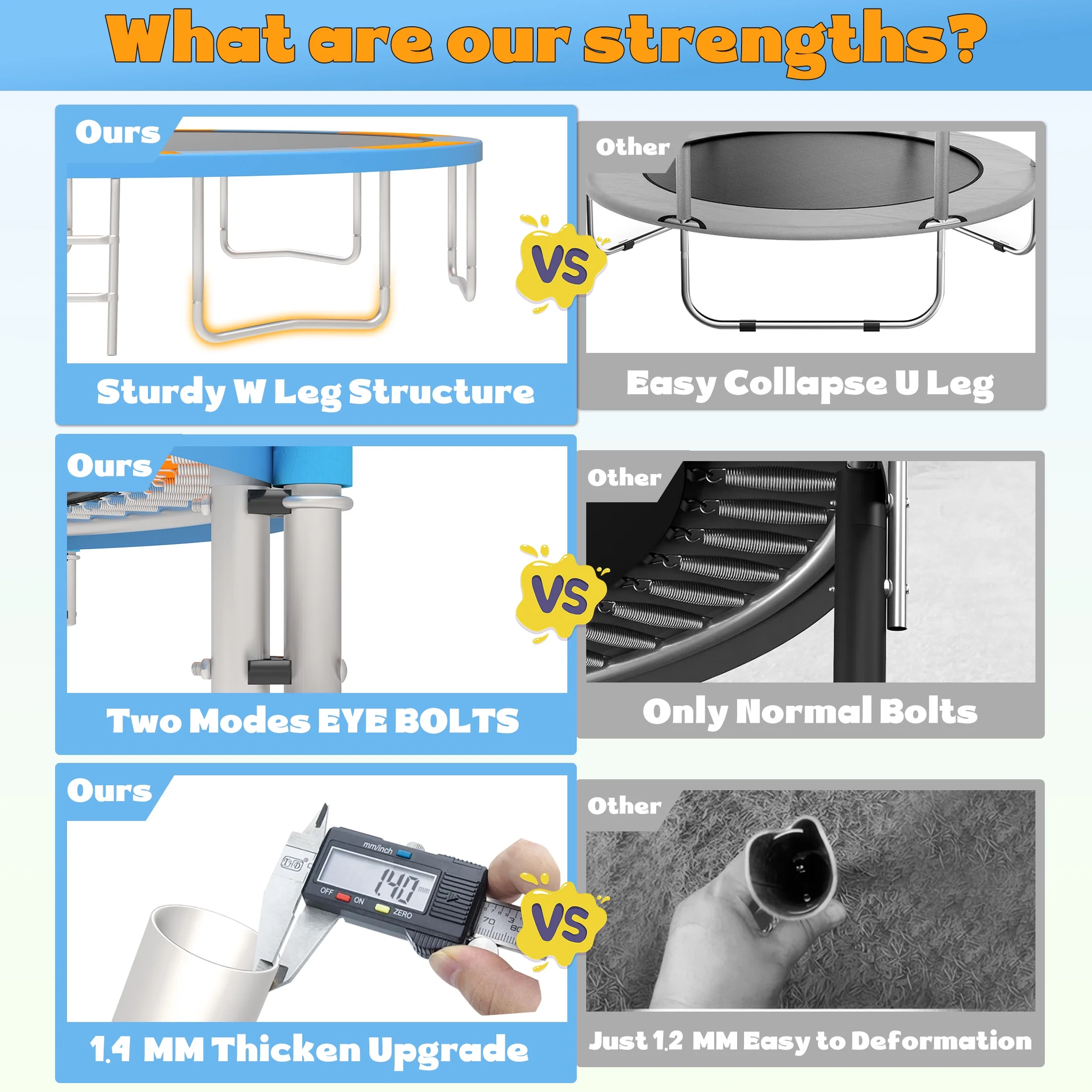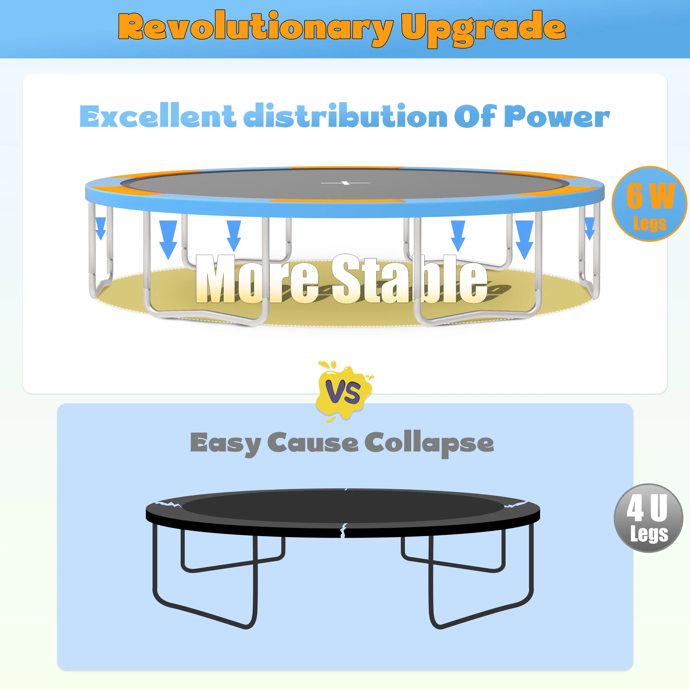 💯[5 W-shaped Legs]: Safety is our top priority. W-shaped legs have higher stability compared to other legs, and other trampolines of the same size generally only have 4 W-shaped legs, so our design with 5 W-shaped legs will have higher safety.