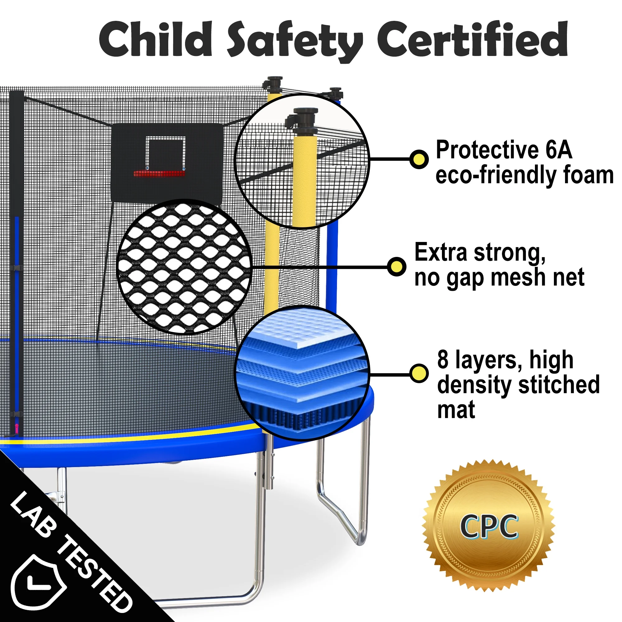 SHINPT 14ft outdoor trampoline is equipped with a safety net and a soft rebound ladder for outdoor use. There are 5 high safety fence poles and thick specification galvanized anti rust steel structure. 5 W-shaped legs ensure stability. We have conducted comprehensive testing on the chemical composition of the materials and the structural design of the products to ensure their safety. Our safety net: PE material, sun protection, and abrasion resistance have passed the standard 500 hour UV test, effectively improving the safety of trampoline performance.