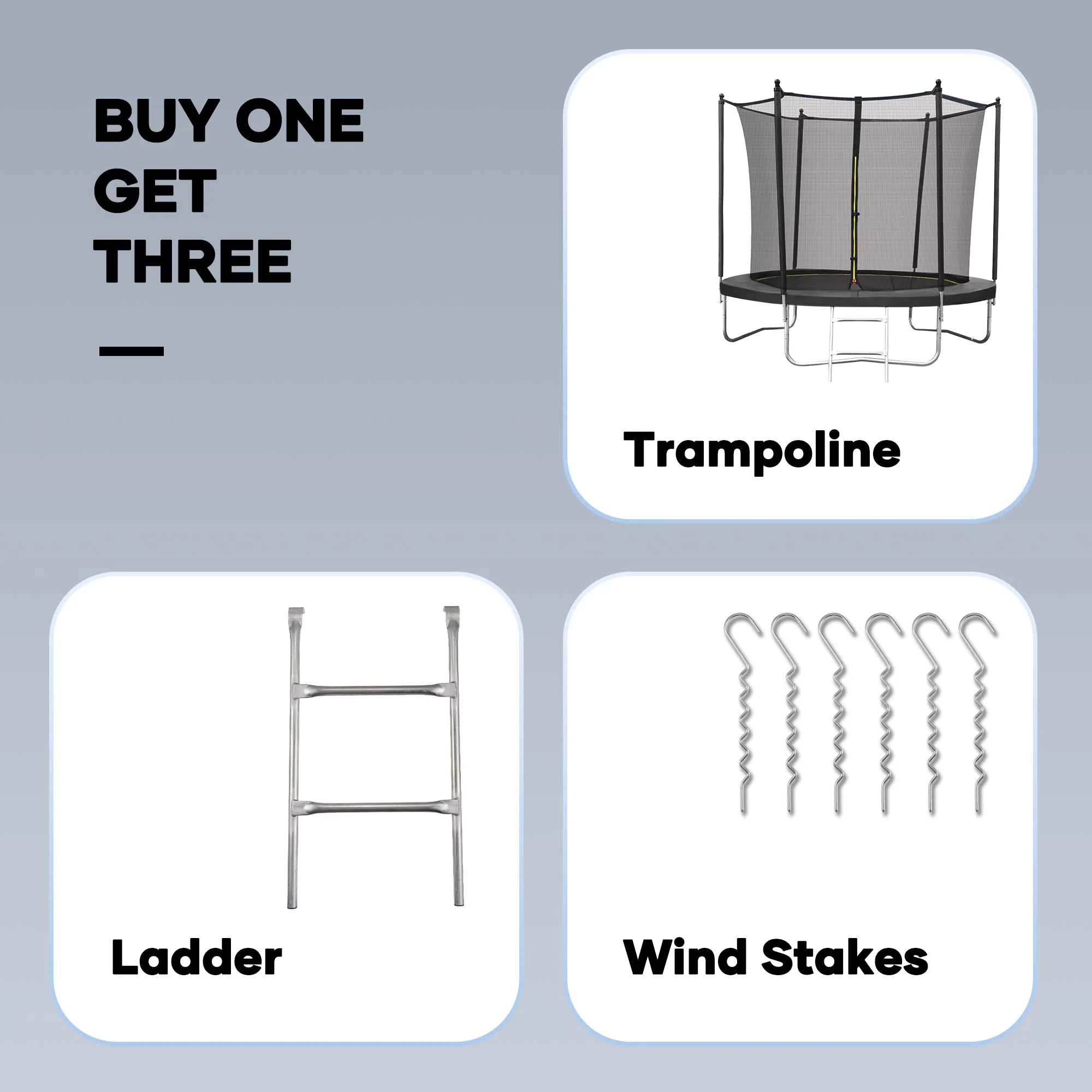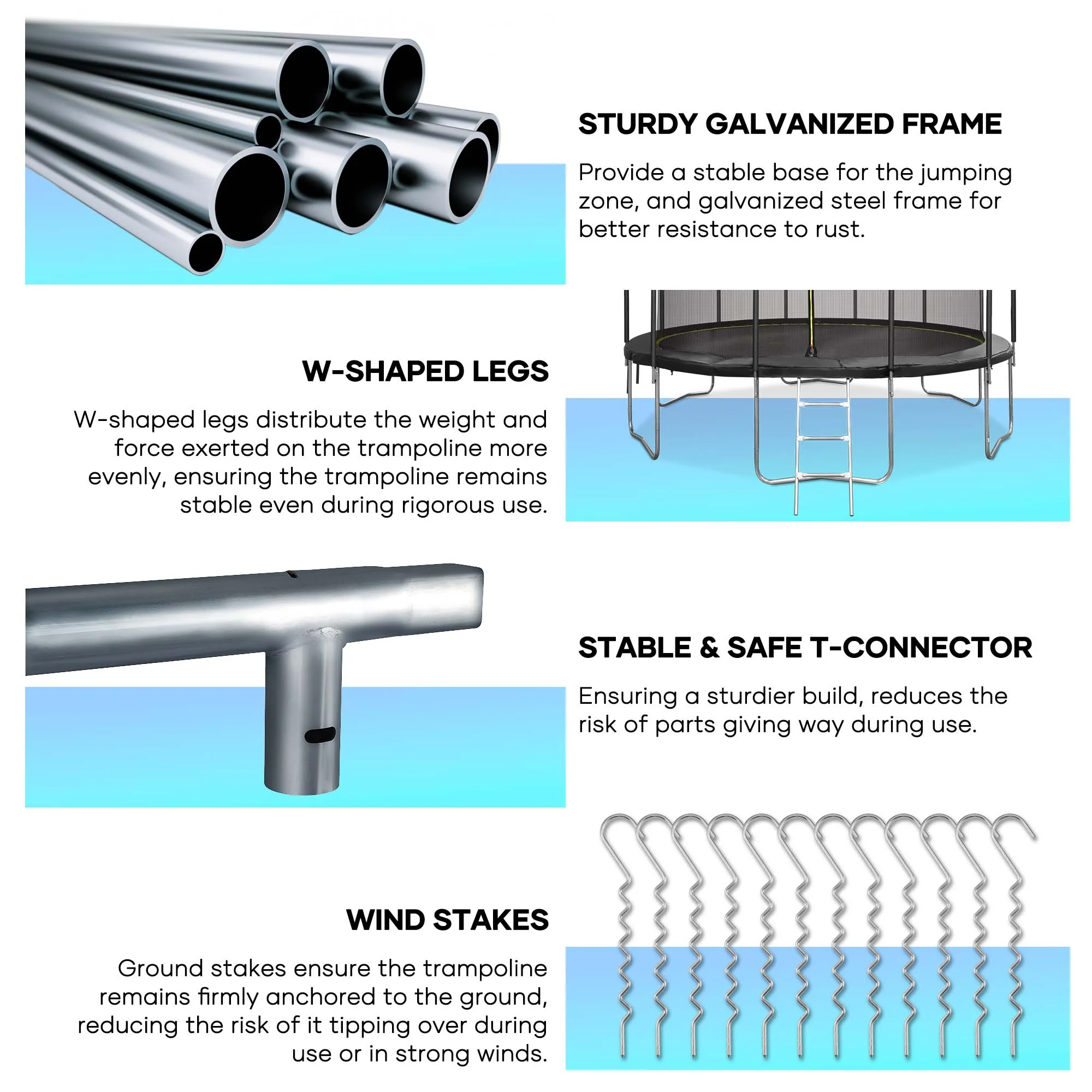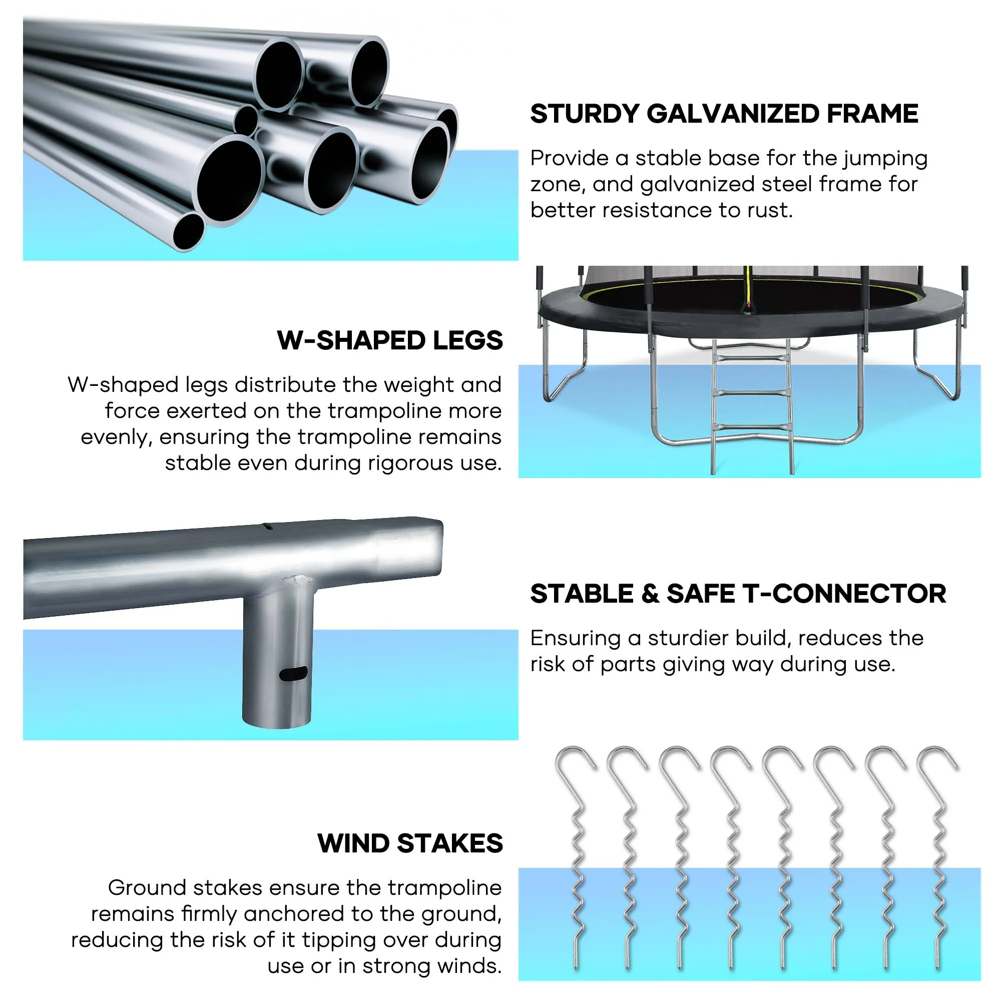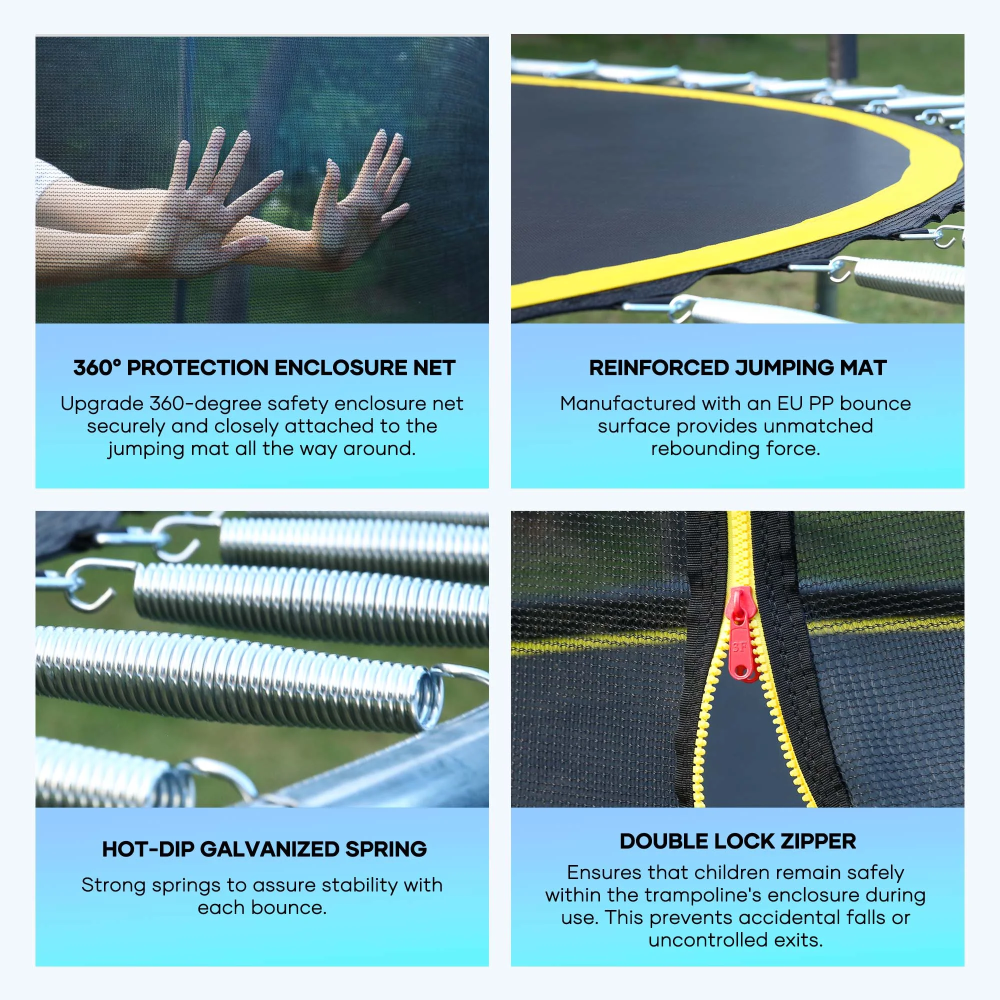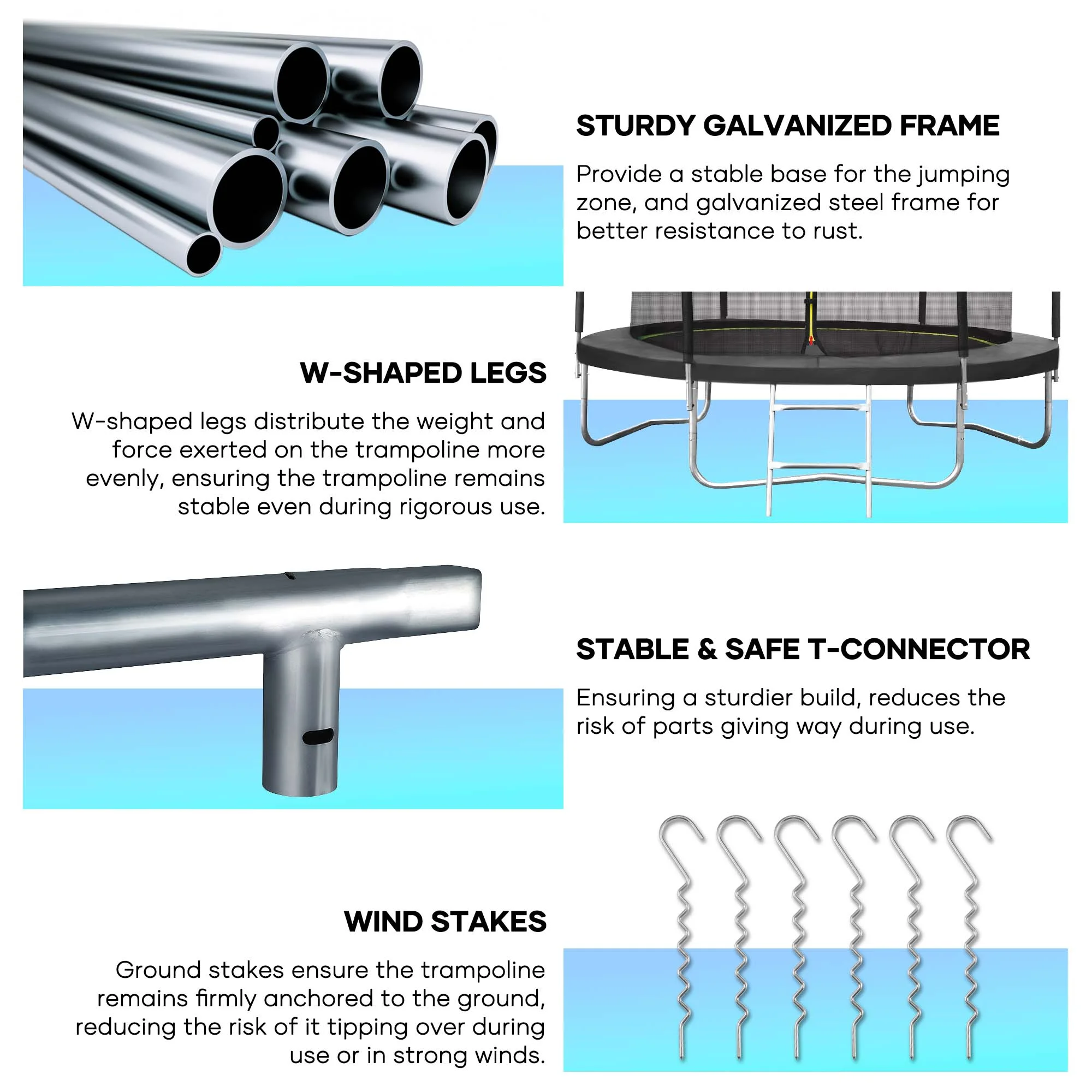 Suitable for backyard outdoor; heavy-duty jumping mat and springs; safety fence; 6 U-shaped steel legs for more stability; 360° Safety protection; extra wind stakes for more stability