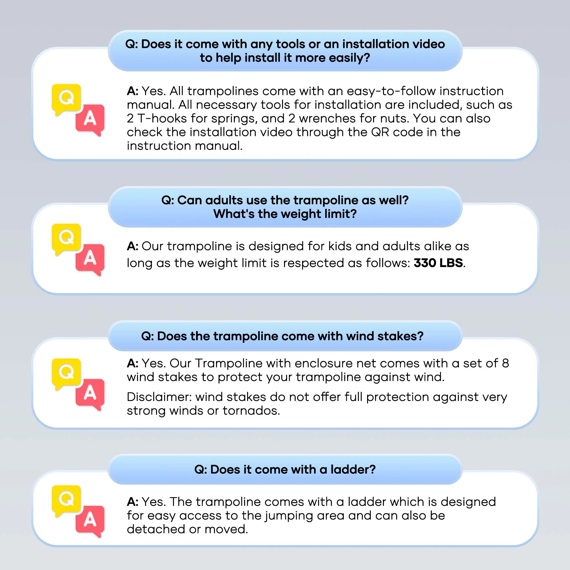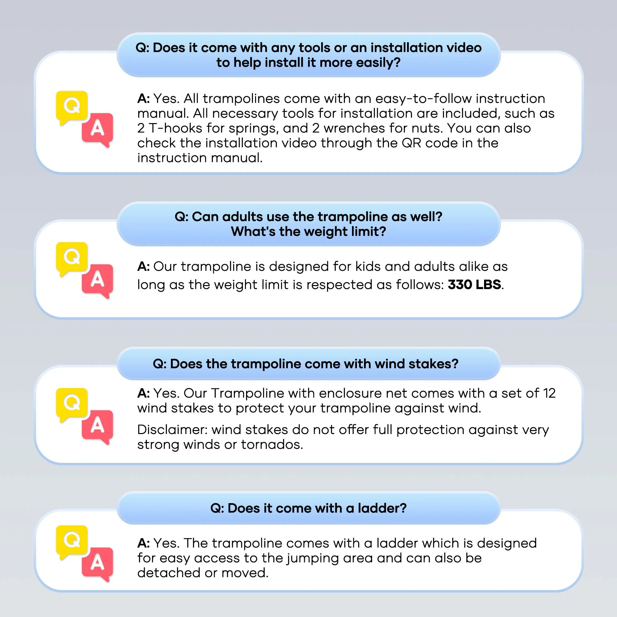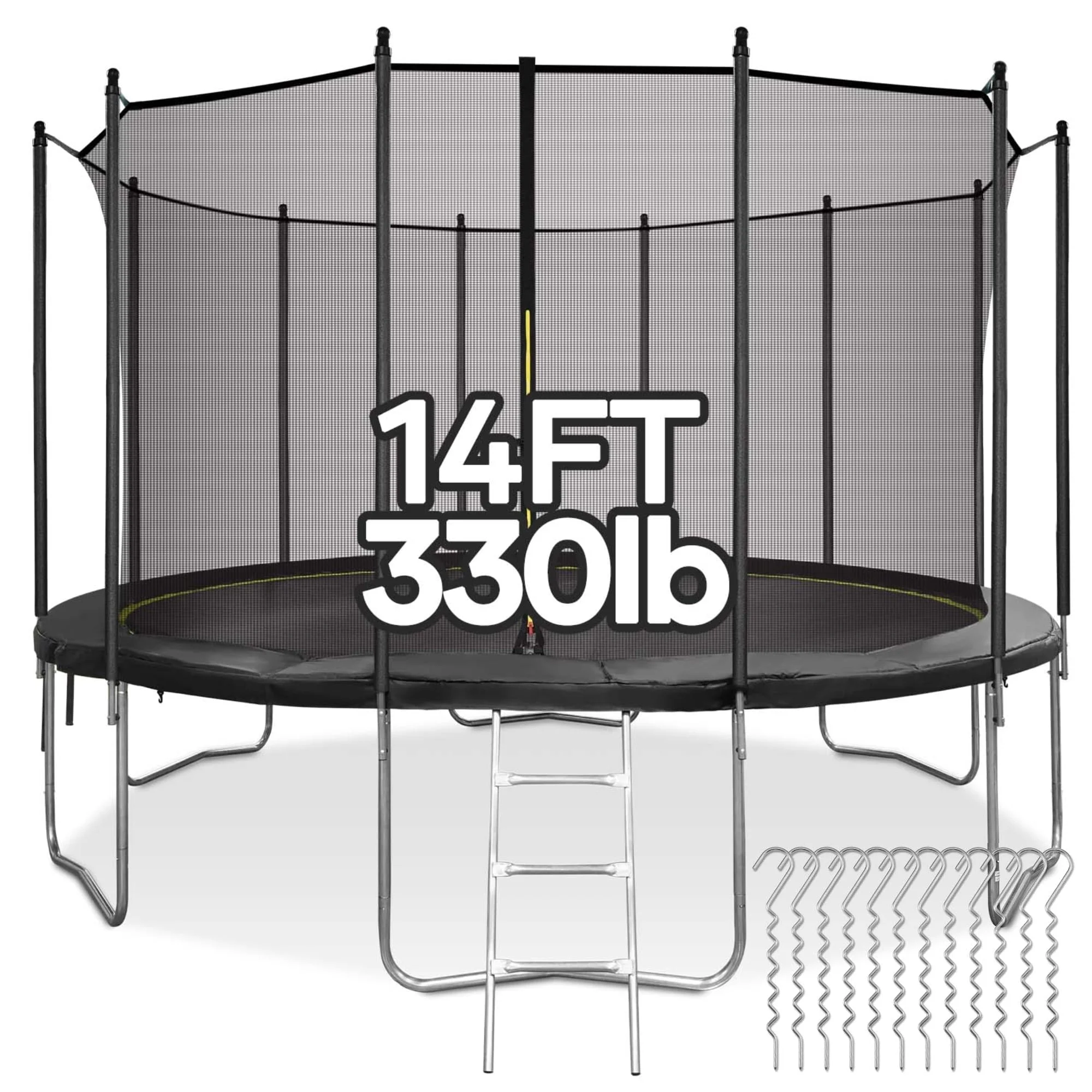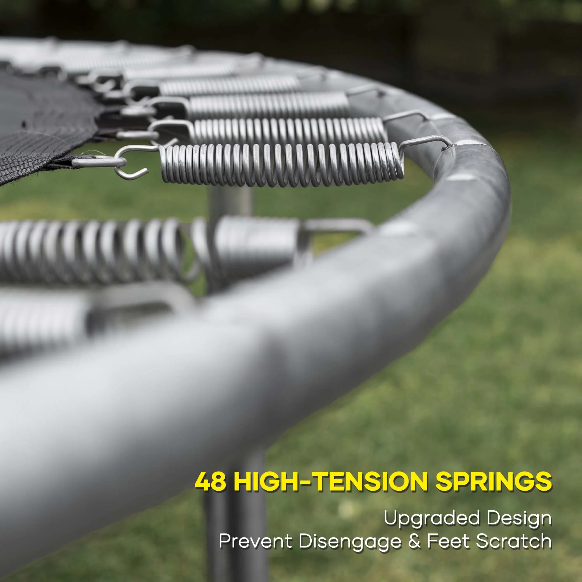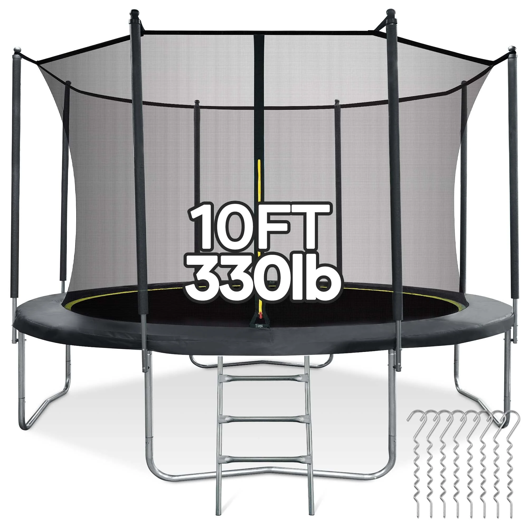 Suitable for backyard outdoor; heavy-duty jumping mat and springs; safety fence; 6 U-shaped steel legs for more stability; 360° Safety protection; extra wind stakes for more stability