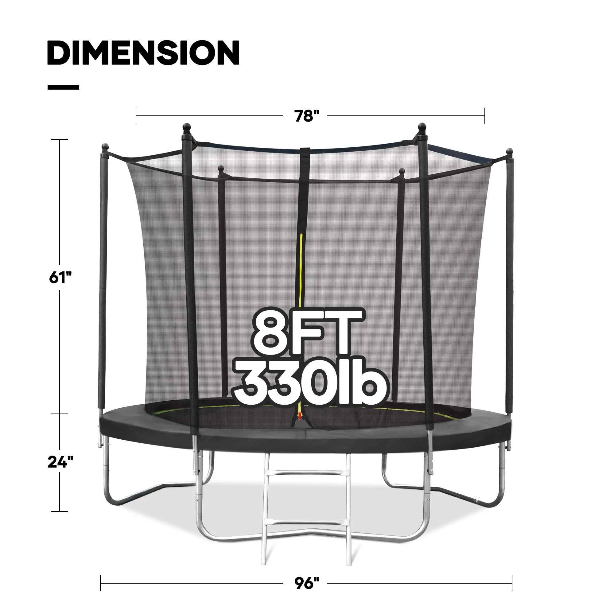 - Provide a full range of accessories, including steel frames, fence nets, spring cover pads, jumping mats, ladders, and all installation tools. The parts of the 8-foot trampoline are clearly listed and numbered in the instructions, and the average assembly time is only 1 hour for 2 people, so you can quickly build your child's play area.