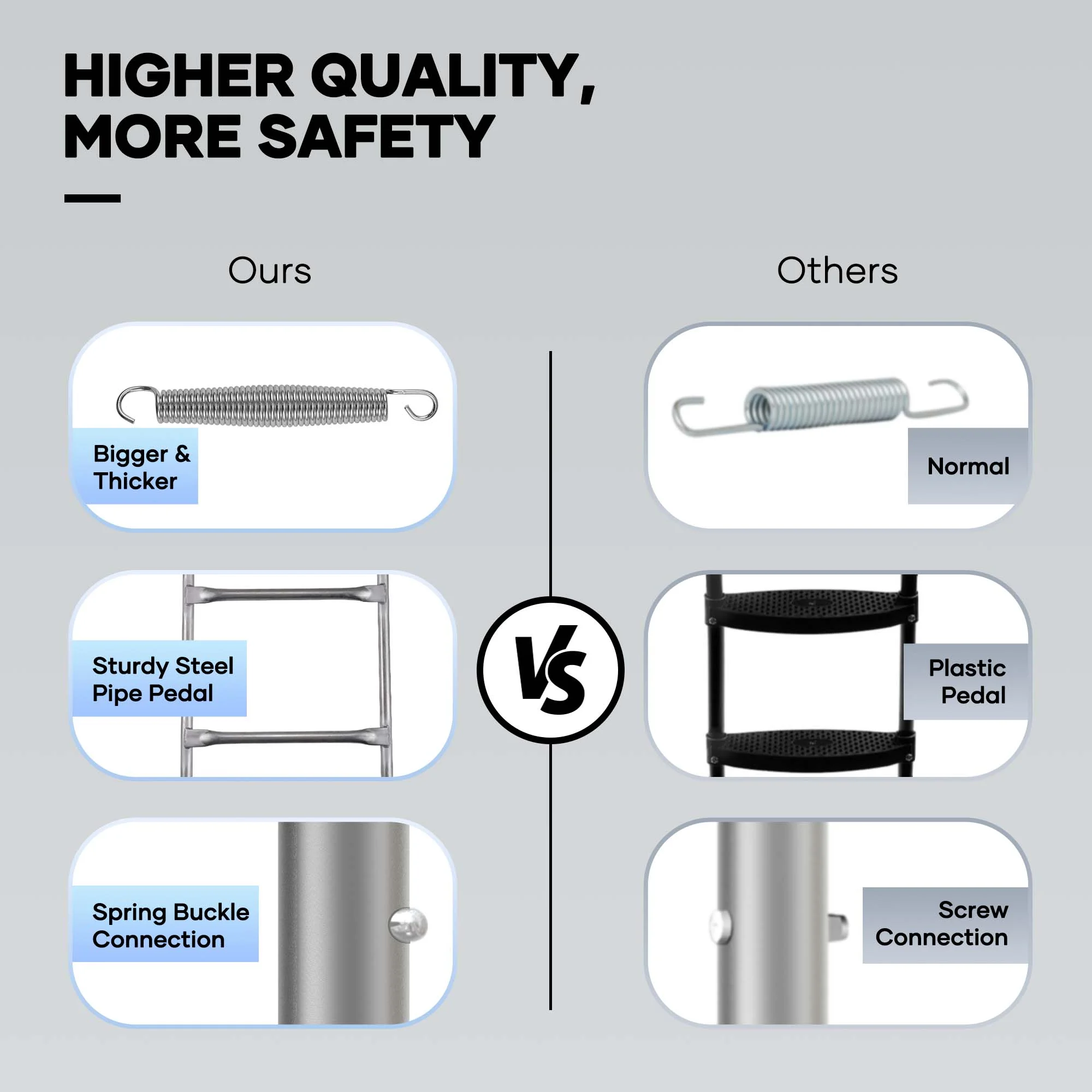 - The use of 3 U-shaped steel legs as the main support not only improves the load-bearing capacity of the trampoline but also makes it more stable when children jump. Each welding point is strictly quality-controlled to ensure durability and safety.