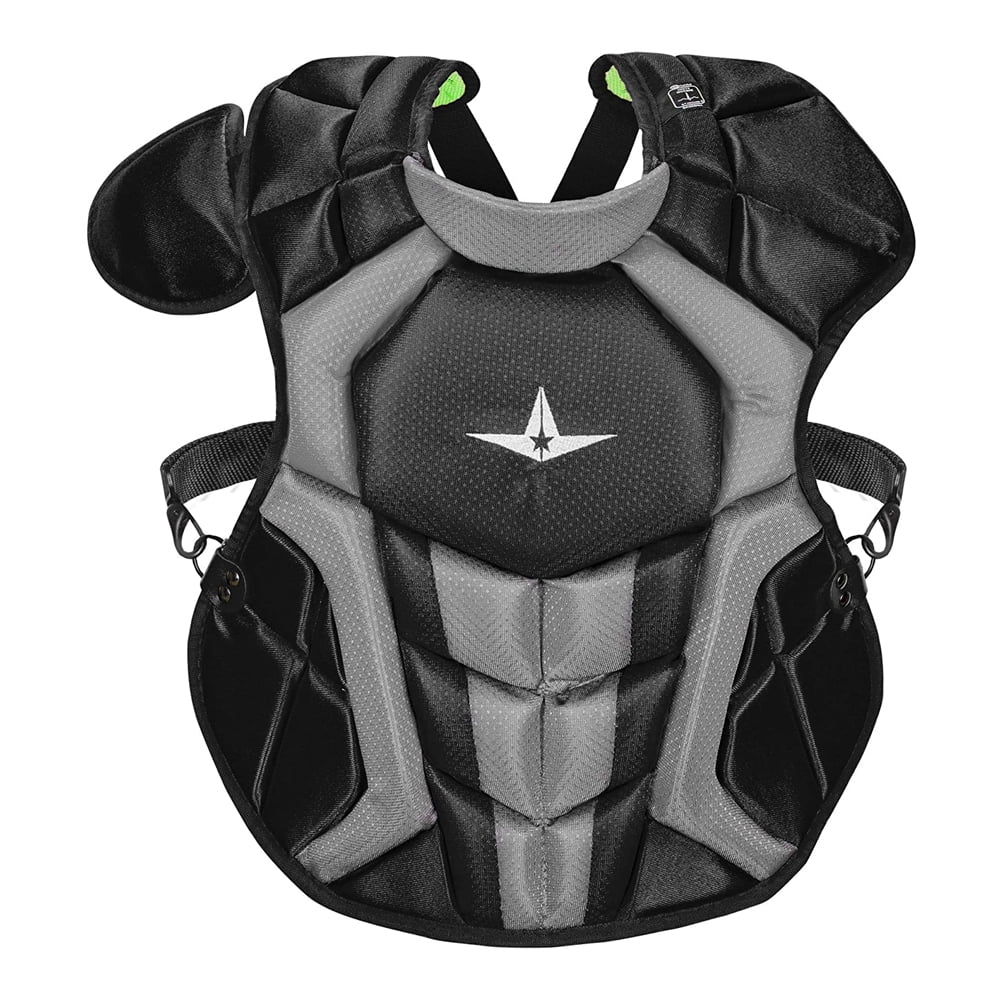 - Chest protector has wedged abs, moldable PE plates, and vented back for improved blocking and ball control; Measures 15.5 inches from clavicle to naval