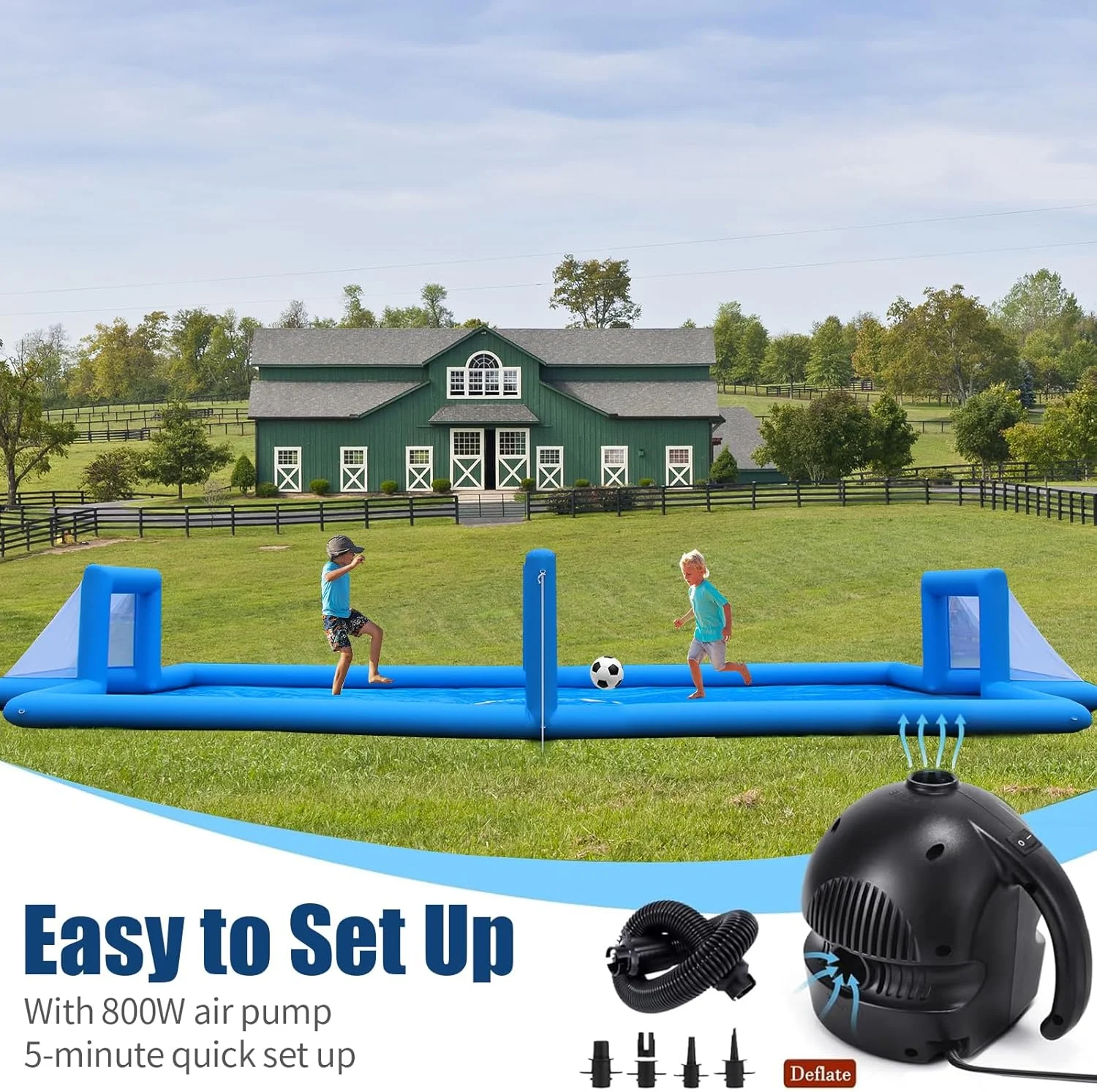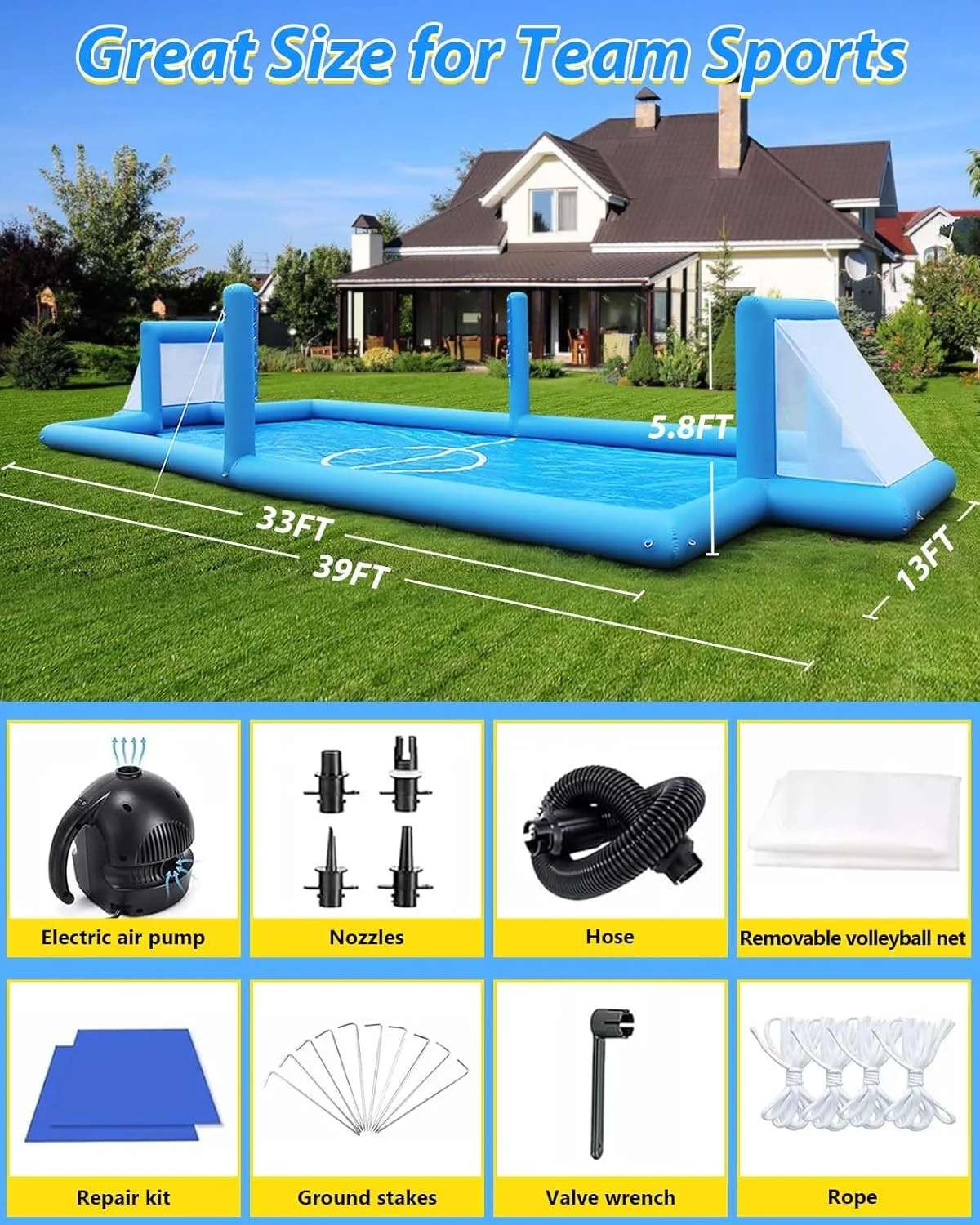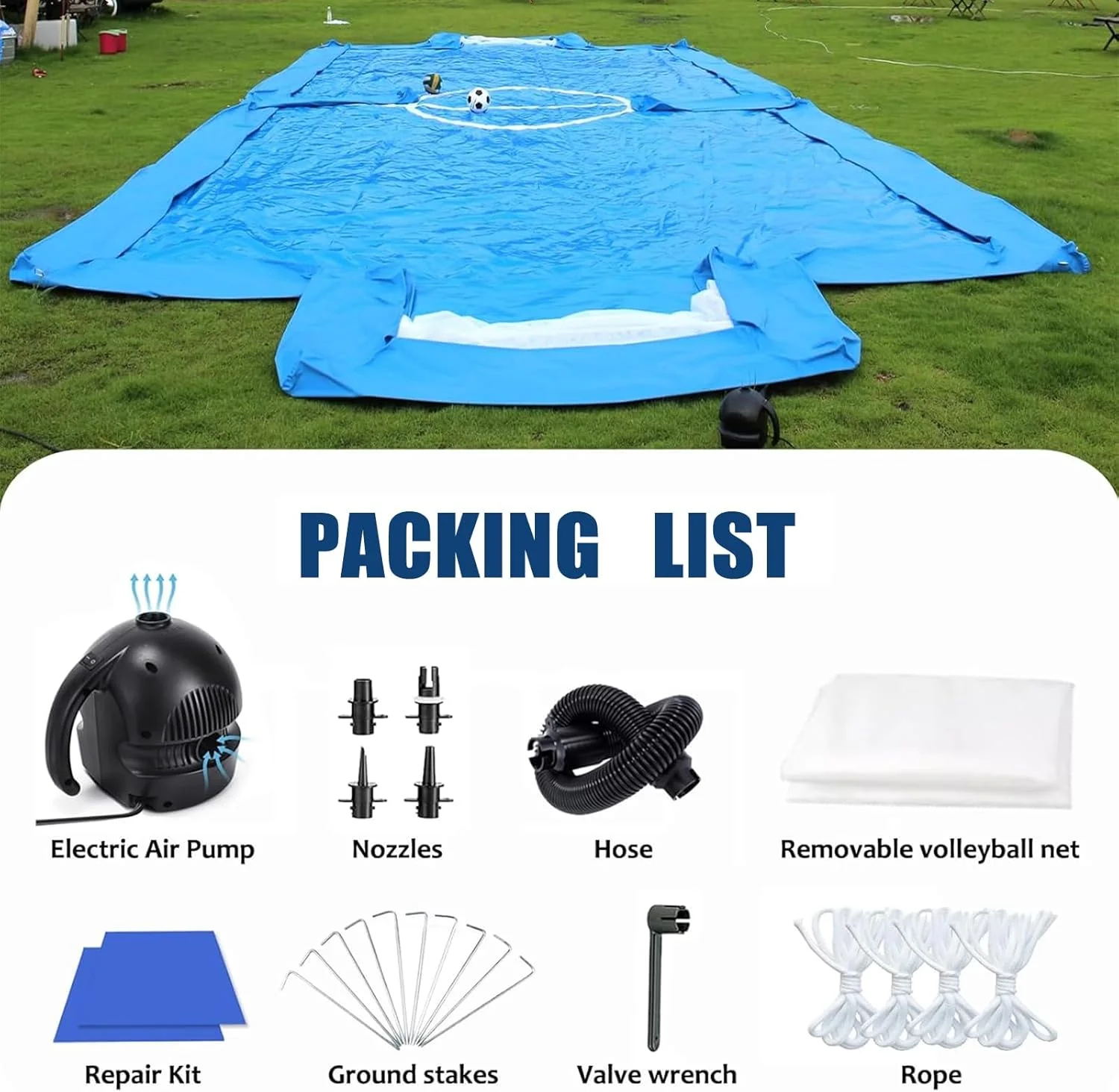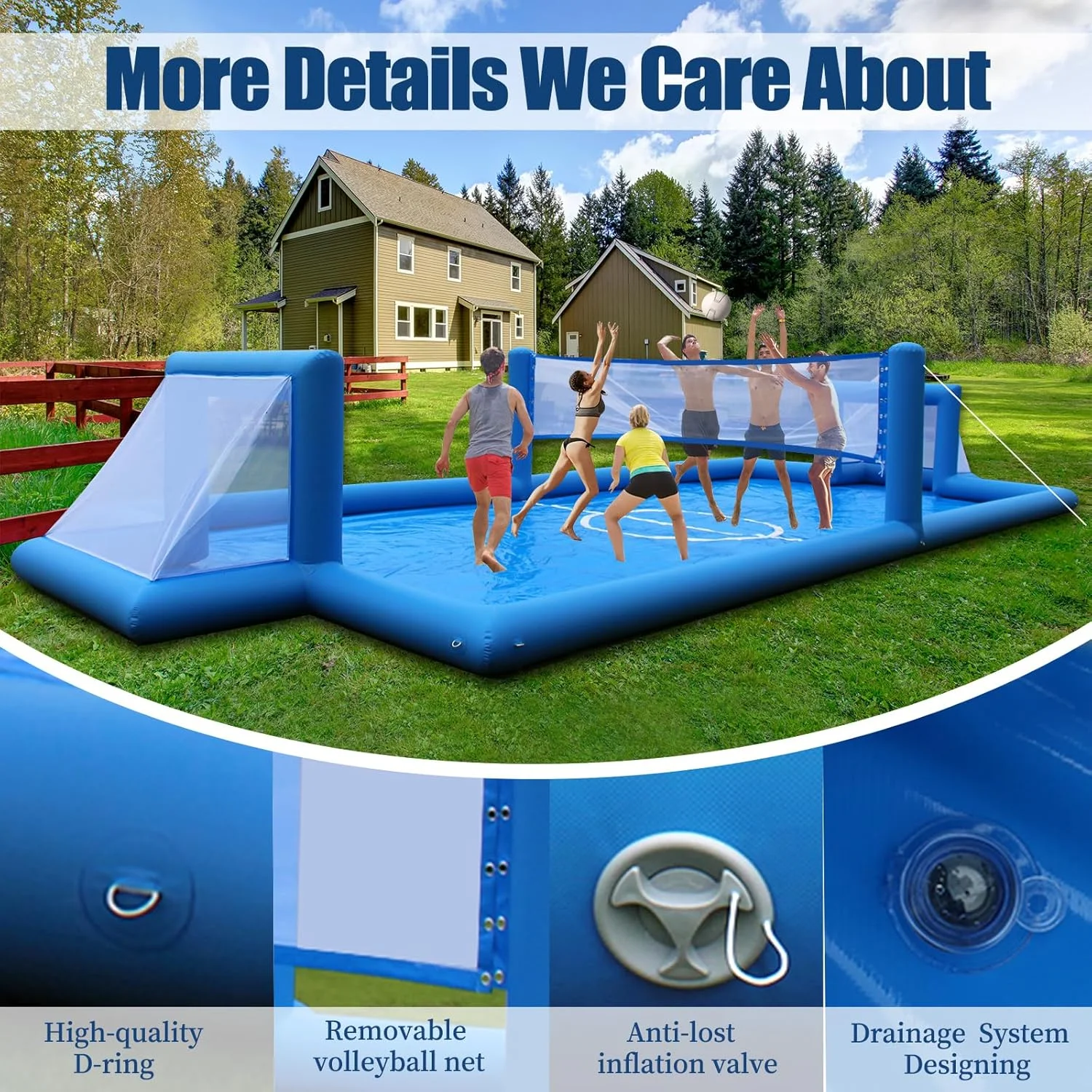 - PACKAGE INCLUDES - This set includes a large inflatable volleyball football court + volleyball net + 1pc air pump(800W) + Ground stakes + PVC repair cloth(Volleyballs NOT include). So it is convenient for multiple people to play football together! or playing volleyball on the water, your children will also be able to quickly learn to swim. We have a variety of colors and styles, you can contact us if you need.