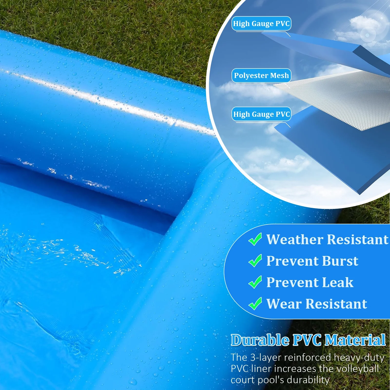 - HIGH QUALITY MATERIAL - The material of inflatable volleyball pool court is high-quality PVC tarpaulin, with better air-tightness and durability since reinforcement whose material is all seams. It's extremely safe when you using it because this air volleyball court is leak-free and it is no smell because high-grade material.So you can safely play with your children!