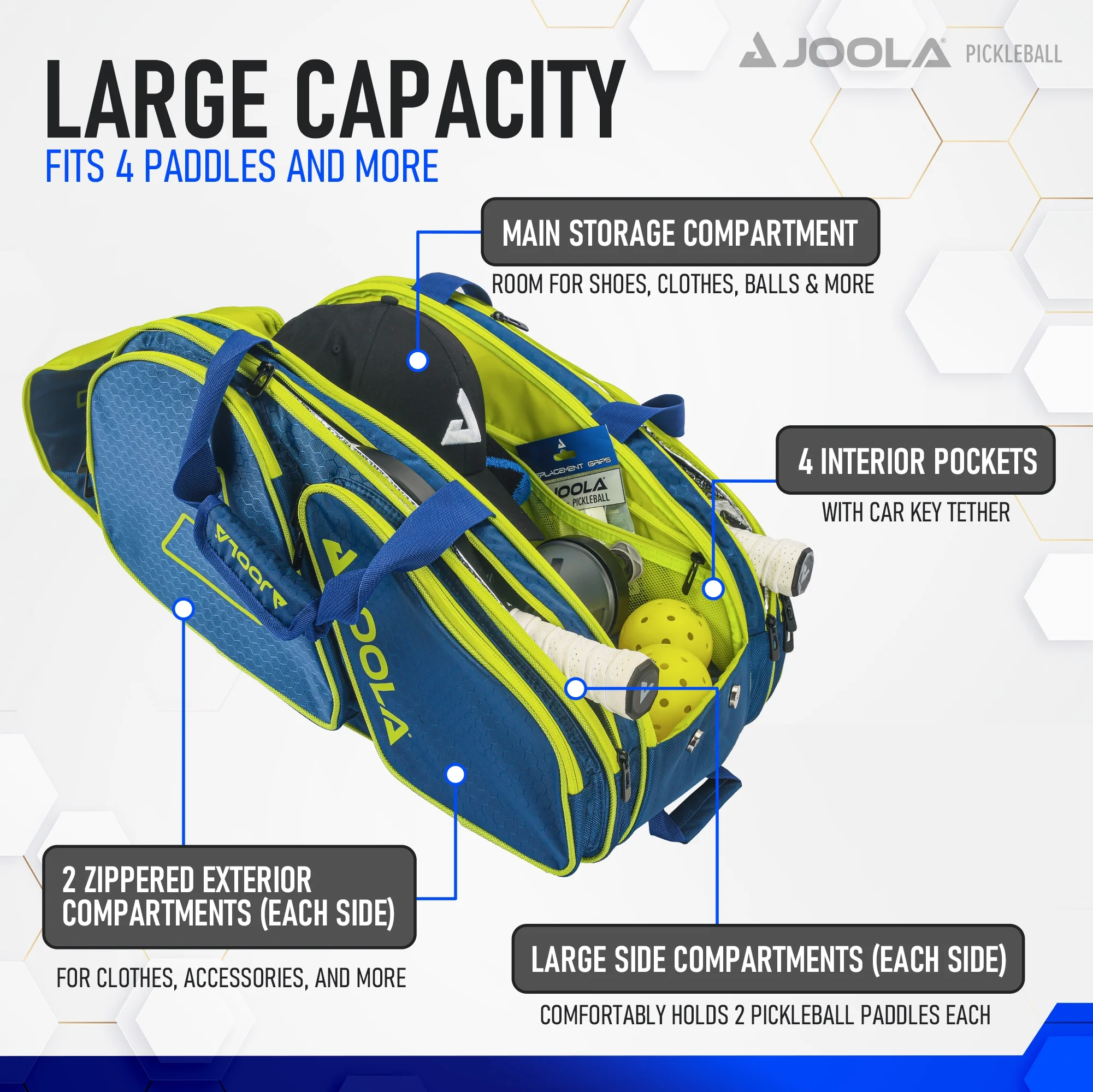 - A PLACE & SPACE FOR EVERYTHING: JOOLA Backpack features 8 exterior zippered compartments & 4 interior pockets plus a car key tether. Keep your important pickleball equipment with you as you travel or pack heavy for a full day at the courts or during tournaments.