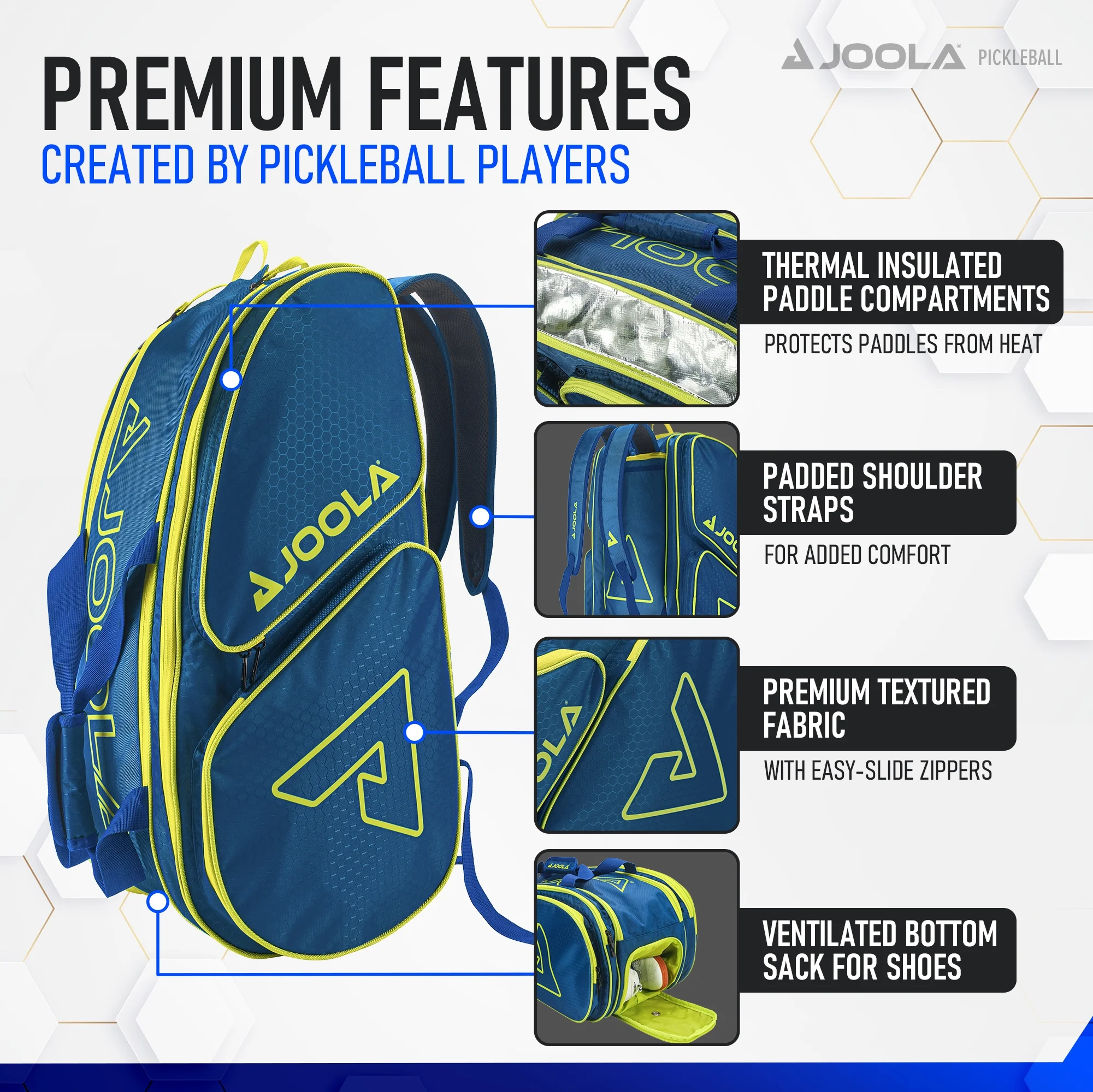 - CREATED BY PICKLEBALL PLAYERS: Extra details that only true players would think of. Thermal insulated racquet compartments protect from extreme heat, ventilated bottom sack for shoes, sleeve for balls, fence hook, & soft lined pockets for valuables.