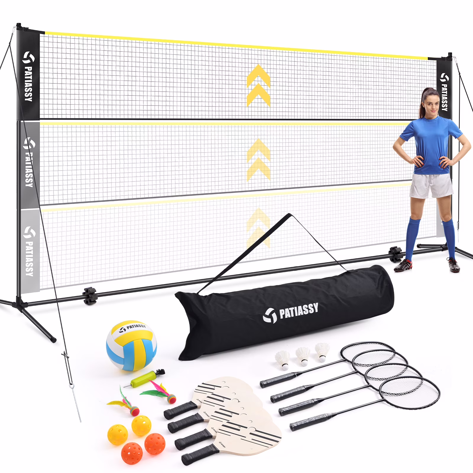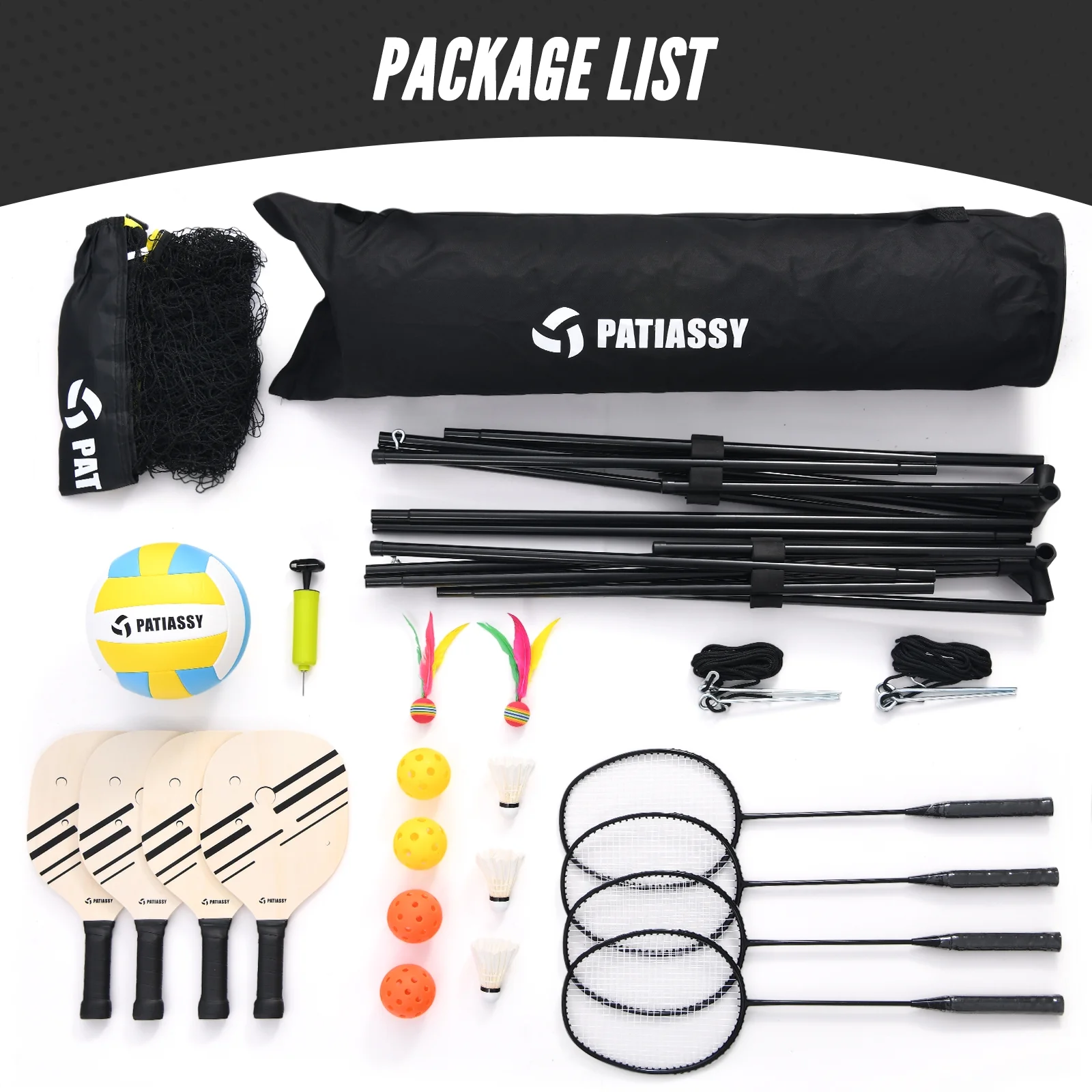 - 2-In-1 Set: A full set of badminton and volleyball equipment includes 17ft net, 4 aluminum iron badminton rackets, 3 goose feather shuttlecocks, 4 pickleball paddles, a volleyball, a hand pump and 600D Oxford carrying bag for easy storage and portability