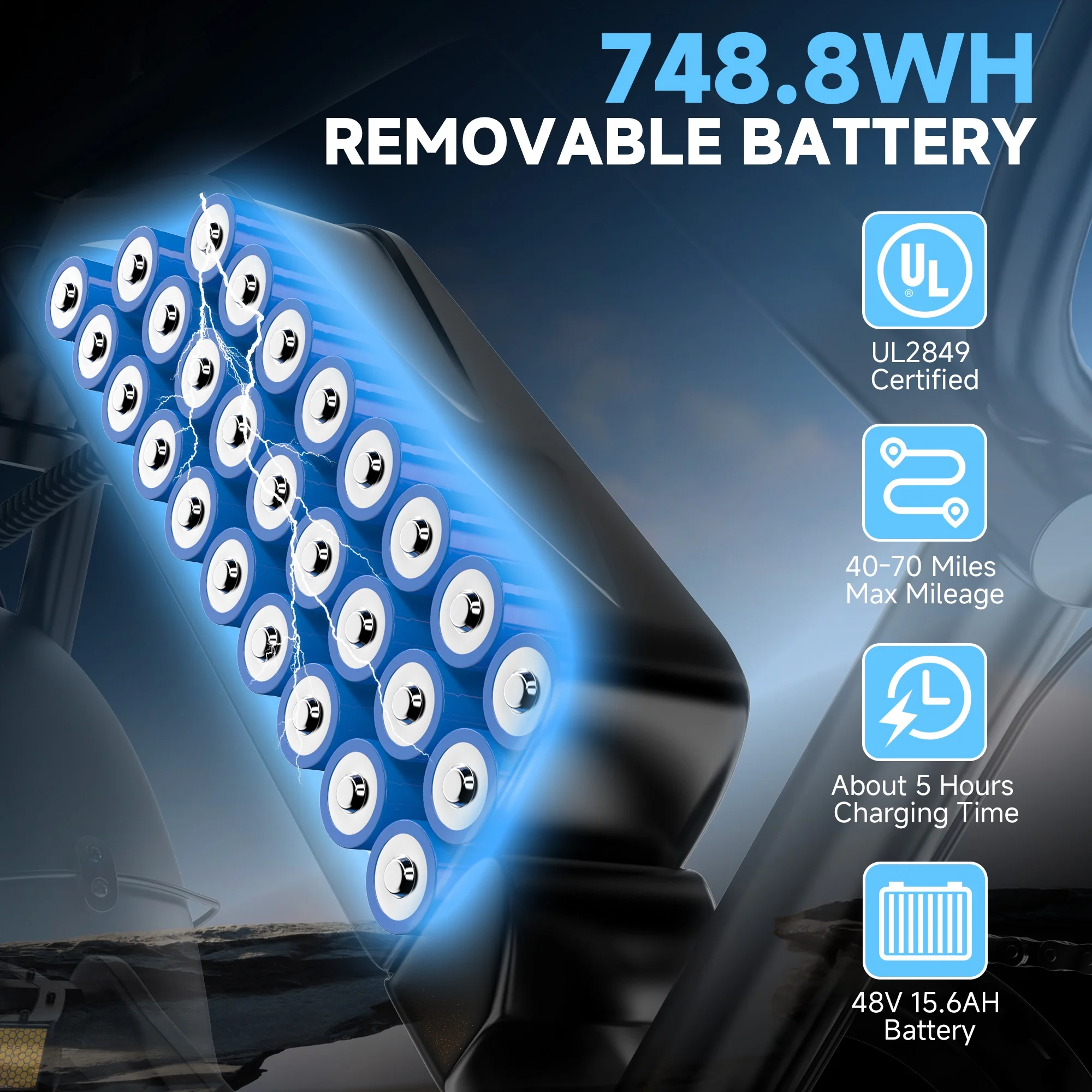 - Battery: 48V 15.6Ah Lithium-ion battery