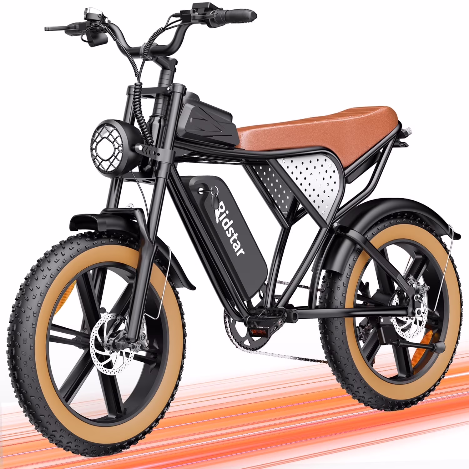 Fat Tires & Dual Hydraulic Disc Brakes Equipped with 20"x4" puncture-resistant fat tires, this e-bike provides exceptional stability and traction on diverse terrains, including snow, sand, and rugged mountain trails. The dual hydraulic disc brakes deliver precise and powerful stopping control, even in wet conditions, ensuring your safety at all times. The bright LED headlight enhances visibility for nighttime rides.