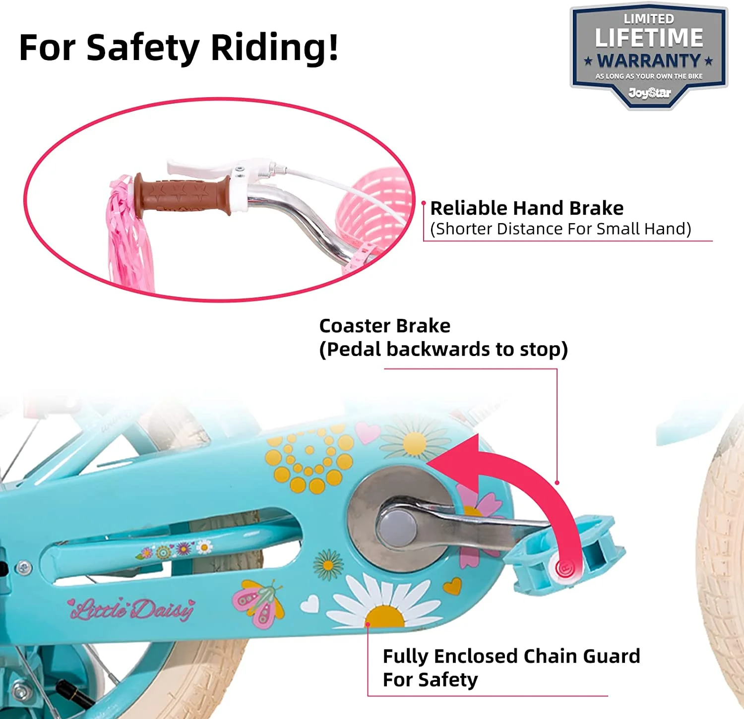 - The Front hand caliper Brake plus rear coaster/foot brake offer ample stopping power with more safety.