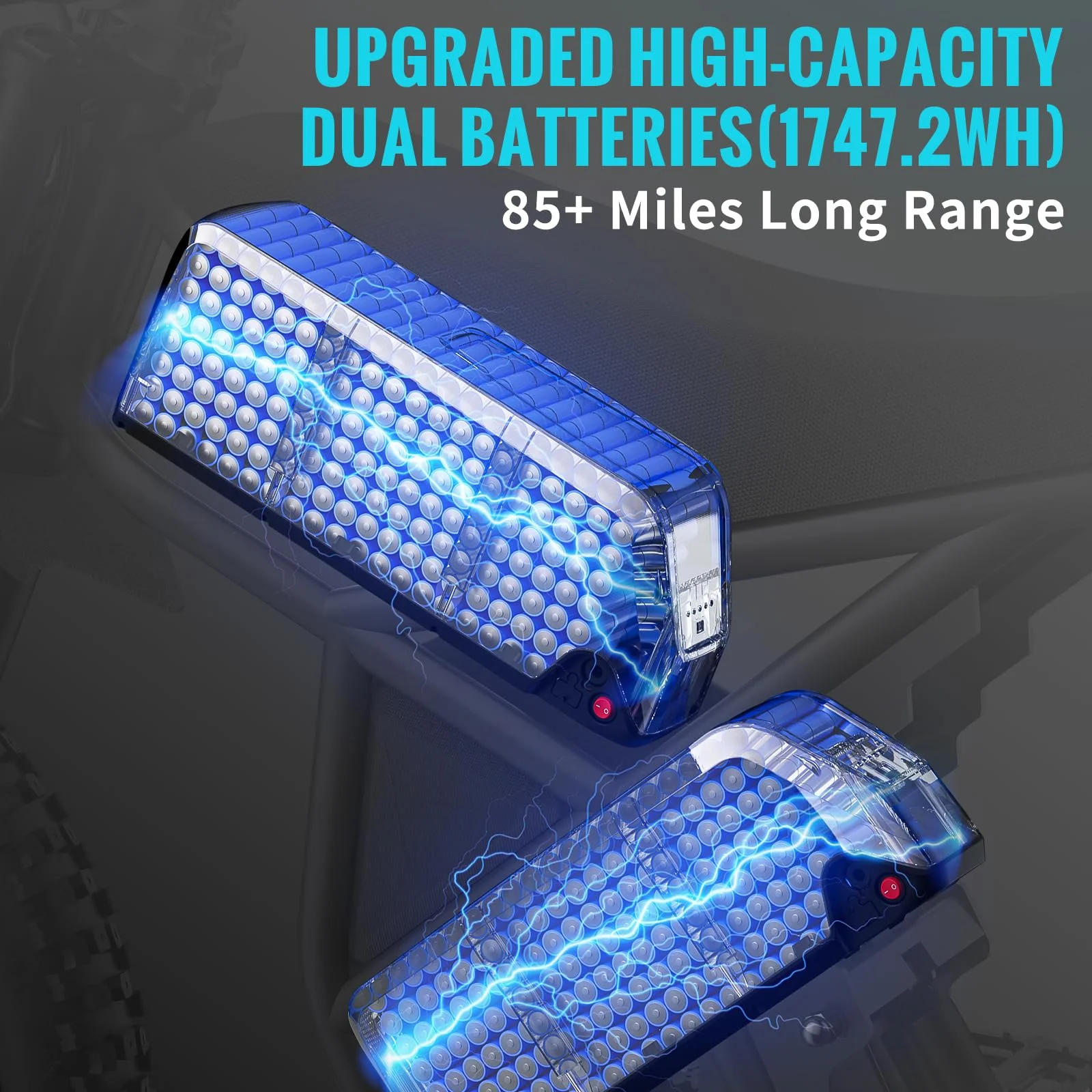 - 【Long-Lasting Dual Battery System】 The 1747Wh removable lithium battery delivers 85+ miles (throttle mode) or 155 miles (pedal assist). Two chargers cut recharge time to 9 hours, perfect for long off-road trips.