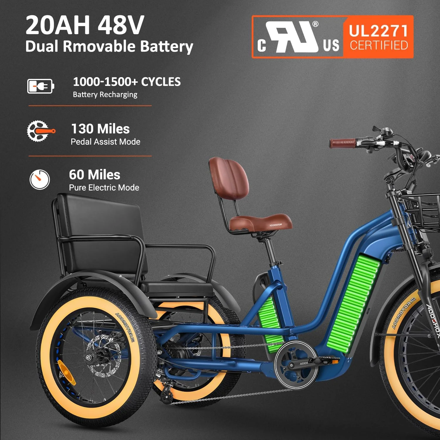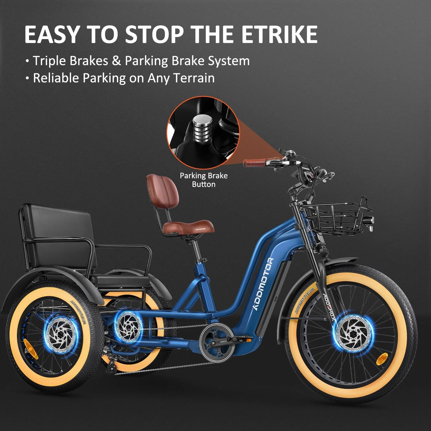 ADDMOTOR GREATTAN L Electric Trike for Adults, 750W Rear Motor Electric Trike with Passenger Seat, 65/130mi 20/40AH 48V, Dual - Battery System 2 Seater Electric Tricycle, Parking Brake, Differential