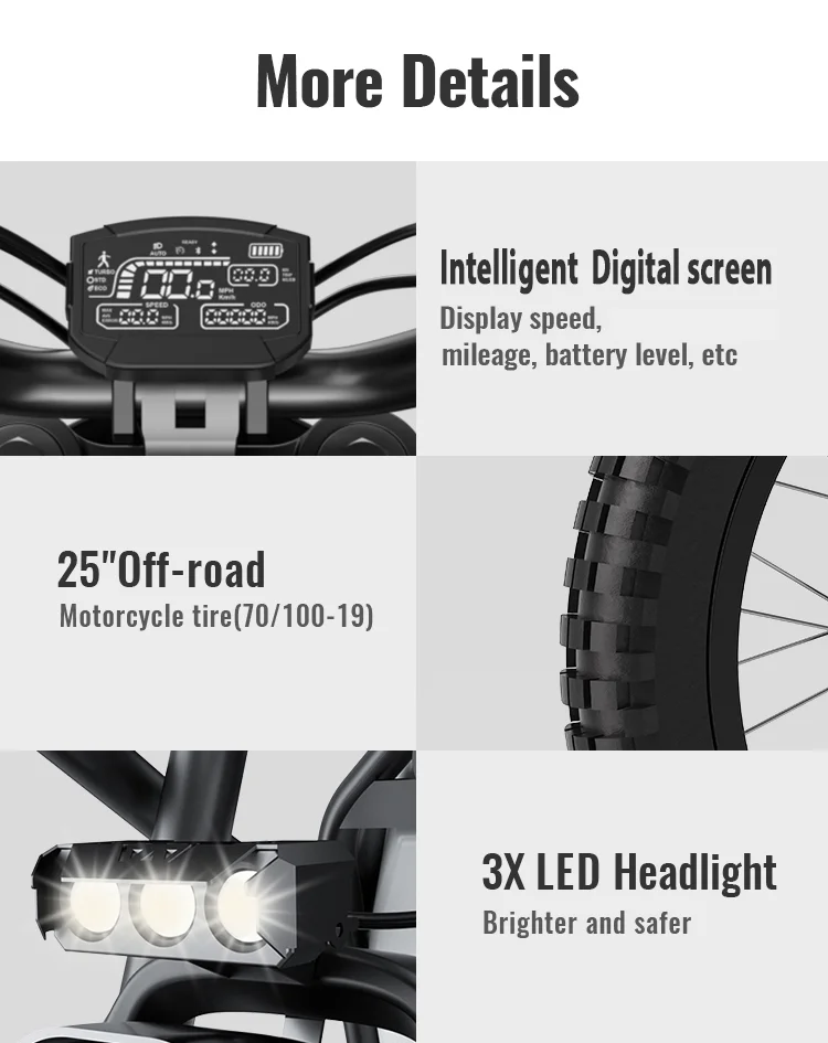 - 【Comfortable and durable electric bicycle】 the electric bicycle adopts 6-level dual hydraulic full suspension design which provides the best impact absorption effect, with 1 rear shock absorber and 2 front forks; these advanced suspension systems absorb shocks and bumps. The 3000 ton forged carbon steel alloy frame offers extreme strength and hardness; 25-inch all-terrain motorcycle tyres can support up to 300 pounds, providing superior grip and stability on rough surfaces.
