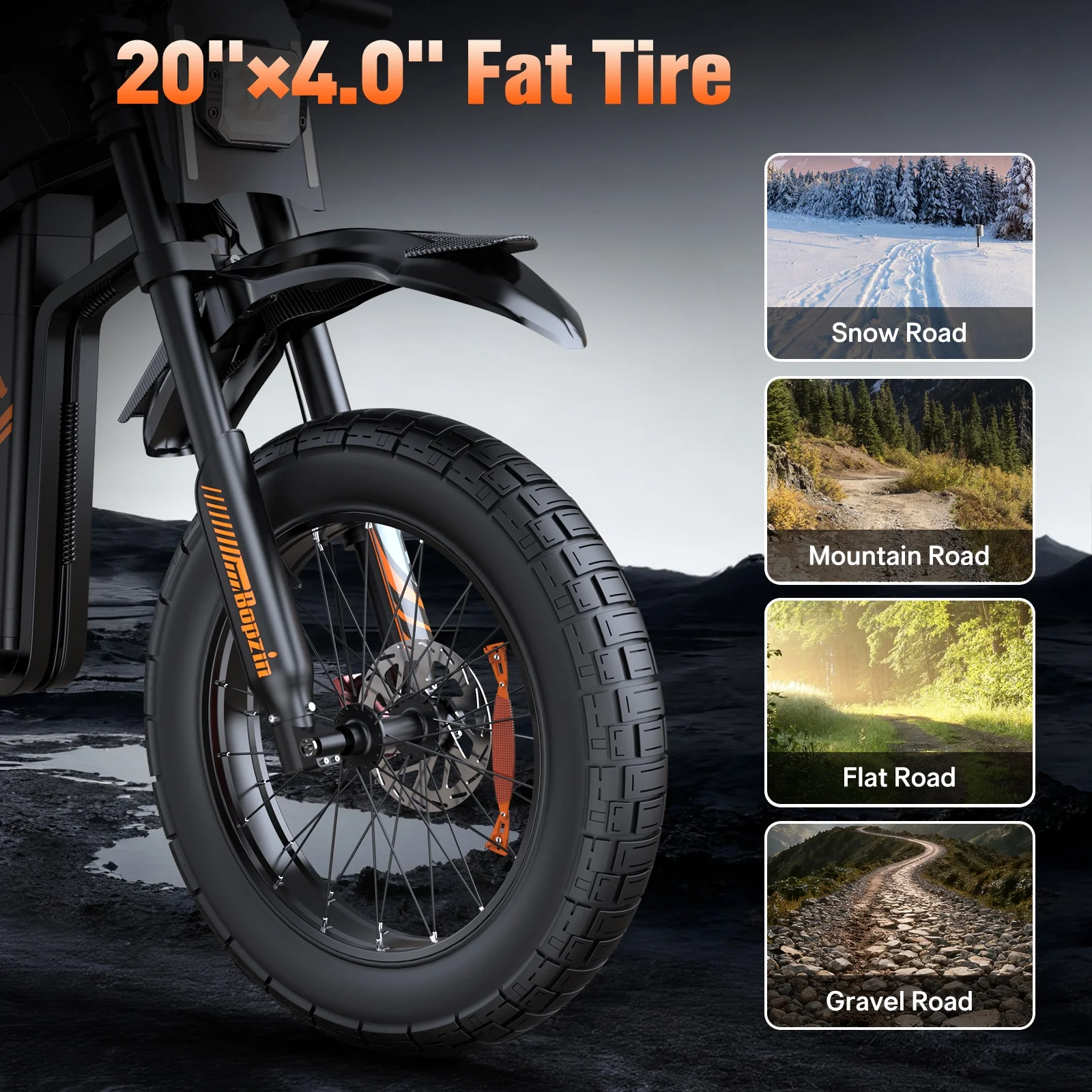 Still haven’t found your perfect electric dirt bike? Choose Bopzin—your ideal ride awaits! Eager to feel that adrenaline rush while biking? Ready to dive into the fun of electric dirt mountain biking? This Electric Mountain Bike for Adults—built to turn those desires into reality. It packs a 60V 35Ah battery for 37-68 miles of range, a 3000W motor that hits 45 MPH, 25’’ fat tires for many tough terrain grip-Mountain,Beach,Snow,Forest,with full suspension for a smooth ride. Plus, it’s UL2849 certified—safe, powerful, and perfect for your next adventure.