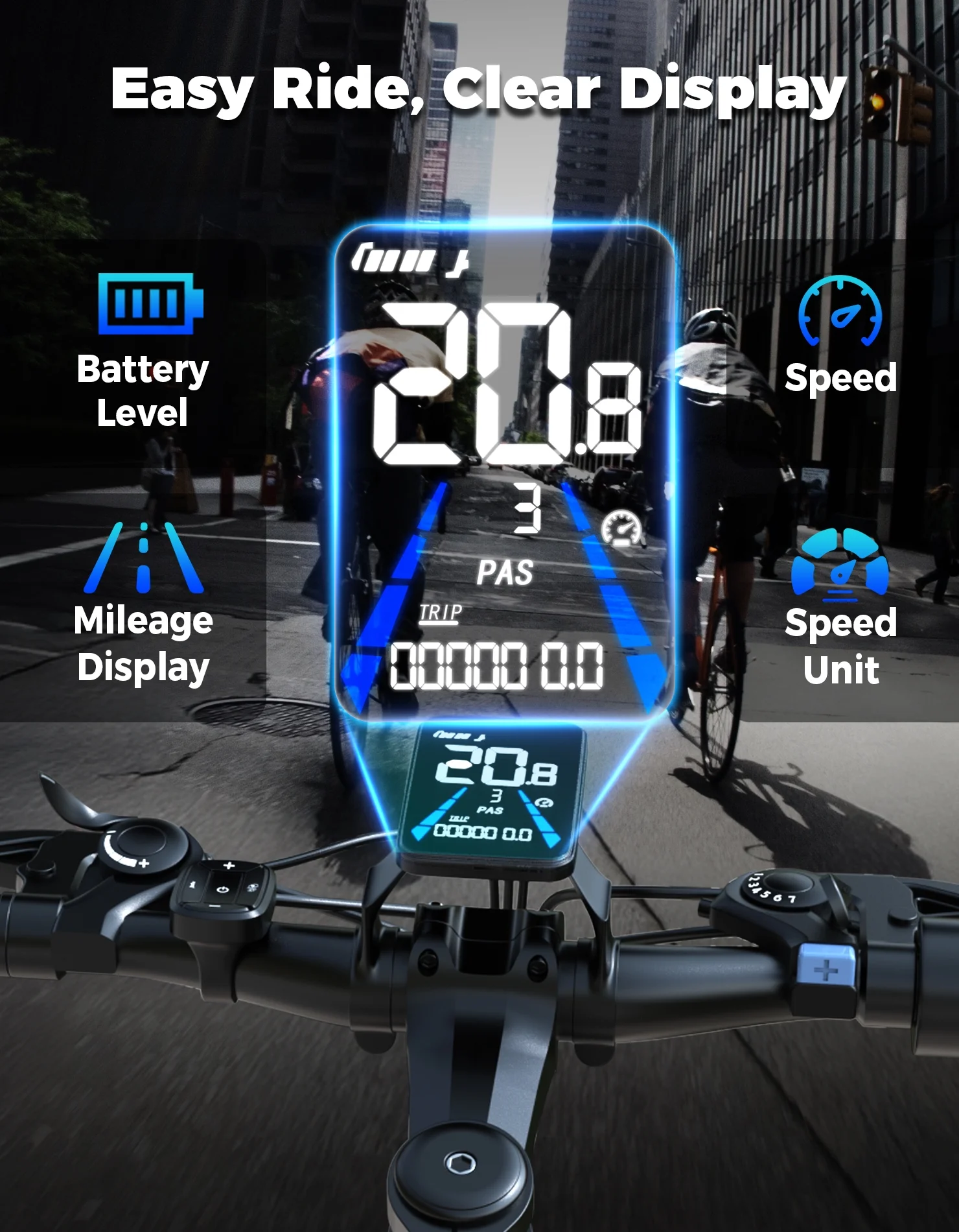 - Three-speed Intelligent Mode: Switch between Full Electric, Pedal Assist, or Fitness Mode. LED display tracks stats, while dual disc brakes and lights ensure safety day or night.