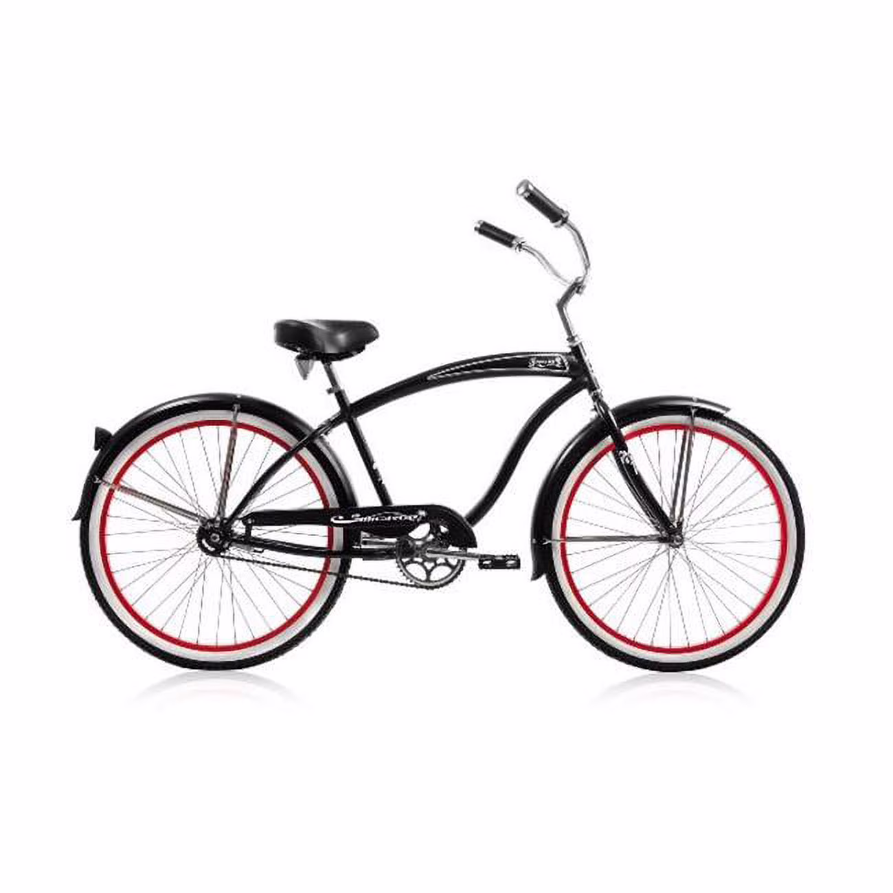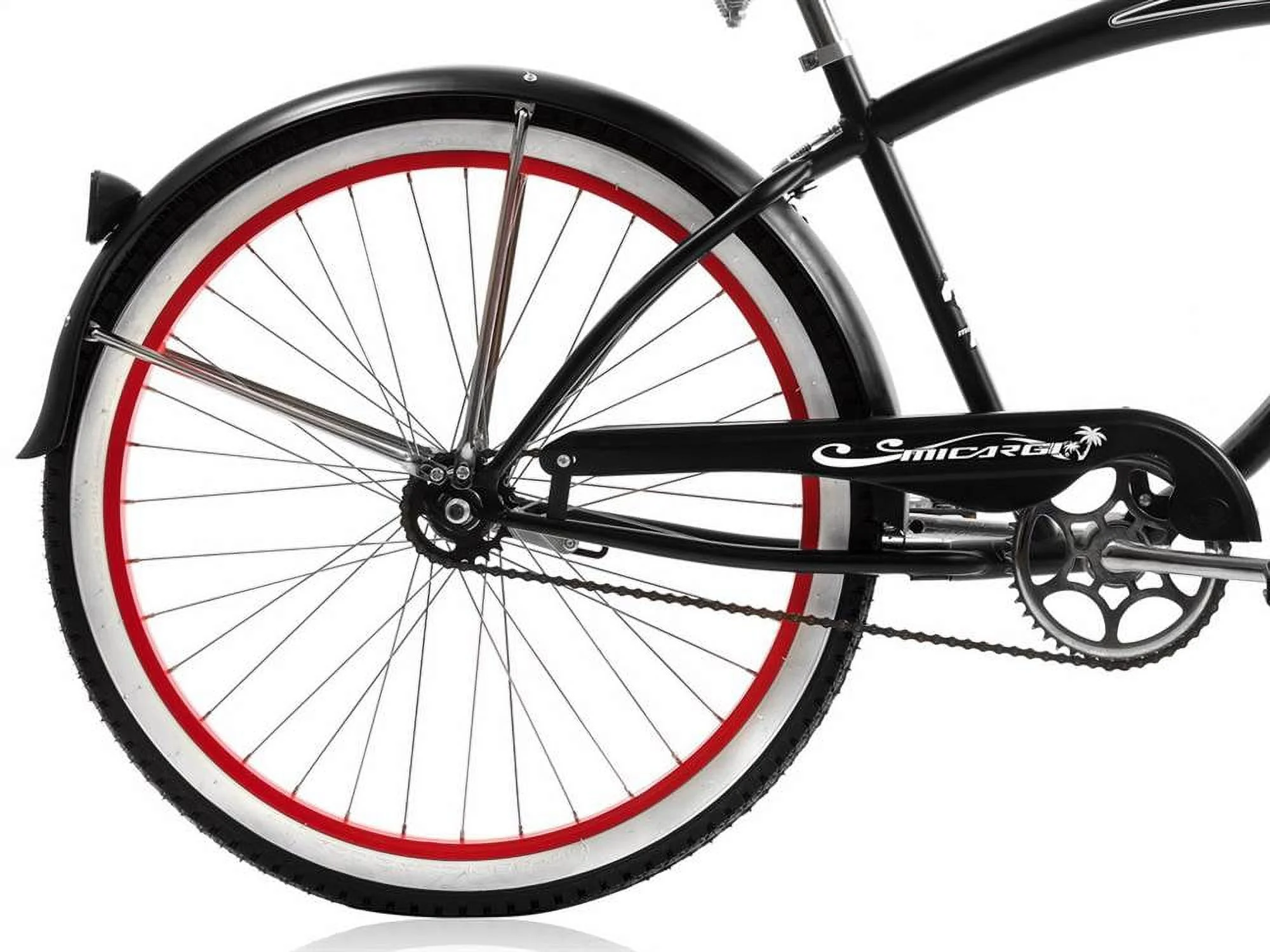 Micargi rover gx 26" beach cruiser coaster brake single speed stainless steel spokes one piece crank alloy red rims 36h white wall tire with fenders color black/red rim Micargi Tahiti 26 women's beach cruiser bicycle is built with sleek design for the modern cruiser shoppers! This single speed women's beach cruiser has what it takes to impress everyone at the beach. Also, cruising around the town, campus, or the park will stand out in the public. The Micargi Tahiti beach cruiser features 15.5" frame size, matching-colored fenders, 36 stainless steel spokes on aluminum alloy body-colored rims with 26"x2.125" white wall cruiser tires, and an extra-padded comfort cruiser seat. The decals on the frame and chain guard are removable.