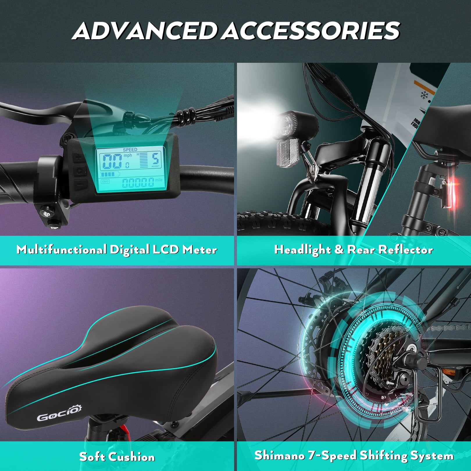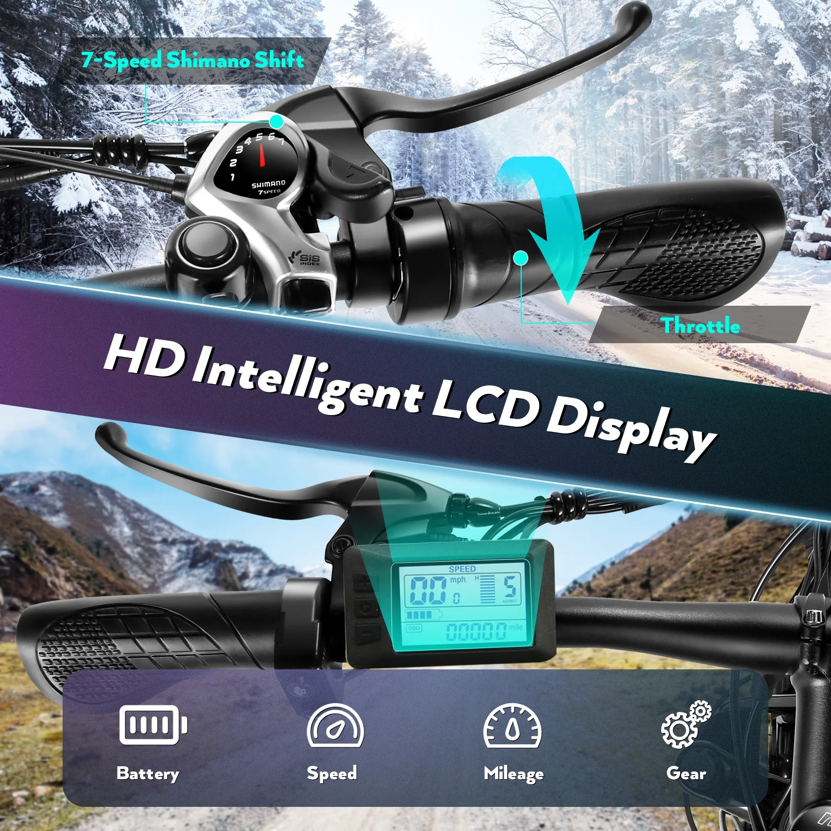 - 5 Working Mode & 7-Speed Shifting: 7-speed shifting for more power on the mountain, more variability and more adaptability off-road, combined with 5 cycling modes---E-bike/ Assisted bike/ Normal bike/ Booster Mode/ Cruise Control Mode, you can maintain a comfortable pedaling speed (or cadence) regardless of the gradient or terrain. Combining 5 modes would be a better choice.