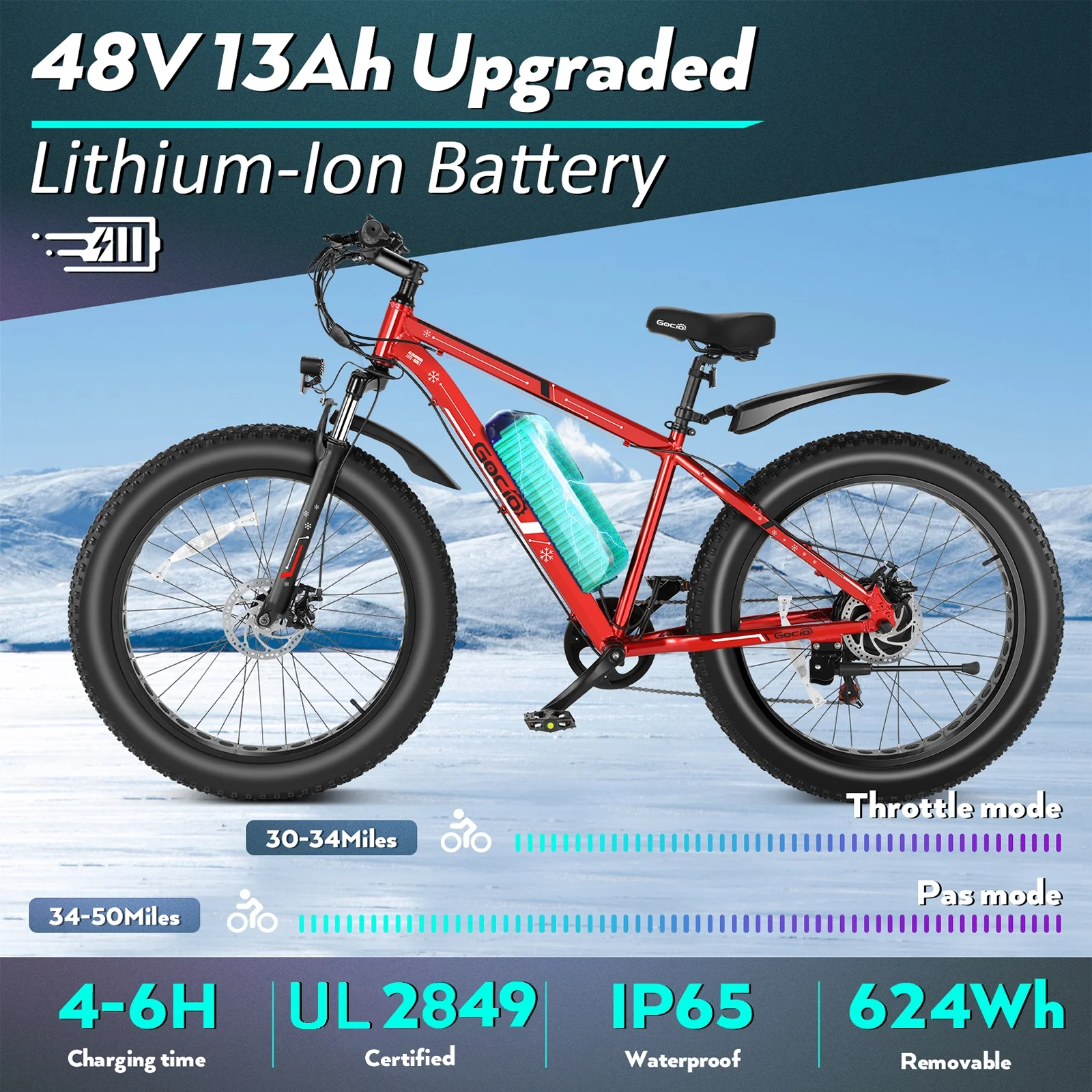 - Large Capacity 13Ah Lithium-Ion Battery: This e bike features a built-in 48V 13Ah lithium-ion battery(UL 2849 Certified), can be charged both on the frame and removable, 6hrs fast charge can provide a range of up to 50 miles/22 Mph, plenty for a day's adventure or most trips to work and back.