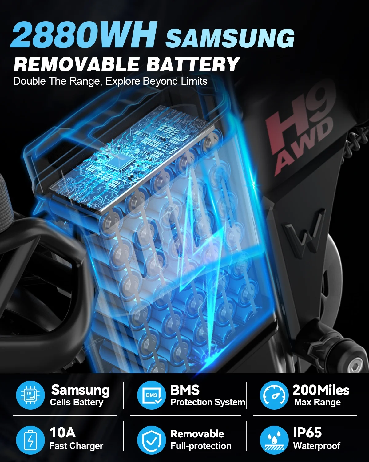 The H9AWD electric bike features some major upgrades to enhance the riding experience. Powered by 3200W peak dual hub motors and 48V 22Ah+60Ah large-capacity waterproof battery, the H9AWD effortlessly climbs hills and provides peace of mind for long-distance rides without worrying about running out of power. It has been upgraded to a certain level of puncture-resistant 20" x 4" fat tires, combined with a full suspension system, allowing you to tackle a variety of rough terrains while enjoying a smooth and comfortable ride.