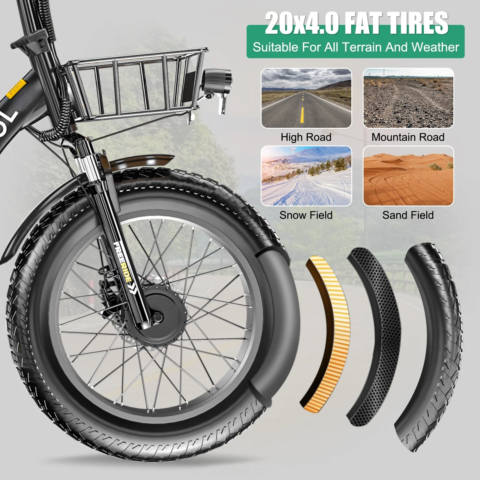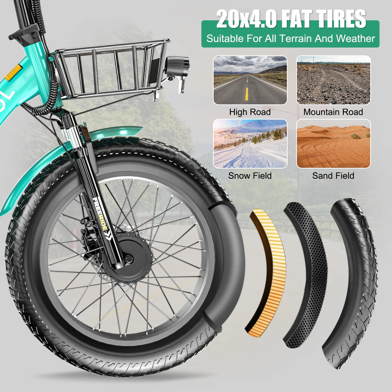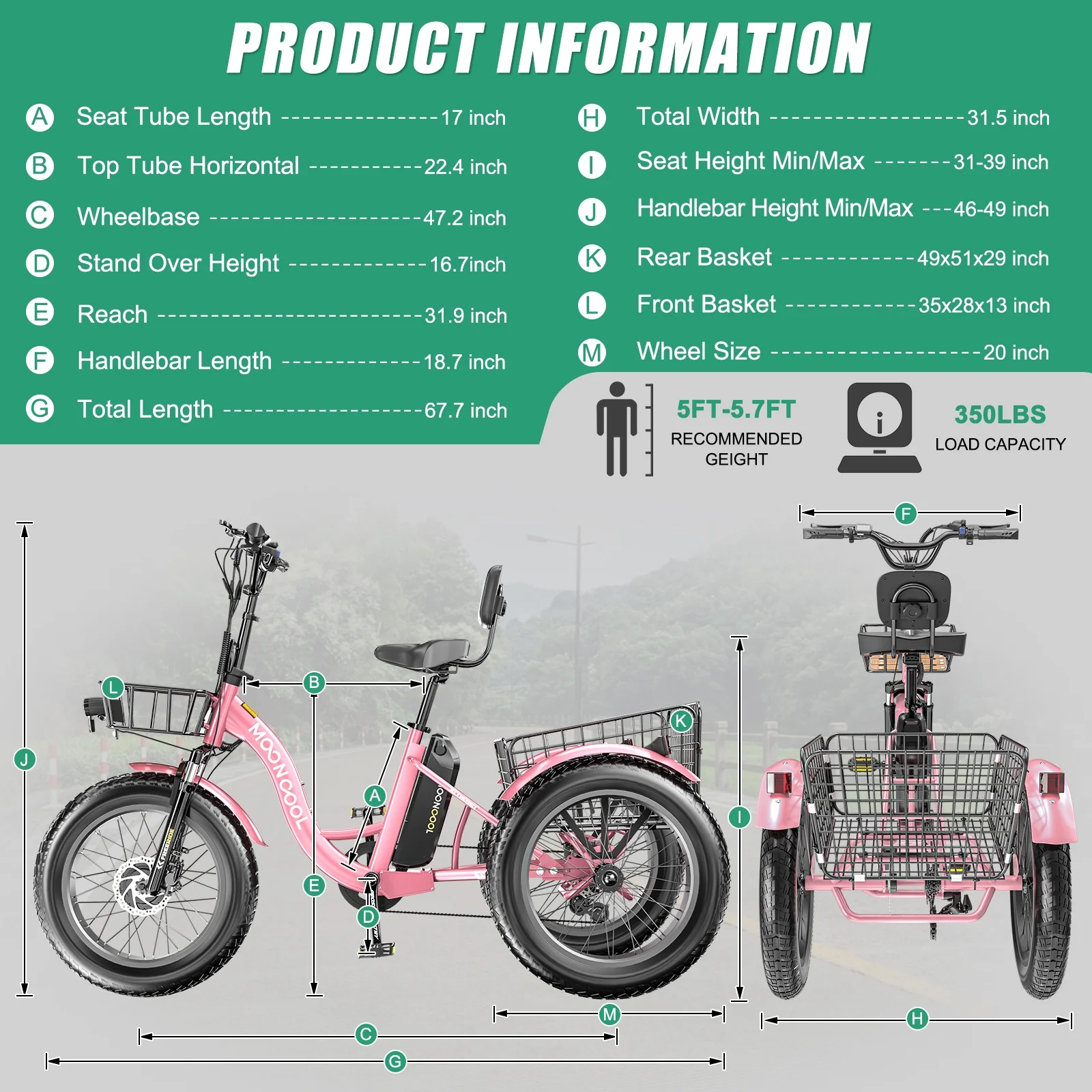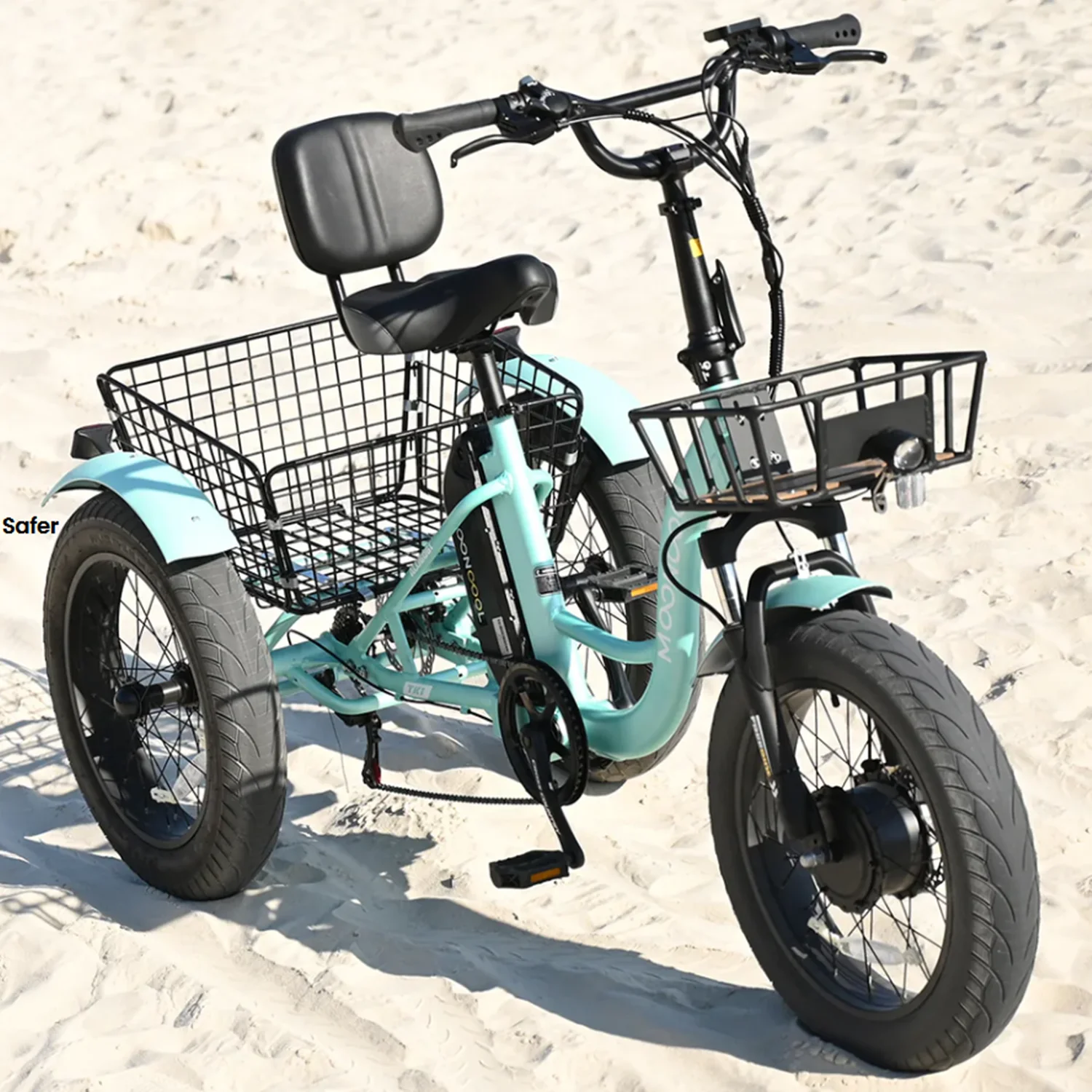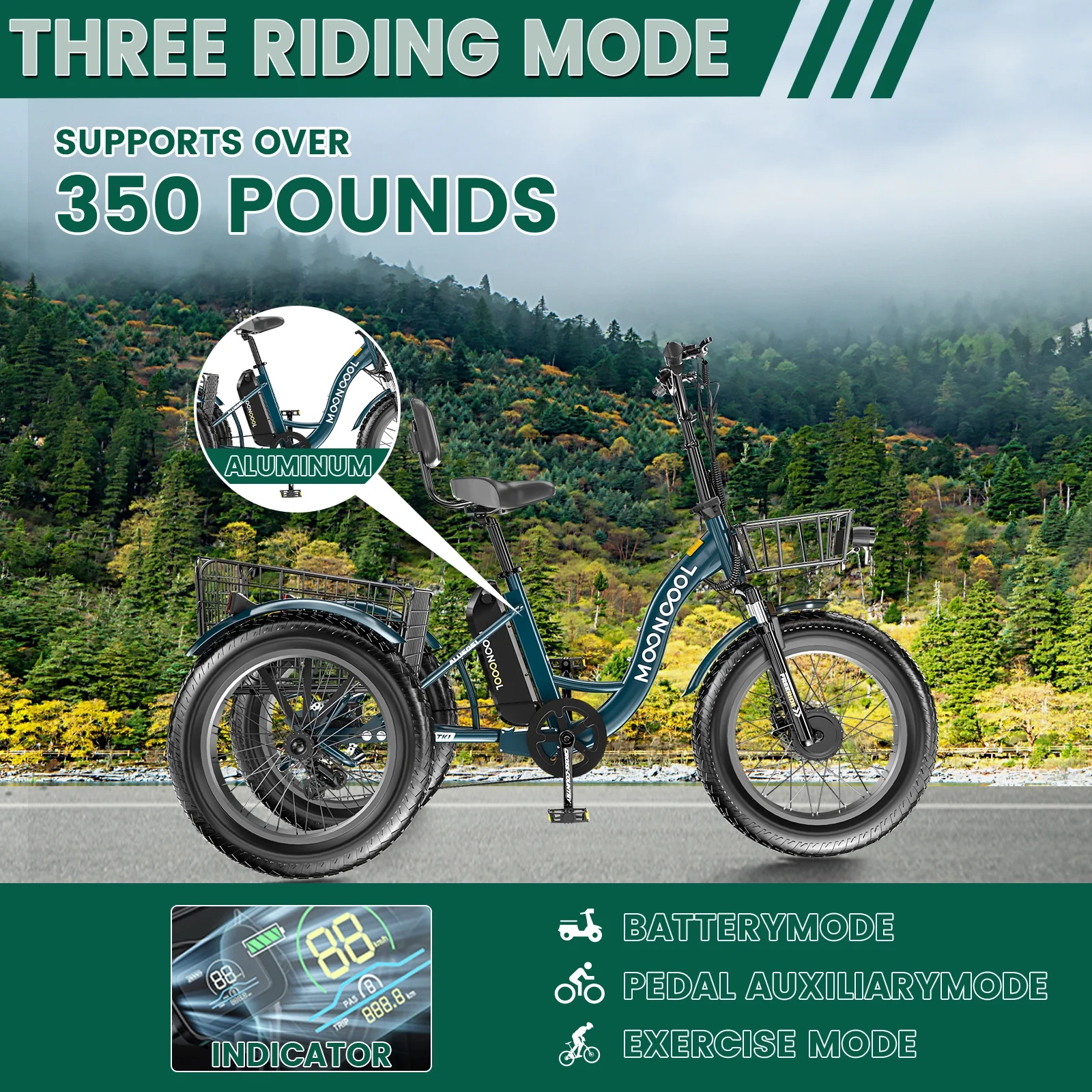 ABORON 4 inches fat tire electric tricycle with a 500W motor and equipped with a 48V 14.5AH detachable lithium battery can be fully charged within 6-8 hours,full charging endurance of 48.3km(30miles),which can run with a max of 25.6km/h(16mph). The max load capacity of 350 lbs which is suitable for riders of all sizes and abilities . And the seat of electric tricycle can be adjustable on proper position to meet your height. ABORON 20" Electric Trike has 3 Riding Modes(Electric Mode/Power Assist Mode/Pedal Mode),provide you with the most comfortable riding. This Electric tricycle for adults features an aluminum + hiten steel frame, front suspension, 7-speed grip-twist Shimano shifters the derailleur provide a wide gear range and smooth shifting, various speeds are suitable for different slopes and road conditions. and 4" wide fat tires. The 4" fat tires along with the spring suspension fork provide good traction and comfort.