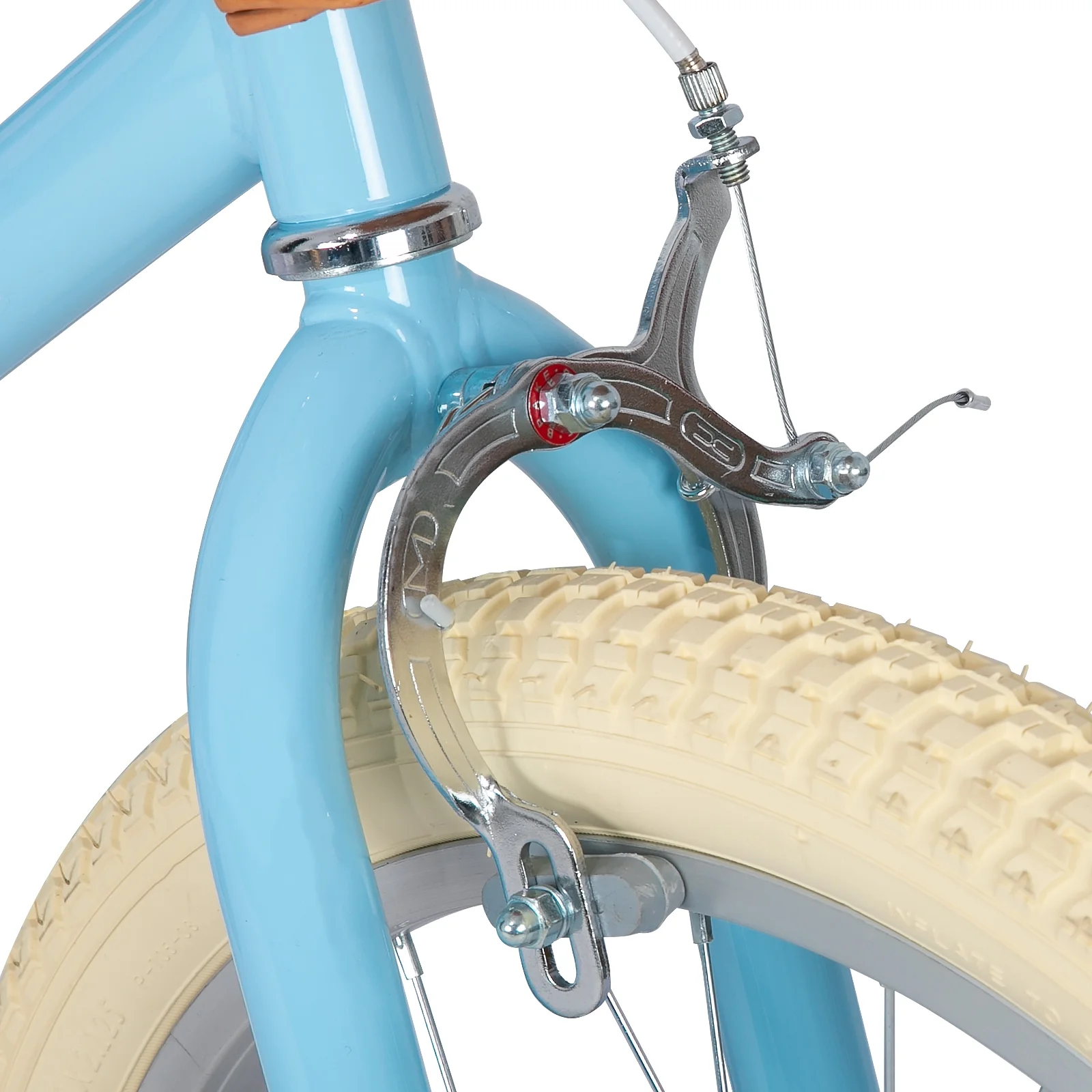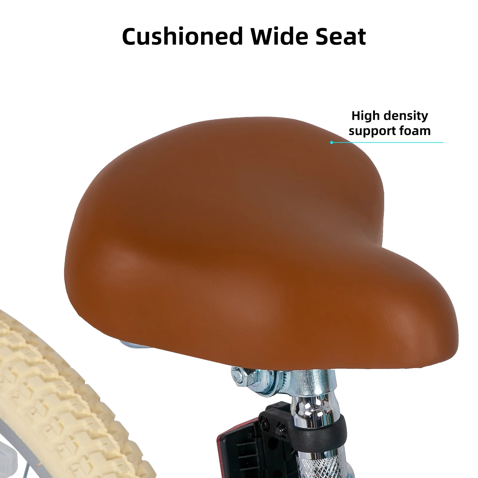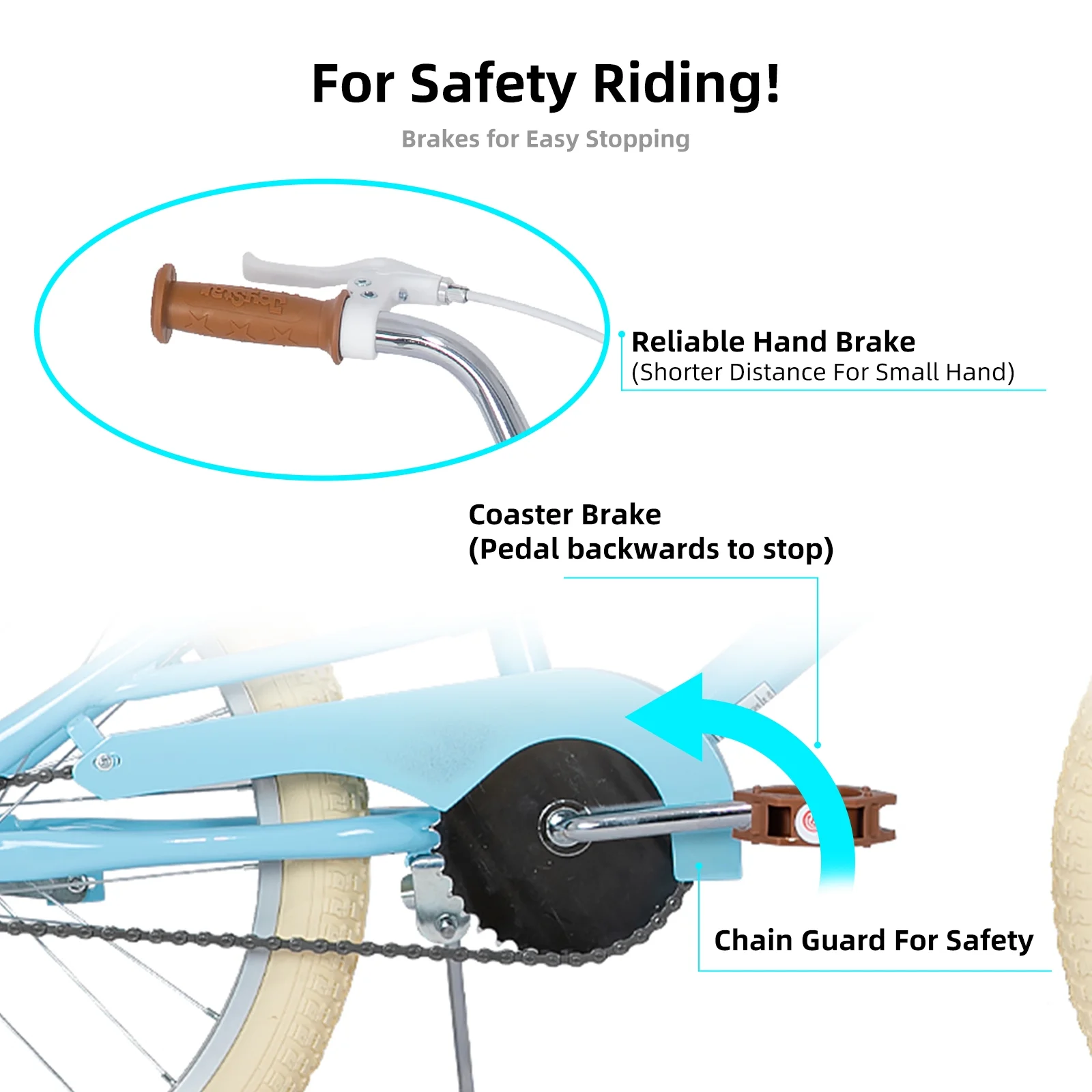 - Safety Features: front hand caliper brake, rear coaster brake, wide pneumatic tires, non-slip pedals, enclosed chainguard, and reflectors