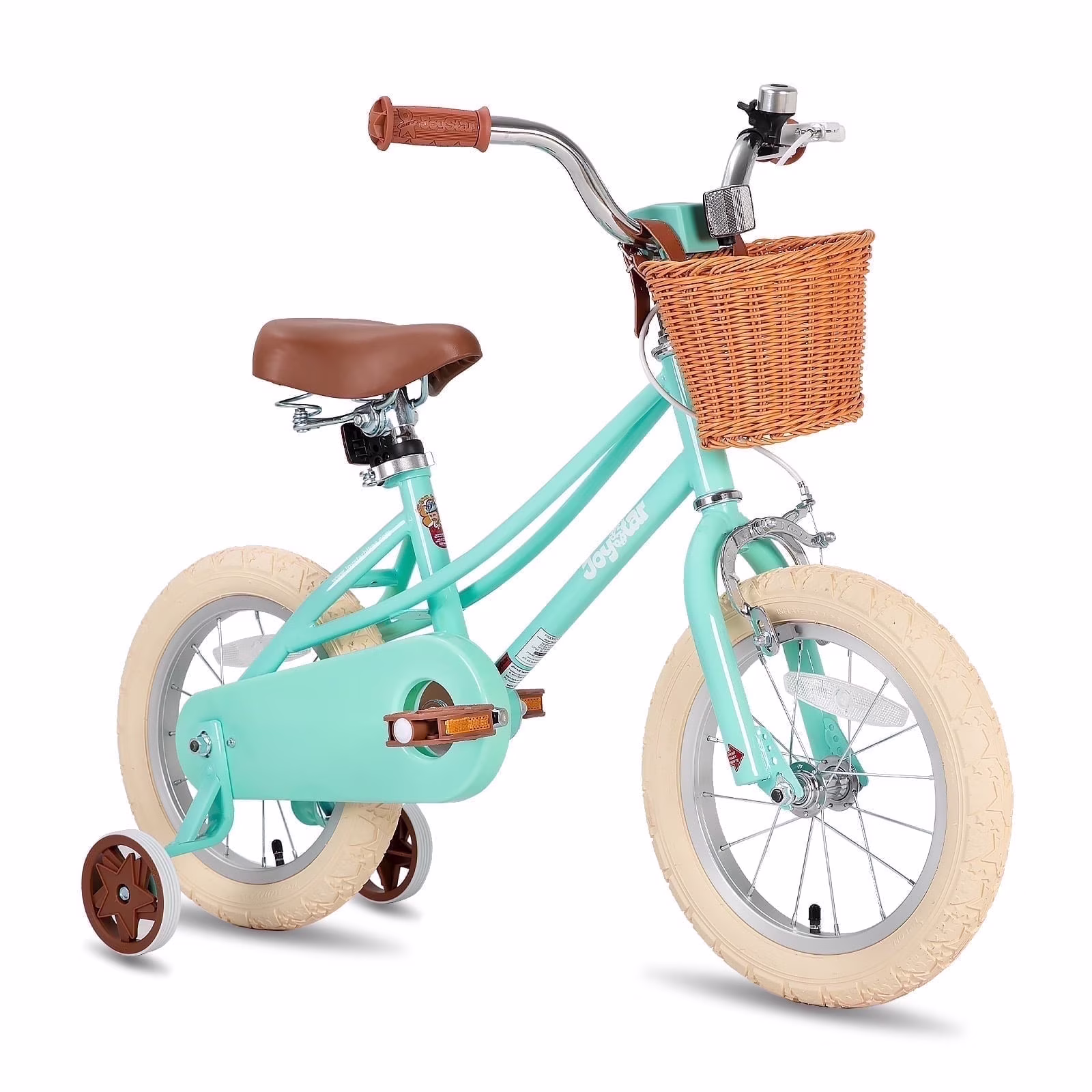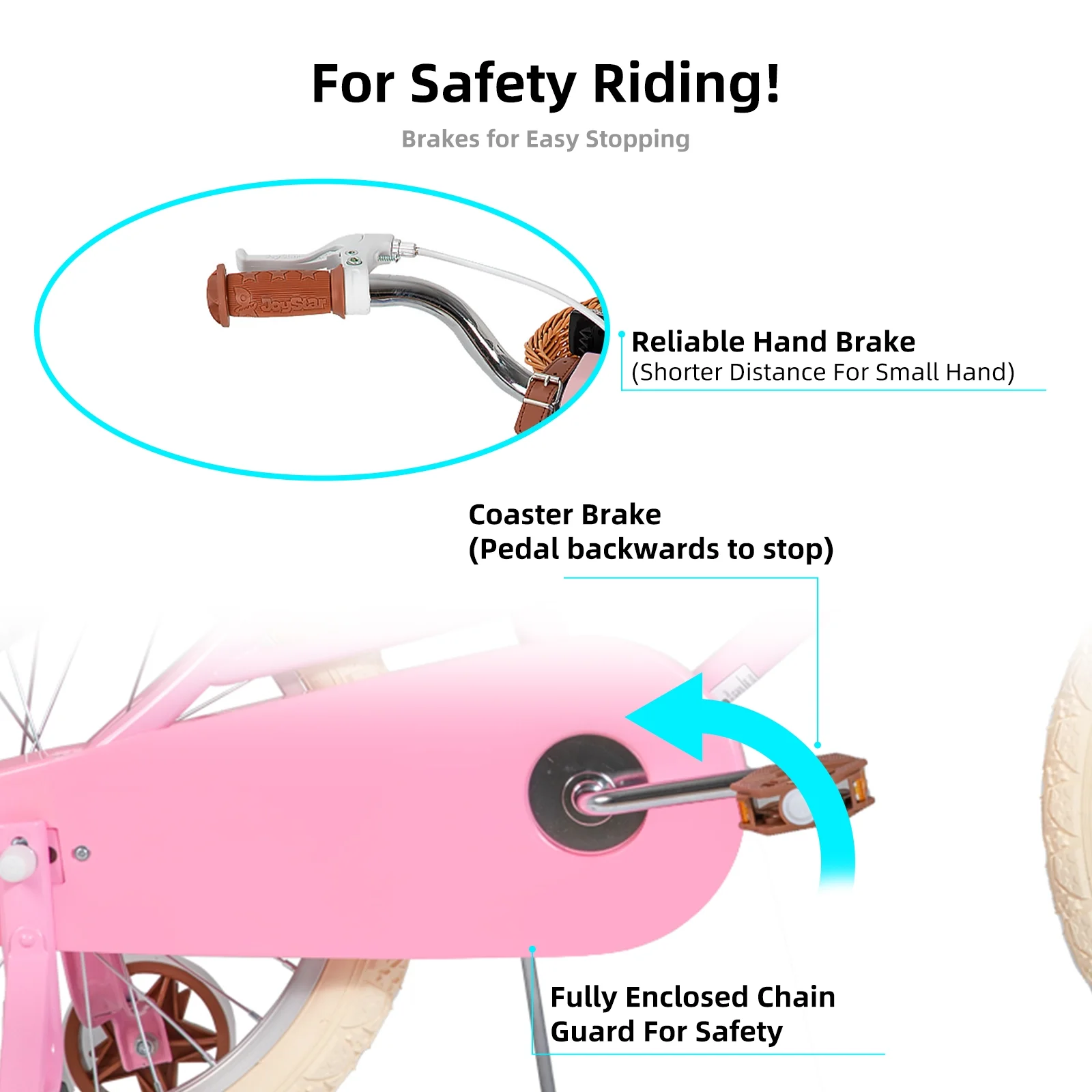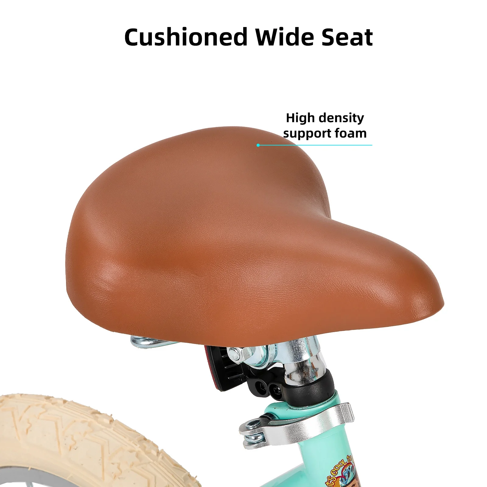 - Safety Features: front hand caliper brake, rear coaster brake, wide pneumatic tires, non-slip pedals, enclosed chainguard, and reflectors