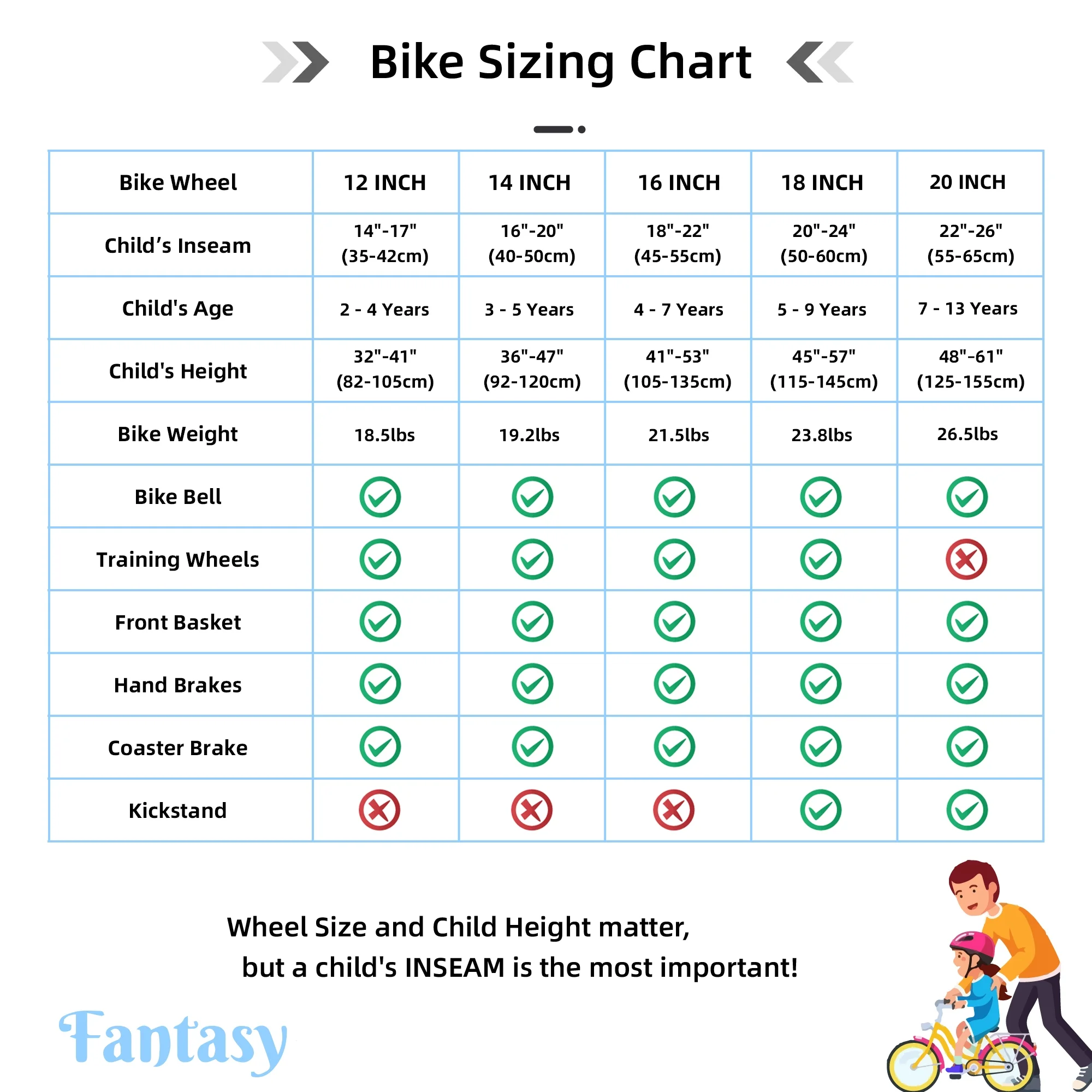 - Size Options: 12" (3-4 yrs, 33-41"), 14" (3-5 yrs, 35-47"), and 16" (4-7 yrs, 41-53")