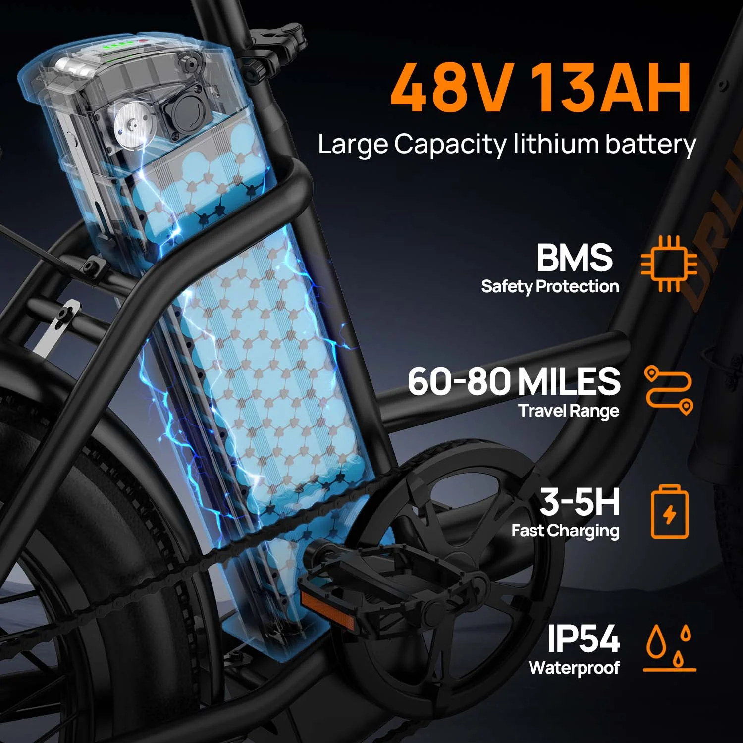 - 【48V 13AH Large Capacity Removable Battery】:The electric mountain bike is equipped with a giant lithium battery, which increases the mileage by 50%. Say goodbye to frequent charging with this e-bike that easily delivers 80 miles of range (PAS mode) for your most ambitious riding adventures. Perfect for Detachable design allows the battery to be easily removed from the e-bike and charged indoors.