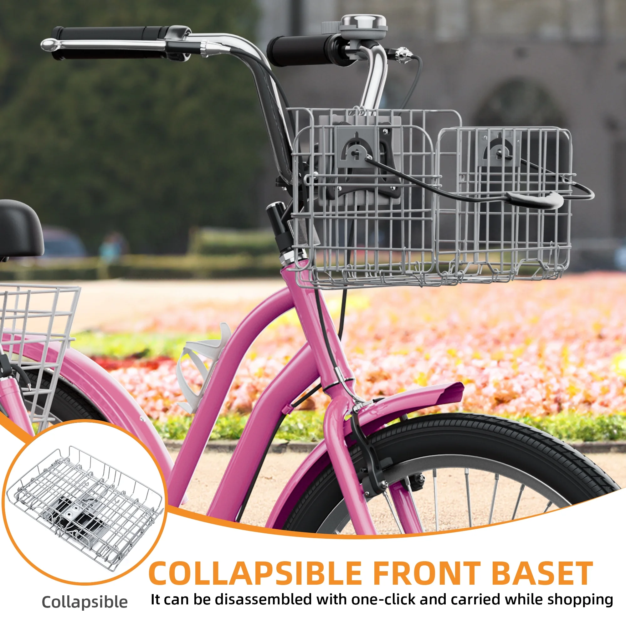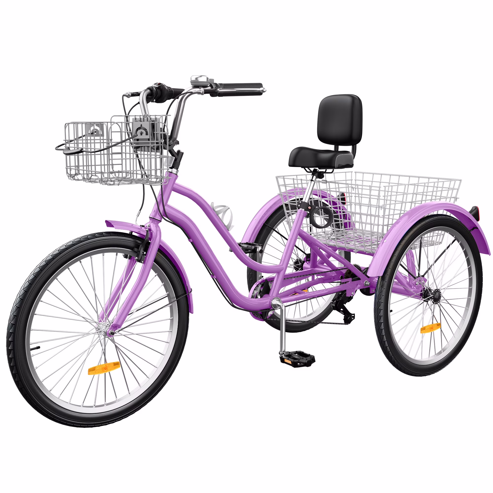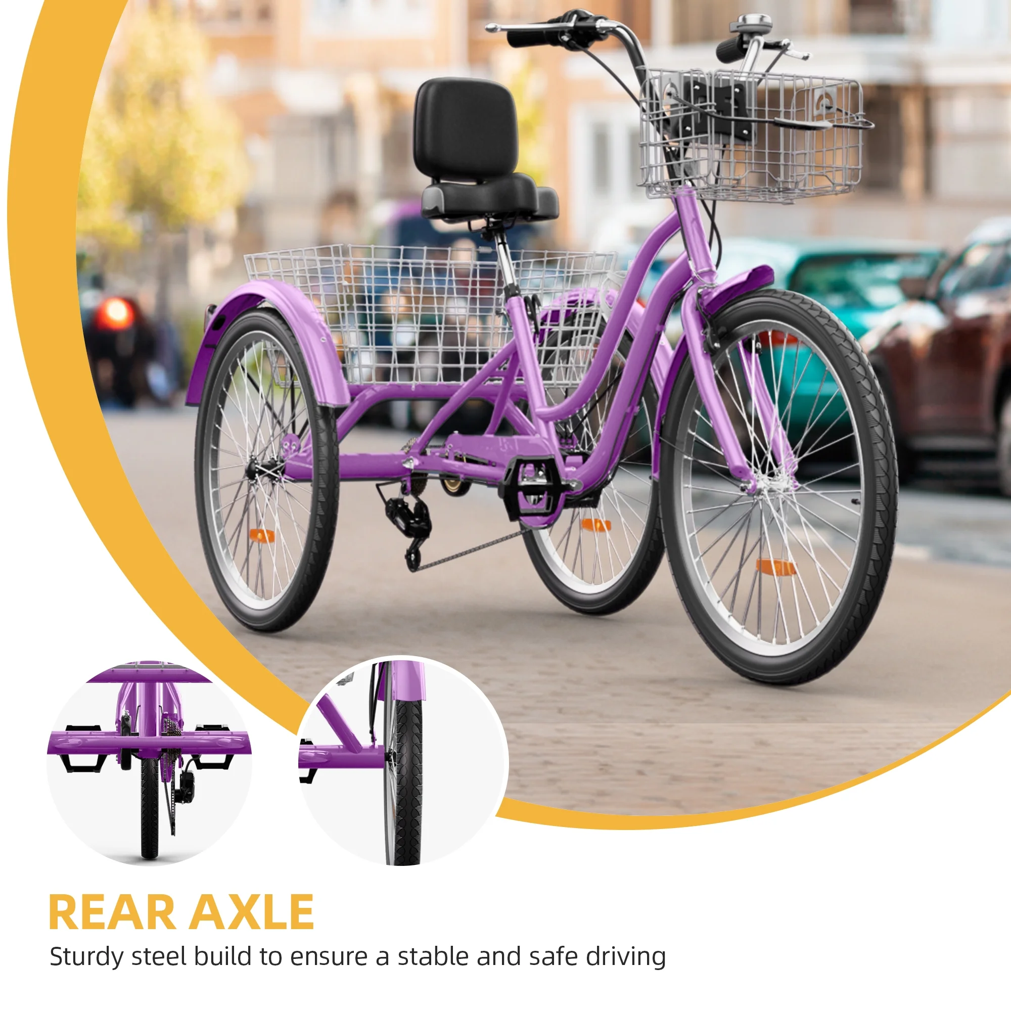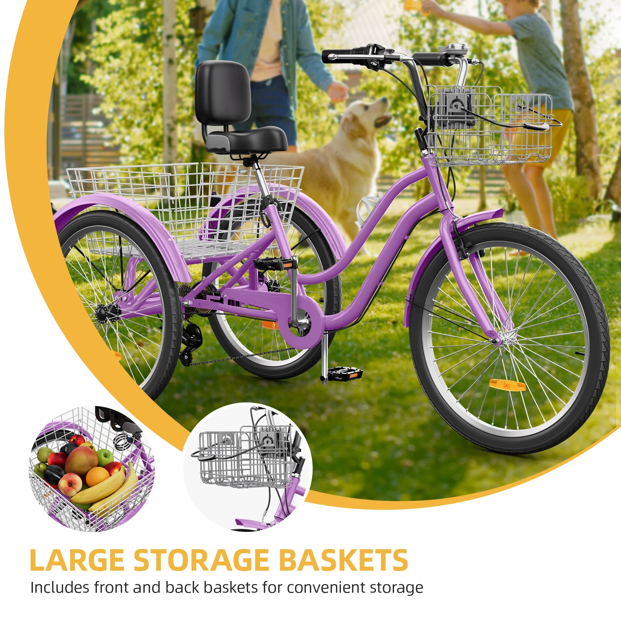 Dextrus 24 in 3 - Wheel Bike, Single Speed Adult Trike, Low Step - Through Cruiser with Front & Rear Baskets, Large Adjustable Seat with Backrest for Seniors, Men, and Women (Purple)