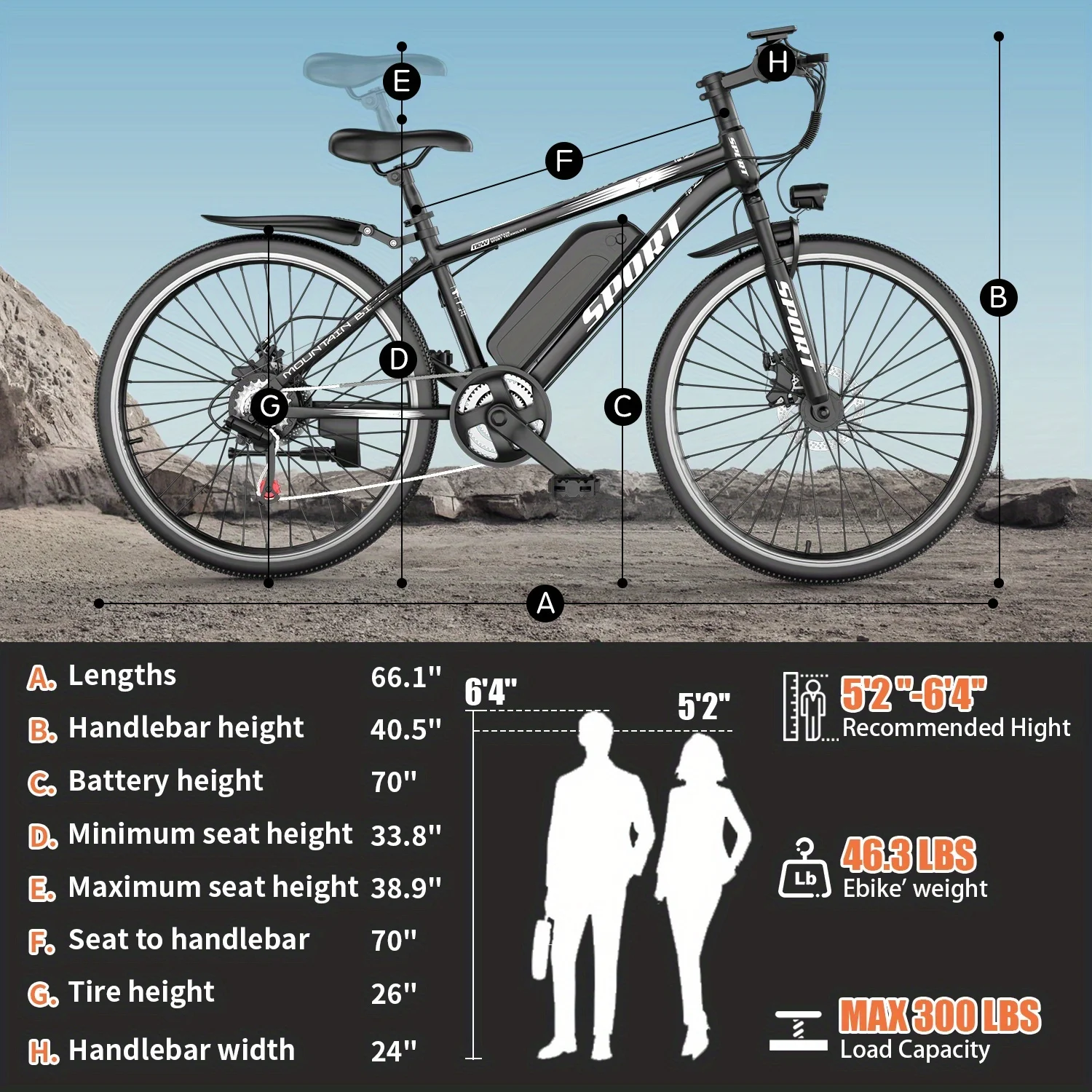 - Wheel Size: 26 x 2.125 inches Top Speed: 25 MPH (Throttle Only) Battery:36V 10Ah Removable Battery (UL 2849 certified) Charge Time: 4-5 hours Range: From 25-30 miles (E-bike Mode) to 30-55 miles (PAS Mode) Fork: Lockable Suspension Front Fork Brake Details: Dual Disc-Brake Max Load Capacity: 300 pounds E bikes Weight: 58 Pounds Assembled Dimension:53 x 10 x 27.6inch Recommended Height: 5'4"-6'4"