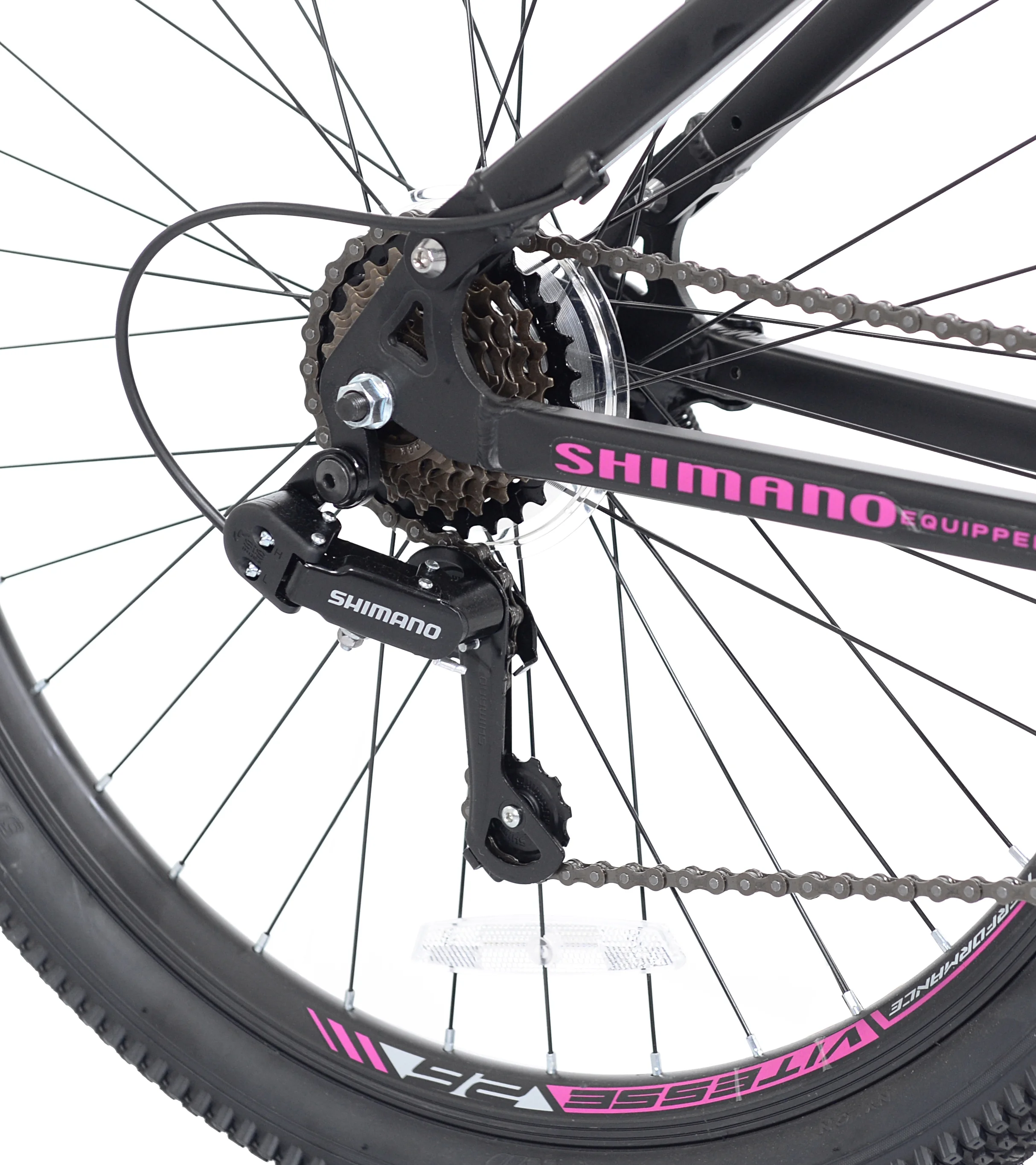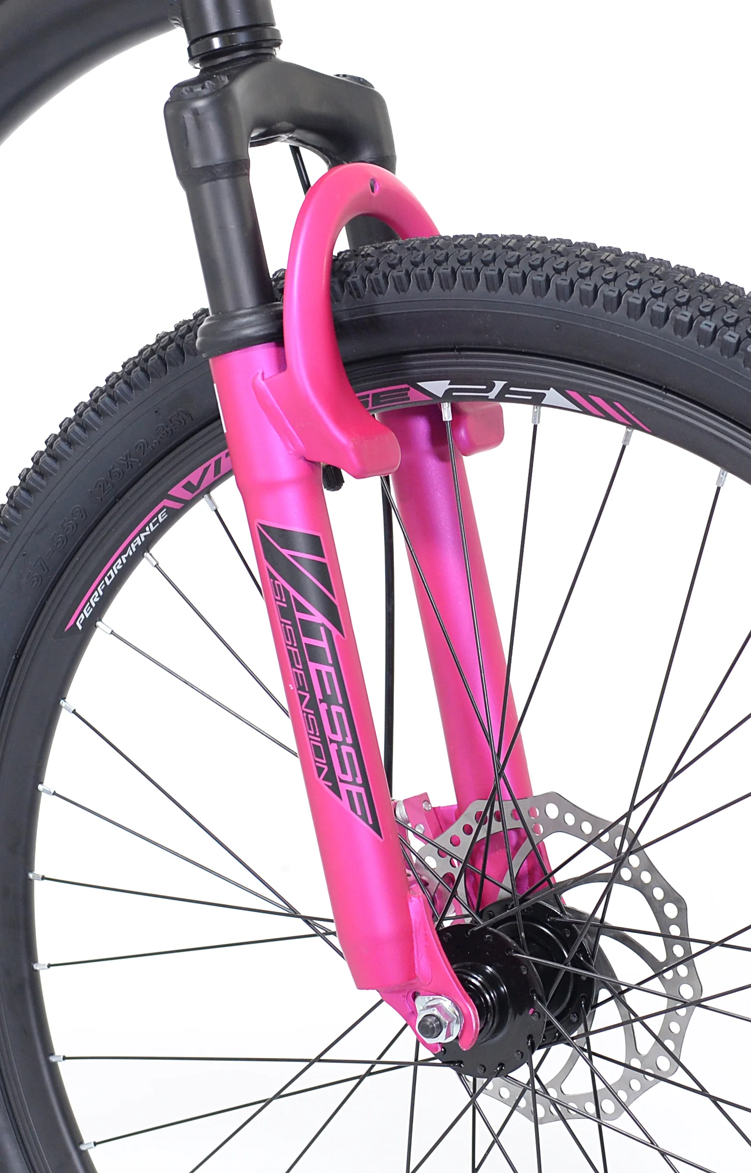 The genesis 26" Maeve female mountain bike is a 21-speed dual-suspension mountain bike that comes in black with hot pink accents. This aluminum frame mountain bike comes with a Shimano rear derailleur, traditional pedals, a quick release seat-post, front disc brakes, and rear linear-pull brakes. This is a stylish yet functional women's mountain bike that will have you riding on the trail or bike path in no time. 26" bikes are designed for people who are 5'2" and taller.