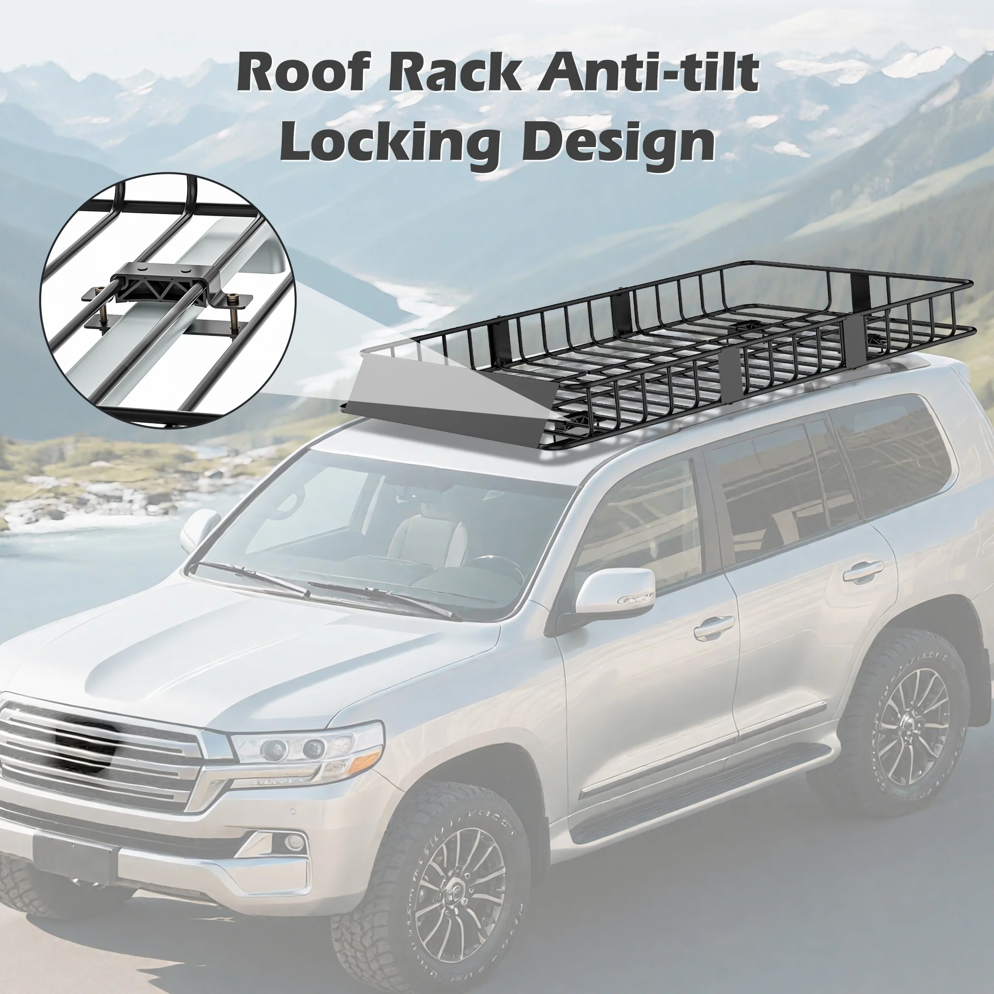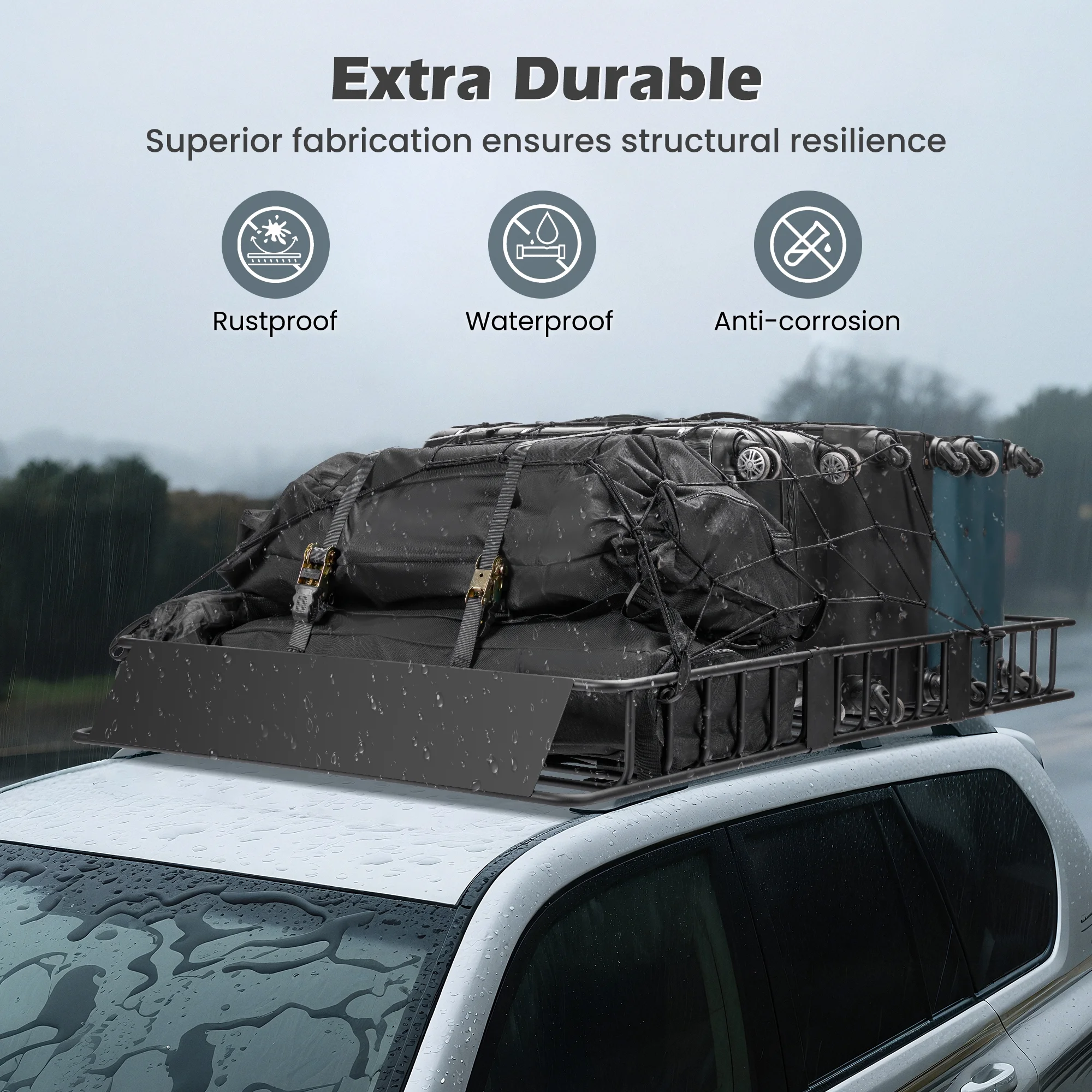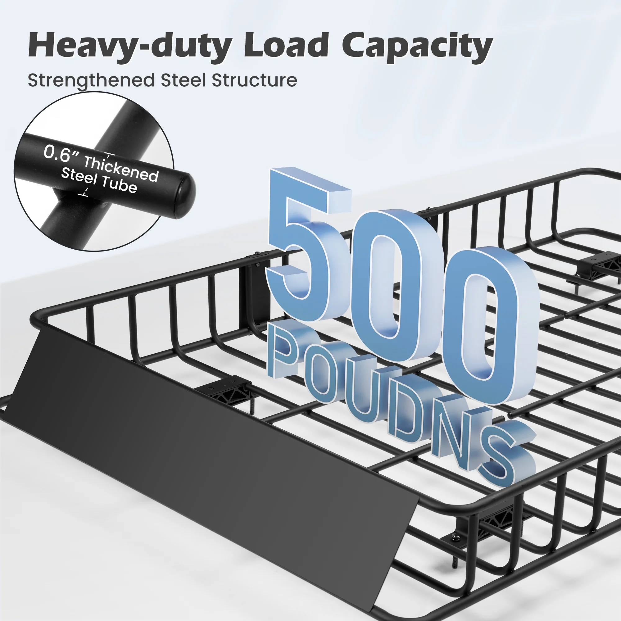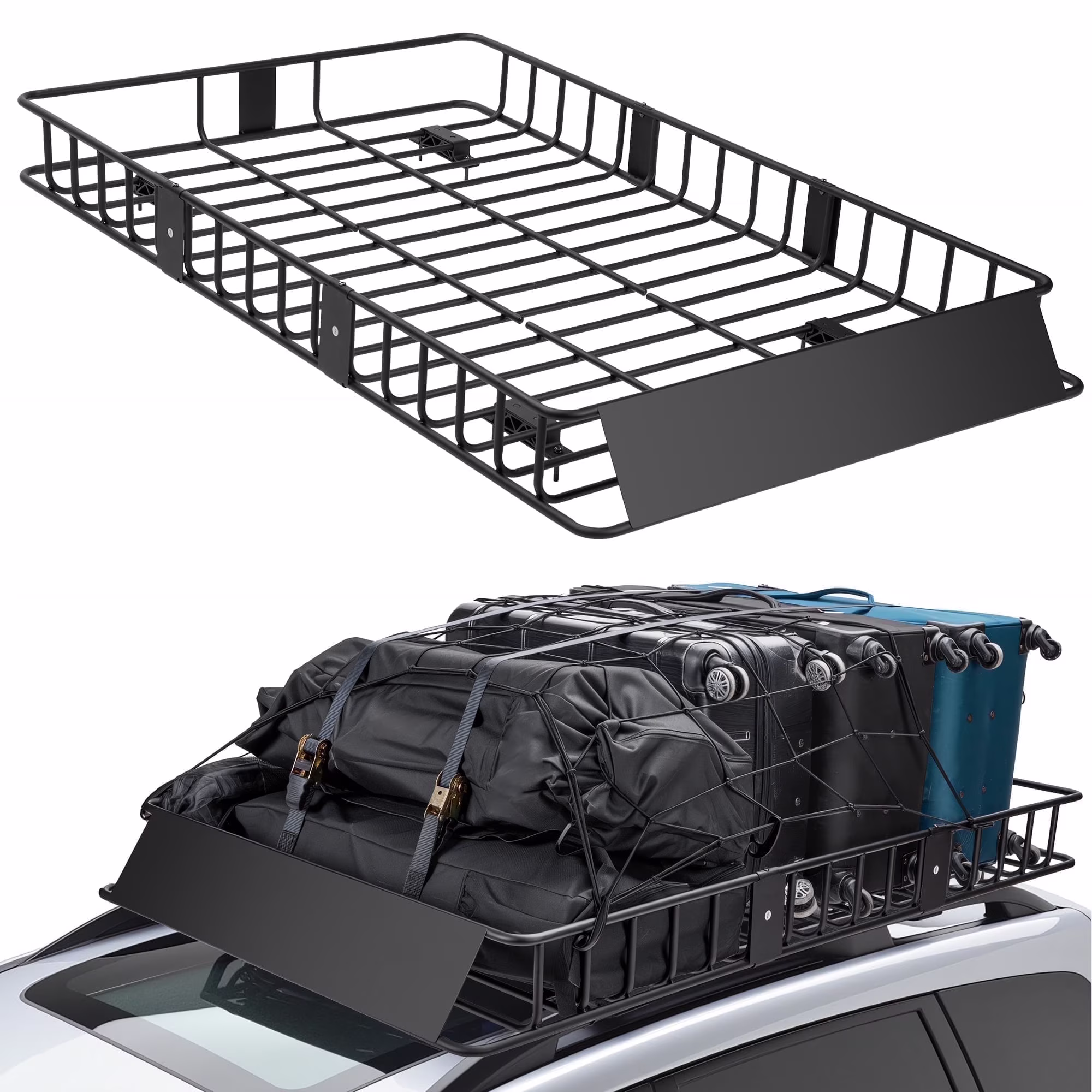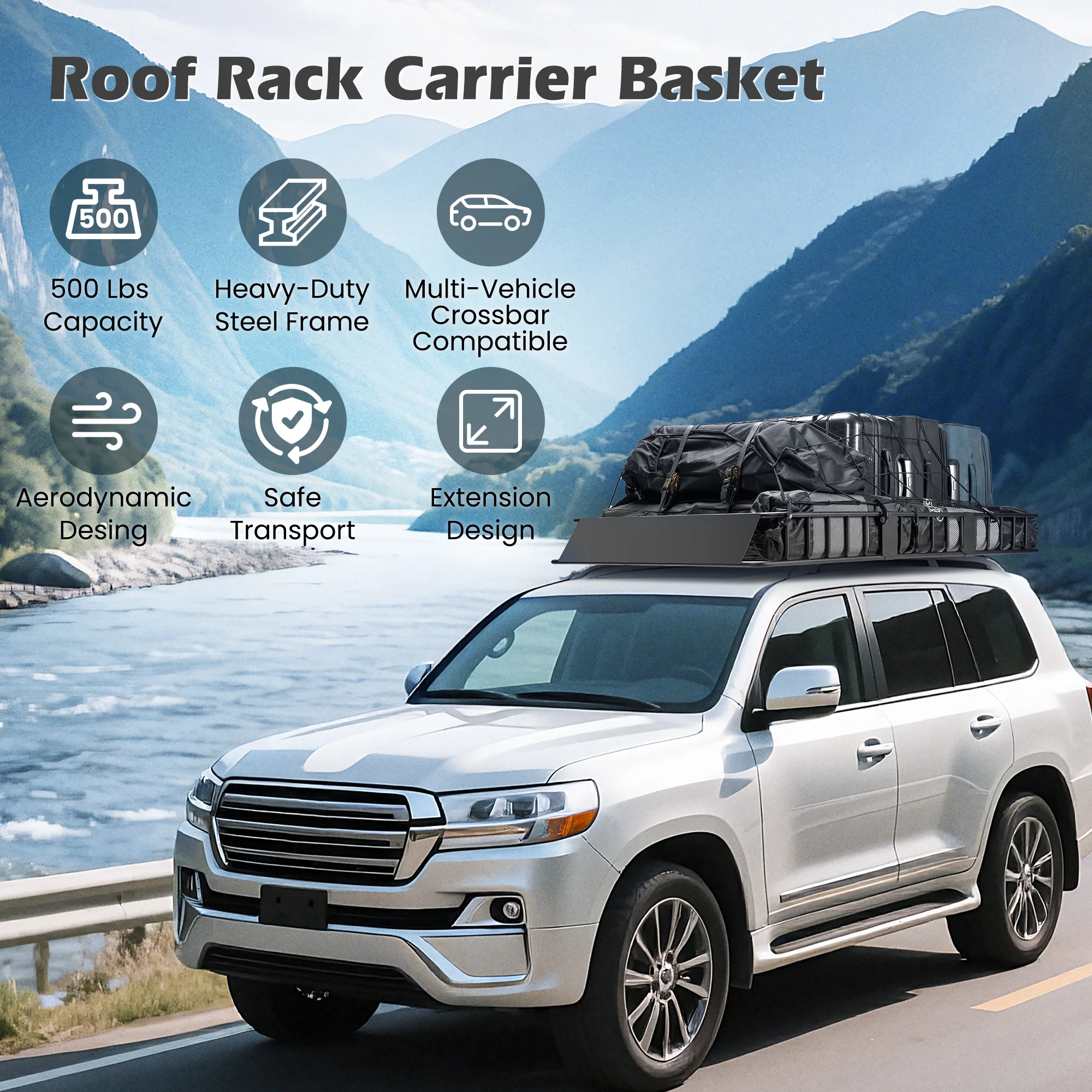 - 【Sturdy and Durable】Our roof rack basket features heavy-duty thick steel tubing that resists deformation, with a 500-pound load capacity. The weather-resistant coating provides waterproof, rustproof, and corrosion-proof protection, preventing damage from unexpected travel challenges,and also extending the lifespan of the roof rack cargo basket.