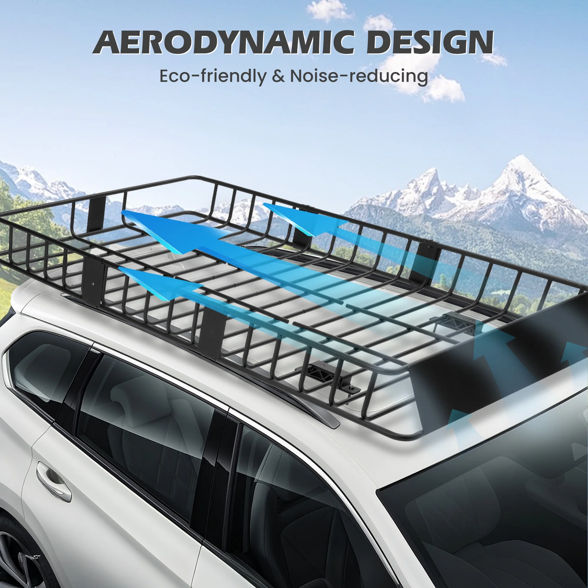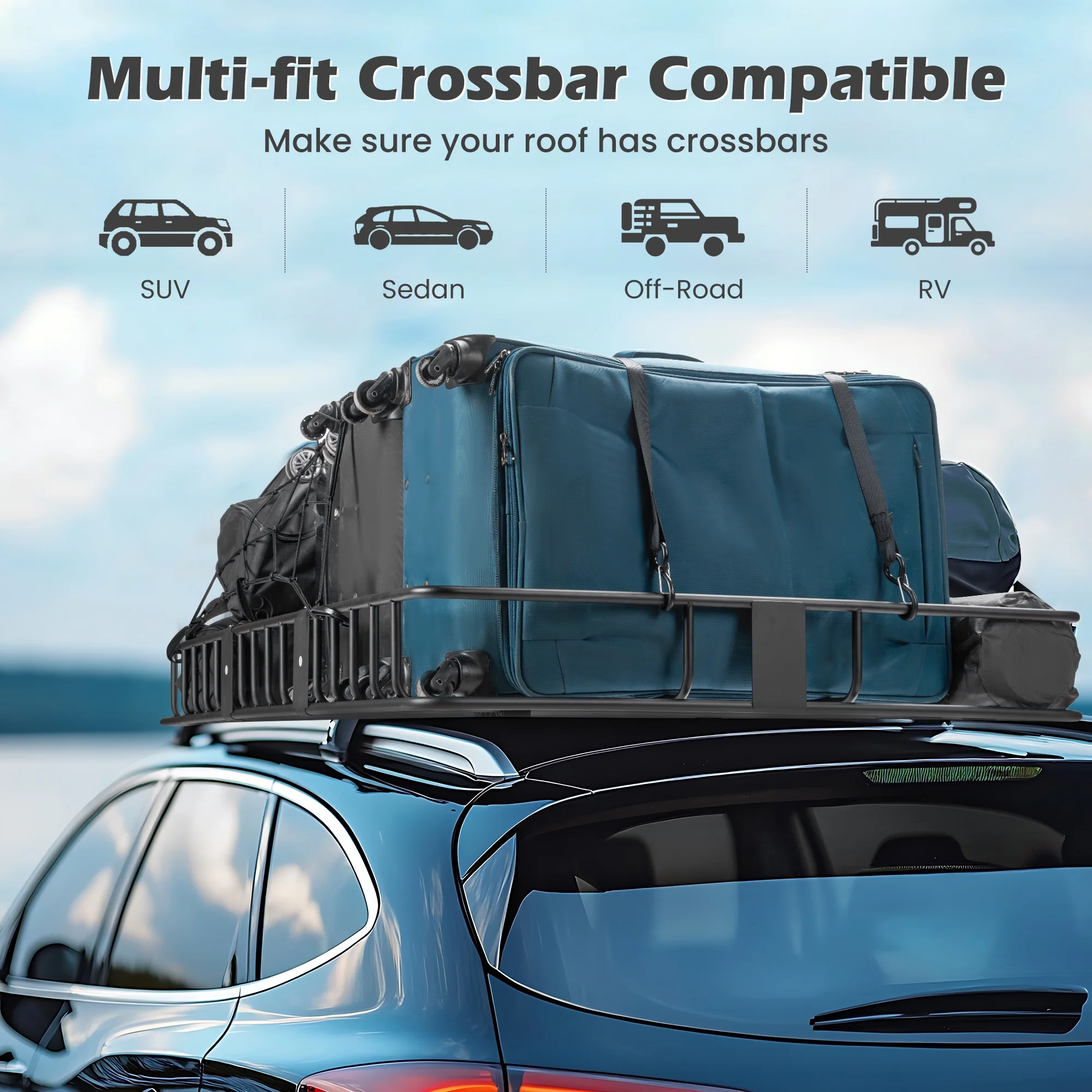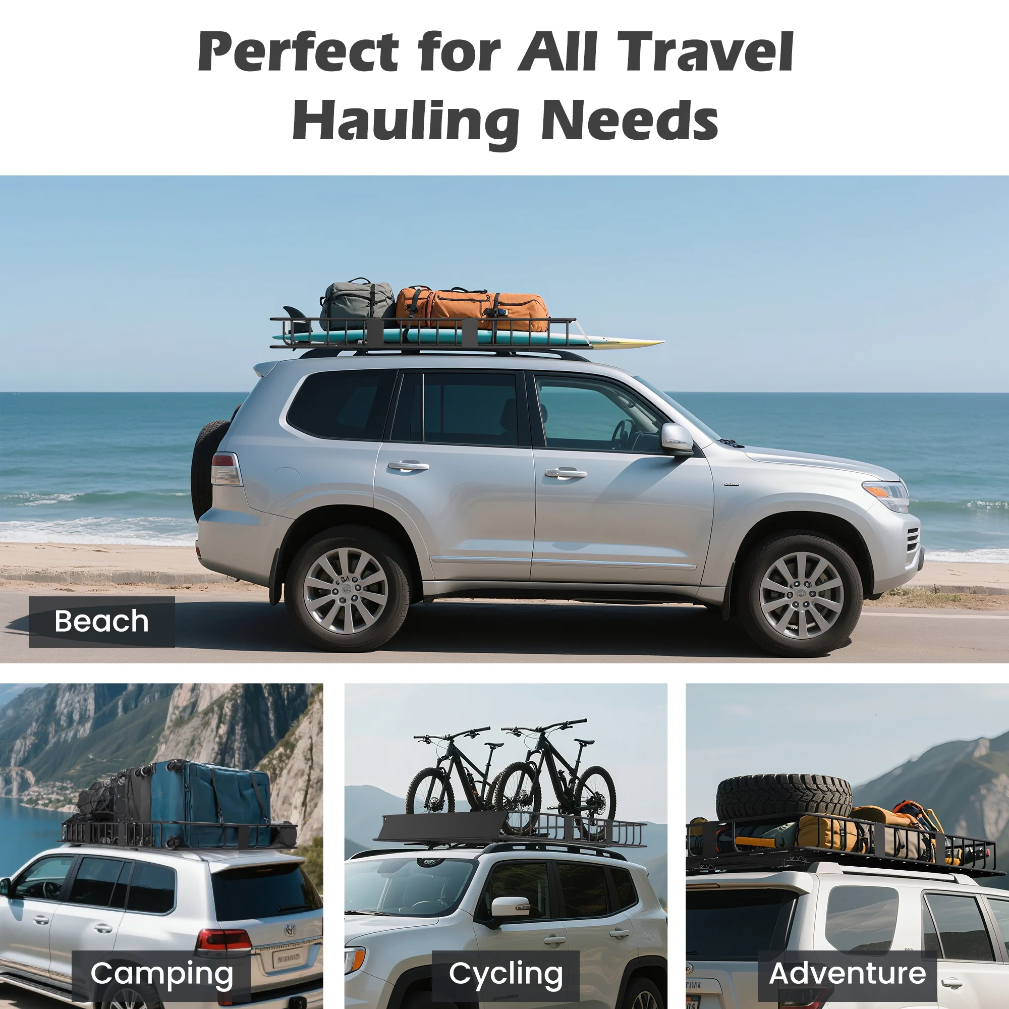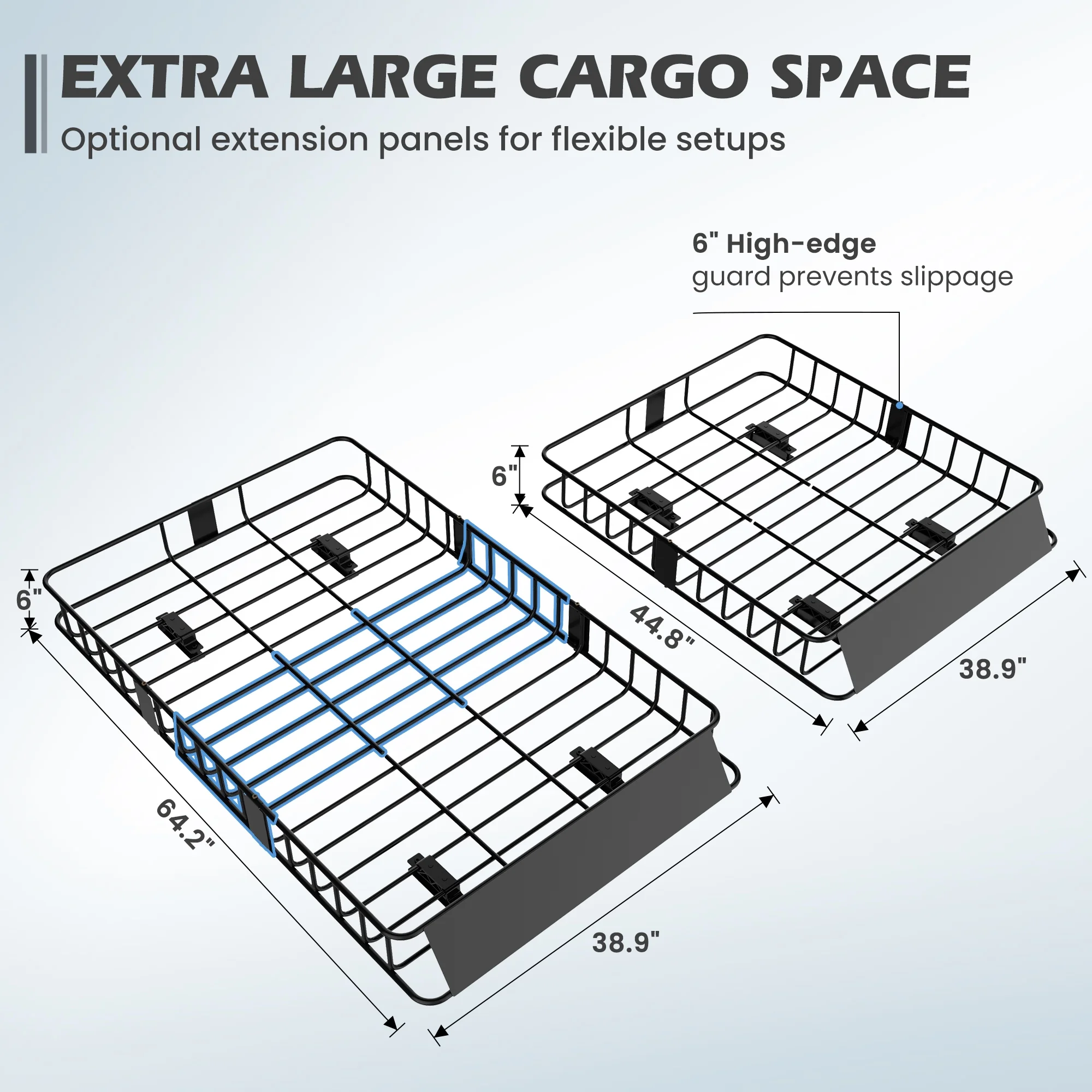 - 【Extra Large Size】This suv roof basket features an innovative extendable design - simply attach the extension panel to transform it into a spacious 64"x38.9"x6" cargo carrier. So our roof top cargo basket is perfect for bulky or irregularly shaped items like bicycles, camping gear, suitcases, duffel bags, paddleboards, and tents. With universal crossbar compatibility for RVs, SUVs, sedans, vans and off-road vehicles, the top luggage rack for suv creates extra interior space of the car to comfortably accommodate more your friends and family members, achieving the perfect balance between cargo capacity and passenger comfort.