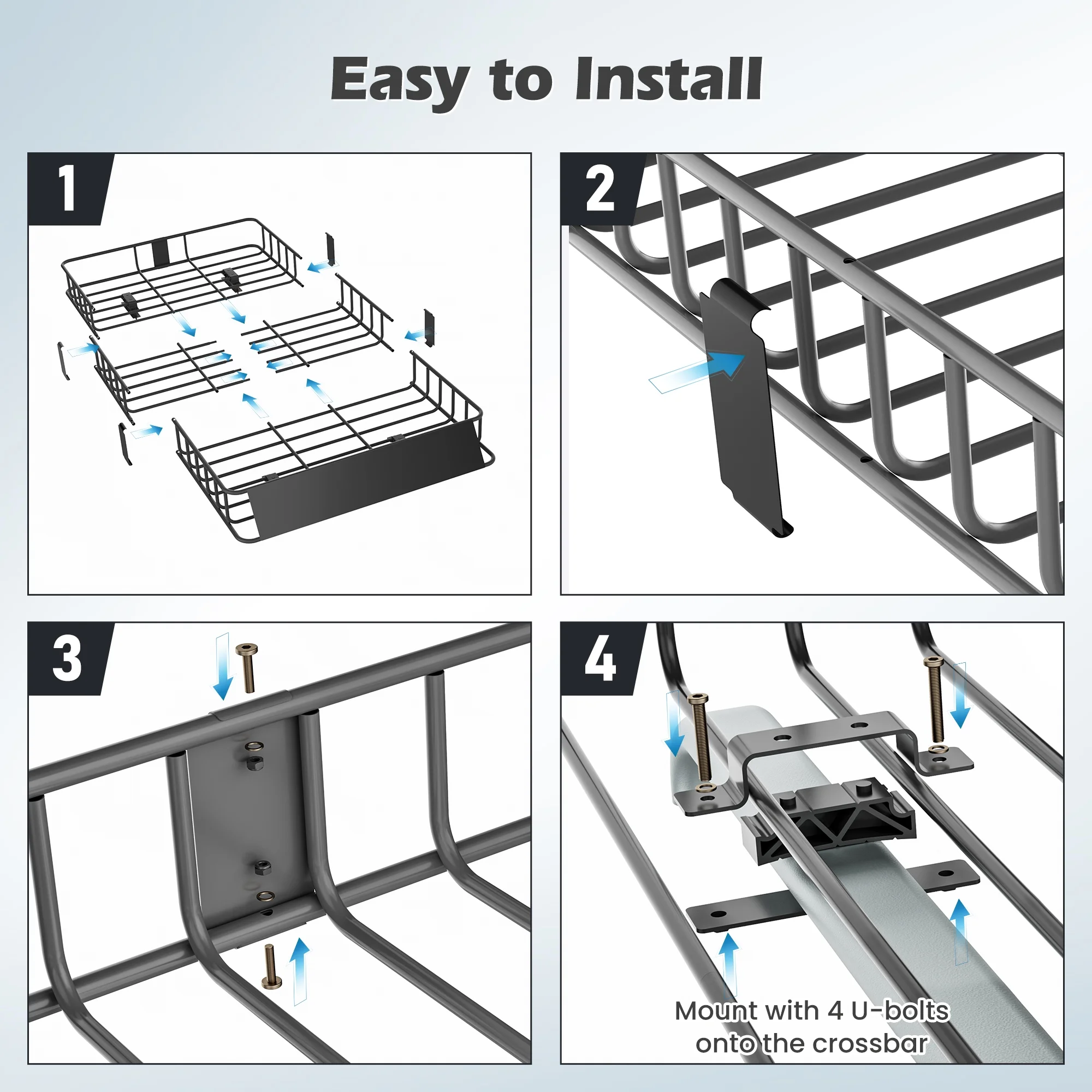- 【Easy to Install】Our auto roof cargo basket comes with 4 universal U-bolts that adapt to various crossbar shapes. No additional tools are required-our universal roof rack 64 x 39 inch comes with installation tools including hex wrenches and wrenches, ensuring easy assembly and disassembly. Included with a clear and intuitive illustrated manual—even outdoor adventures beginners can set it up quickly.
