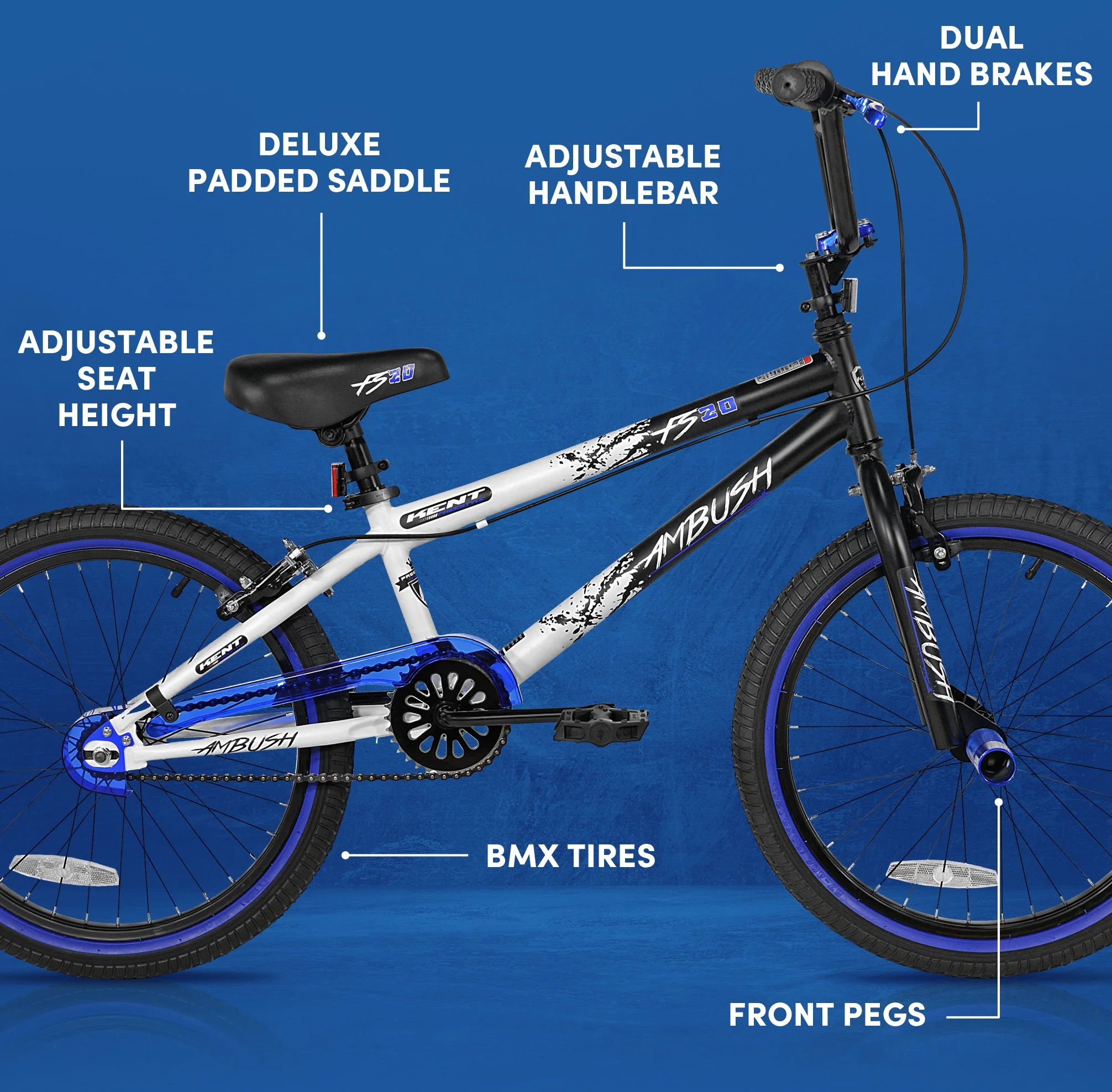 For kids with a sense of adventure, the Kent 20" Ambush BMX Boy's child bicycle offers an amazingly smooth, stylish ride that will keep them entertained for hours of active fun. Made by Kent International, It has front and rear hand brakes for convenience and safety with grips and a padded adjustable saddle seat for sustained comfort and control. Optimized for amazing tricks, this blue Kent BMX bike boasts a four-bolt alloy stem, alloy rims and front pegs. It's also lightweight and sturdy with a durable, non-corrosive steel frame for extended use. The Kent 20" Ambush BMX Boy's Bike features a modern design, so boys will enjoy using it to ride on the neighborhood streets.