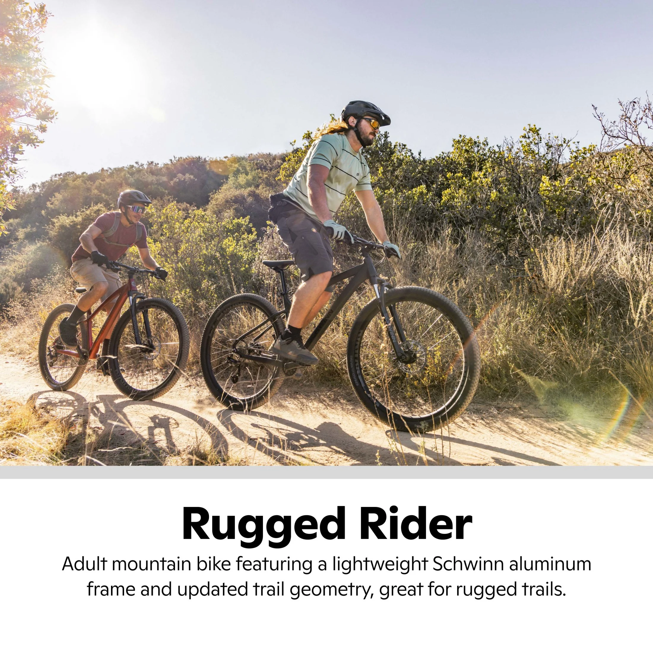 - Adult mountain bike featuring a lightweight Schwinn aluminum frame and improved performance, great for rugged trails. 29-inch wheels fit riders between 5' 4" and 5' 8" tall. Unisex.