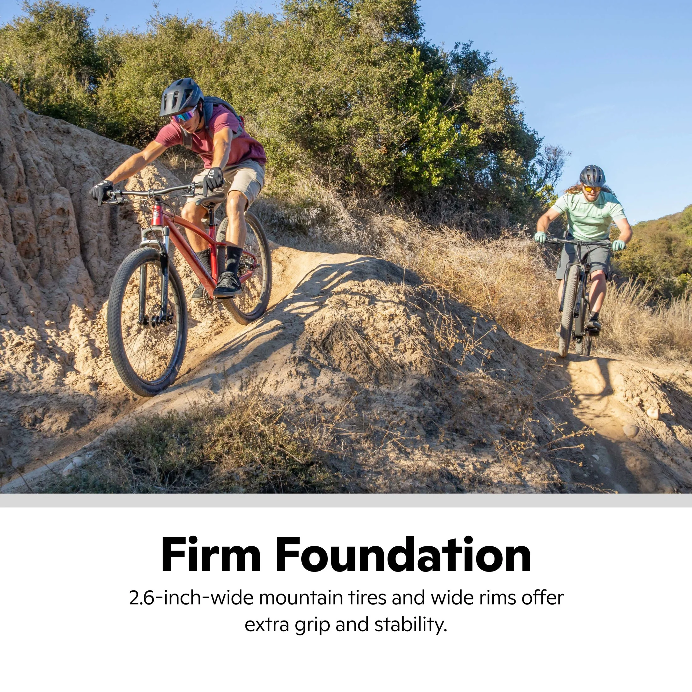 - 2.6-inch-wide mountain tires and wide rims offer extra grip and stability.