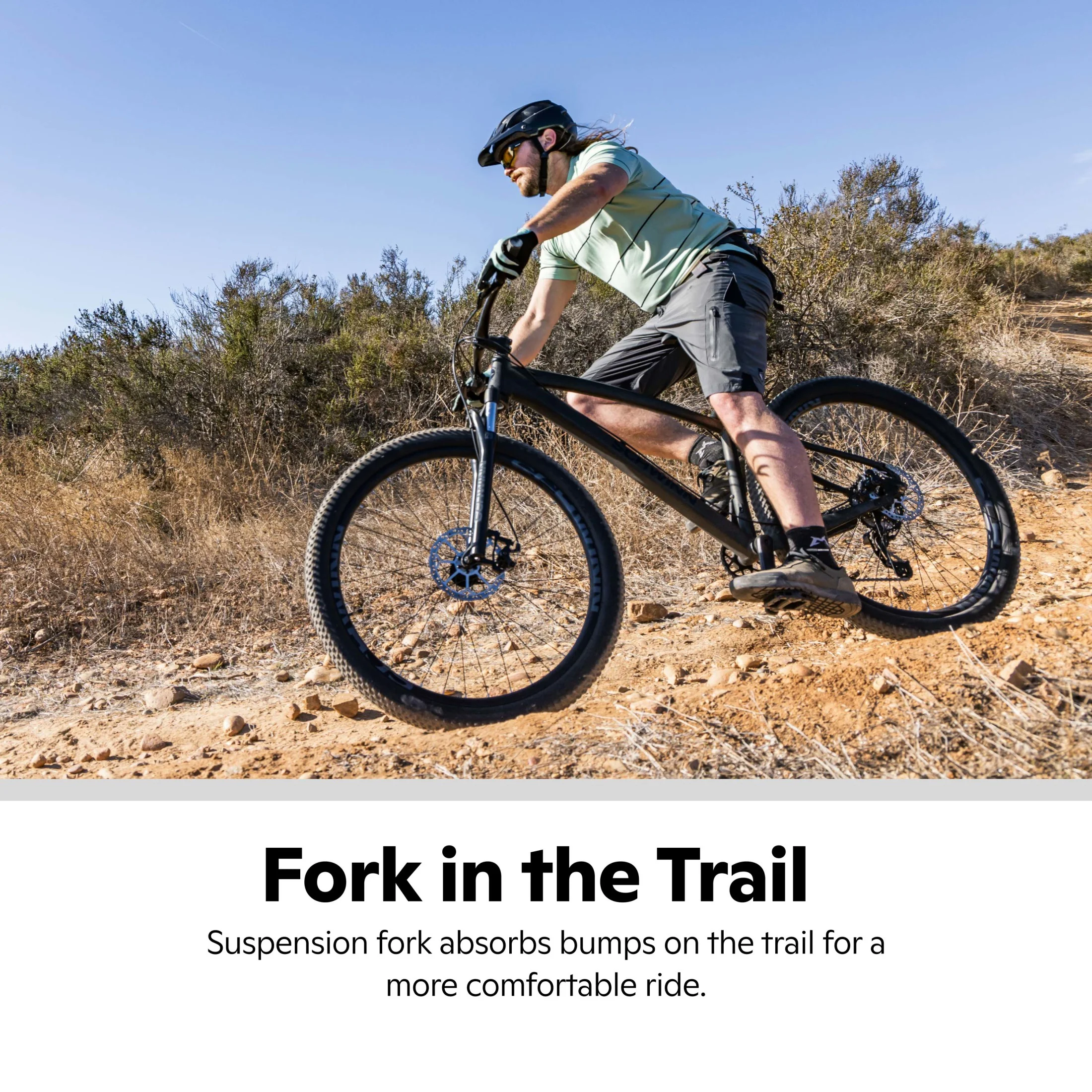 - Suspension fork absorbs bumps on the trail for a more comfortable ride.