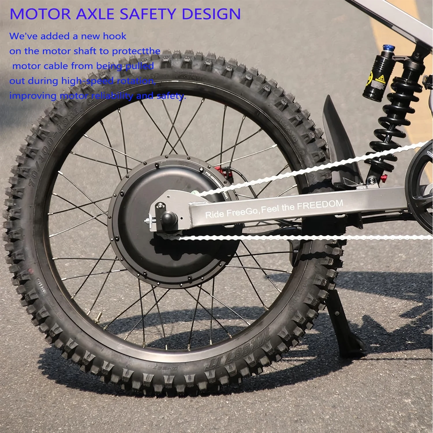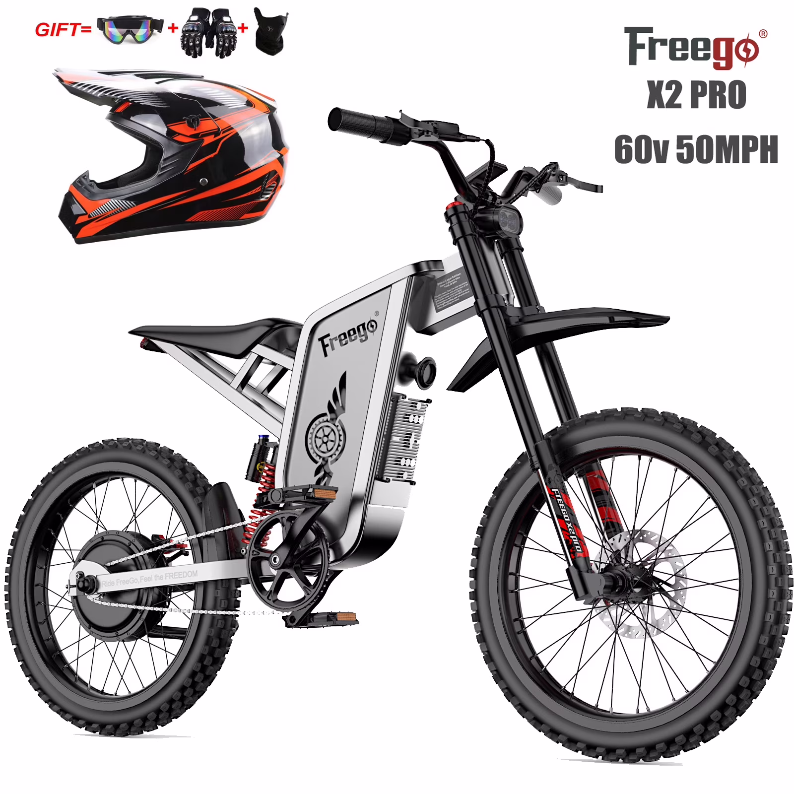 - The FreeGo X2 Pro features a robust 3000W motor (nominal), delivering up to 6000W at peak for thrilling acceleration. Its 60V, 35Ah (2100Wh) battery offers two modes: City mode (28MPH) and Off-road mode (50MPH), adapting seamlessly to various terrains. A magnetic pedal-assist sensor ensures smooth pedaling, while the advanced four-piston braking system with 203mm discs provides outstanding stopping power for unmatched safety.Equipped with the new M5 display, the X2 Pro gives real-time updates on speed, battery status, and distance traveled. The upgraded seat is thicker, wider, and positioned lower for added comfort, while non-slip rubber grips improve control. Enhanced motorcycle-grade spokes and anti-slip tires ensure stability, even at high speeds. A fan-cooled charger and refined suspension further elevate your riding experience.Safety takes center stage with the X2 Pro’s upgraded four-piston braking system. Featuring a 203mm disc, it ensures motorcycle-level stopping power in any condition. Combined with a redesigned brake lever for smoother operation, this improvement significantly outperforms the X2’s dual-piston setup, giving riders unparalleled confidence on every ride.For ultimate comfort, the X2 Pro introduces a redesigned seat—10% thicker and wider, with a lower profile to suit more riders. Non-slip, sweat-resistant grips enhance handling, while the half-twist throttle offers a secure and ergonomic grip, minimizing discomfort during extended rides. These refinements ensure a superior user experience compared to the X2.The magnetic pedal-assist system activates the motor with each pedal stroke, delivering effortless transitions between manual pedaling and electric assistance. This innovation keeps the X2 Pro compliant with e-bike regulations while ensuring a smooth ride across urban streets or rugged trails. Additionally, its high-strength steel frame boosts durability and flexibility, providing better resilience against rough terrains compared to the X2’s aluminum build.This Electric Dirt Bike for Adults comes 85% pre-assembled. We provide the installation tutorial video, manual and tools to help you assemble. Each Electric Bike comes with 1-year all-inclusive warranty service. We provide professional technical guidance, if you have any questions, please feel free to contact us and we will reply you in 24hrs. Customer Service 30-Day Refunds Return undamaged products within 30 days of the purchase date for a refund. To be eligible for a refund, your product must be in the same condition as when you received it. Undamaged, unused or e-bike, it must include all items in the box (charger, keys, hardware, etc.) and in its original packaging.Equipped with the new M5 display, the X2 Pro gives real-time updates on speed, battery status, and distance traveled. The upgraded seat is thicker, wider, and positioned lower for added comfort, while non-slip rubber grips improve control. Enhanced motorcycle-grade spokes and anti-slip tires ensure stability, even at high speeds. A fan-cooled charger and refined suspension further elevate your riding experience.Safety takes center stage with the X2 Pro’s upgraded four-piston braking system. Featuring a 203mm disc, it ensures motorcycle-level stopping power in any condition. Combined with a redesigned brake lever for smoother operation, this improvement significantly outperforms the X2’s dual-piston setup, giving riders unparalleled confidence on every ride.For ultimate comfort, the X2 Pro introduces a redesigned seat—10% thicker and wider, with a lower profile to suit more riders. Non-slip, sweat-resistant grips enhance handling, while the half-twist throttle offers a secure and ergonomic grip, minimizing discomfort during extended rides. These refinements ensure a superior user experience compared to the X2.The magnetic pedal-assist system activates the motor with each pedal stroke, delivering effortless transitions between manual pedaling and electric assistance. This innovation keeps the X2 Pro compliant with e-bike regulations while ensuring a smooth ride across urban streets or rugged trails. Additionally, its high-strength steel frame boosts durability and flexibility, providing better resilience against rough terrains compared to the X2’s aluminum build.This Electric Dirt Bike for Adults comes 85% pre-assembled. We provide the installation tutorial video, manual and tools to help you assemble. Each Electric Bike comes with 1-year all-inclusive warranty service. We provide professional technical guidance, if you have any questions, please feel free to contact us and we will reply you in 24hrs.Customer Service 30-Day Refunds Return undamaged products within 30 days of the purchase date for a refund. To be eligible for a refund, your product must be in the same condition as when you received it. Undamaged, unused or e-bike, it must include all items in the box (charger, keys, hardware, etc.) and in its original packaging.