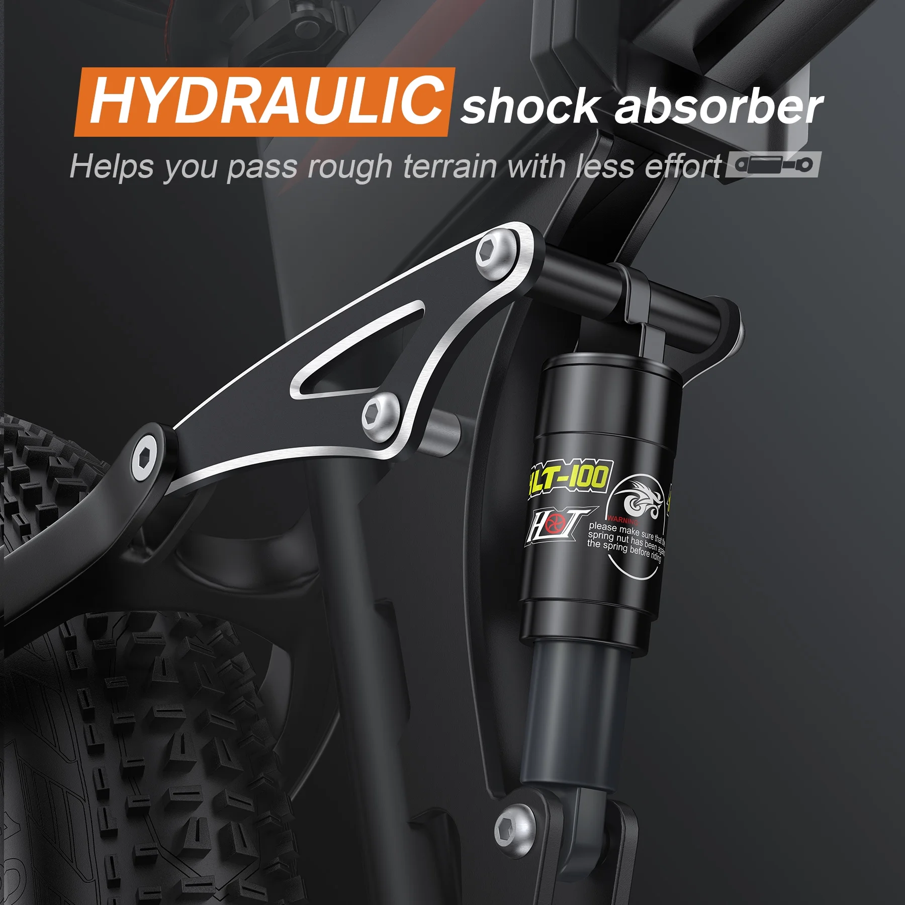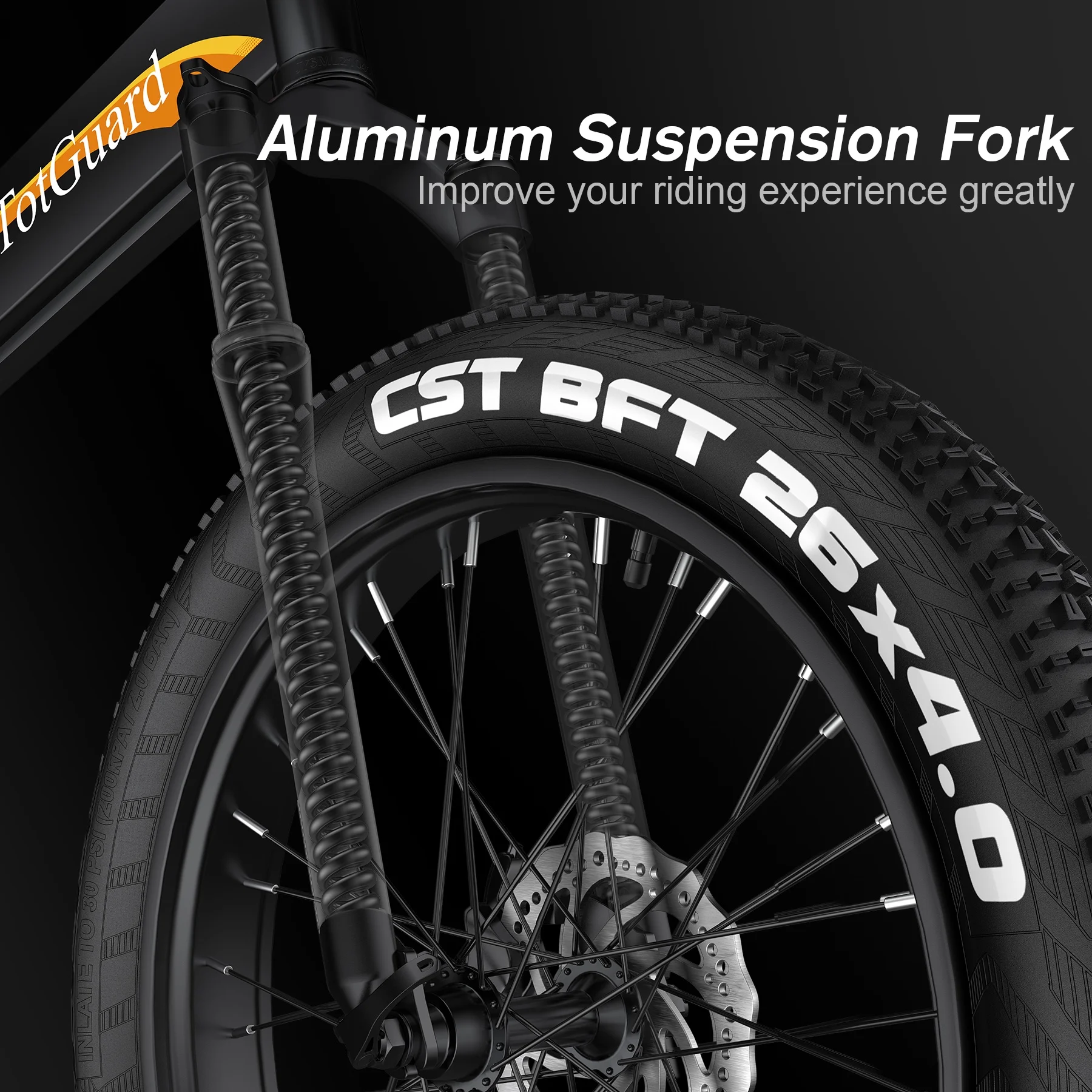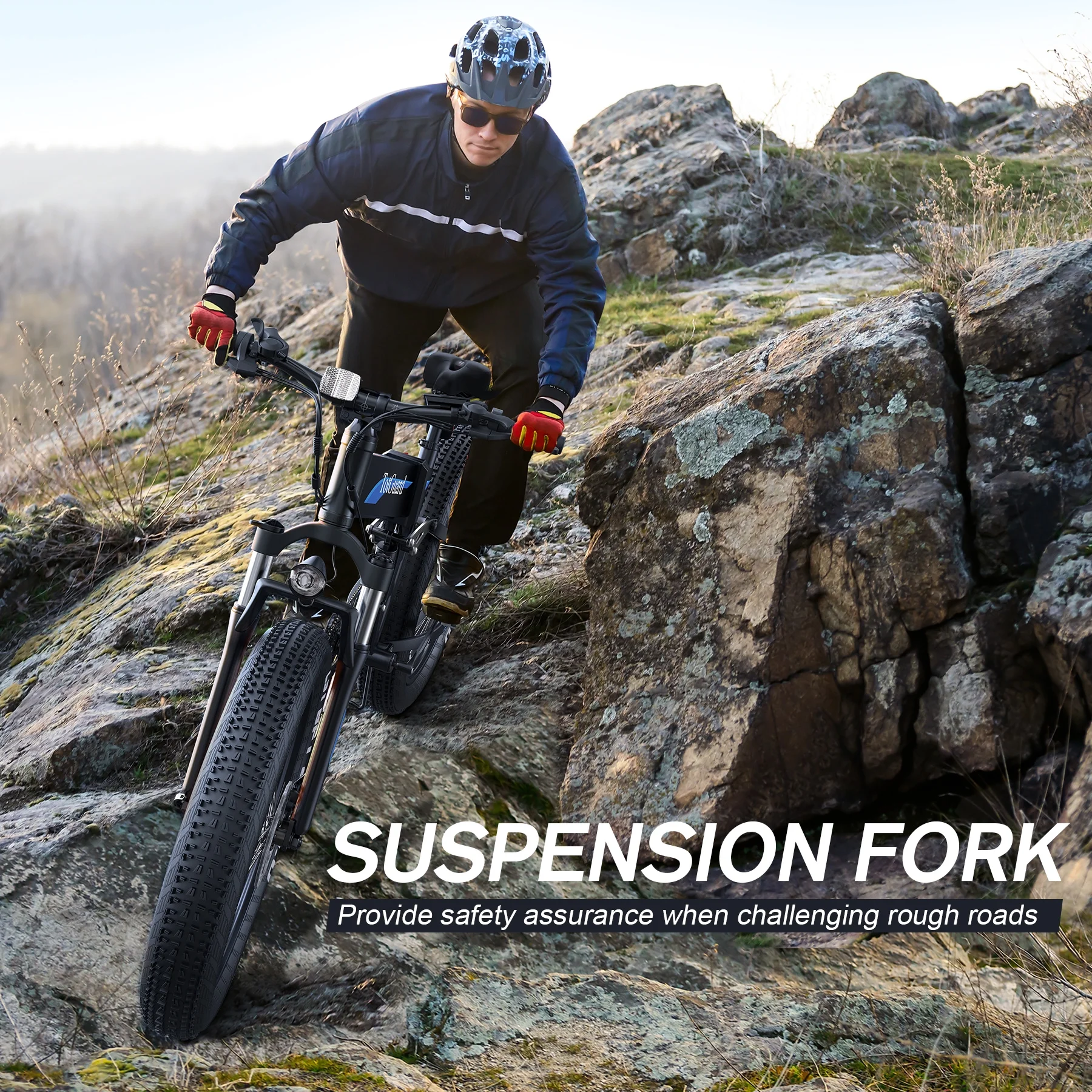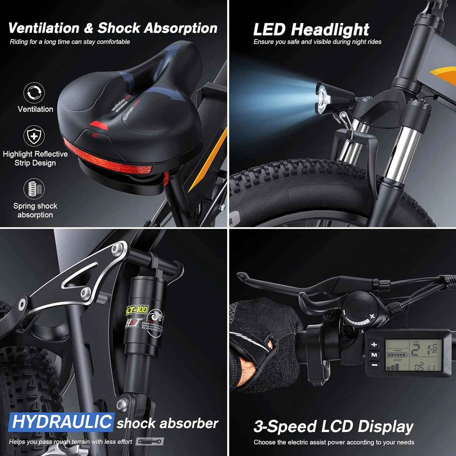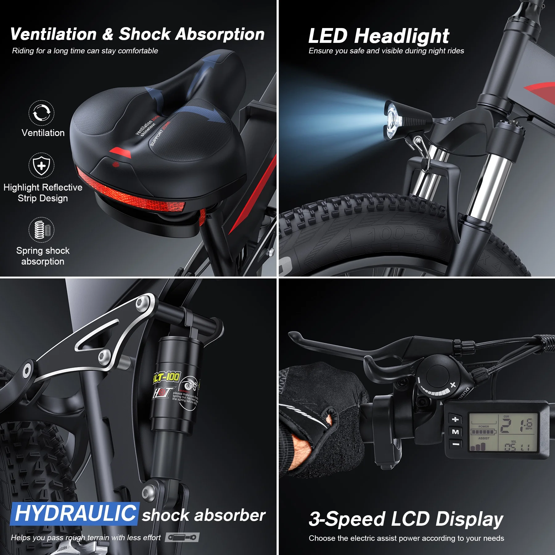 👉INNOVATIVE DESIGN: The 4'' knobby Fat tires provide excellent traction on slippery roads; Dual shock absorbers(lockable suspension fork+seat suspension post) make you feel less bumpy on rough roads; Front and rear reflectors and LED headlights help you ride safely; With durable and sturdy aluminum alloy material on this ebike, it gives more safety instead of wobbling when riding at high speed. Sporty style, streamlined matte finish, and simple decal style built an amazing beast-like look.