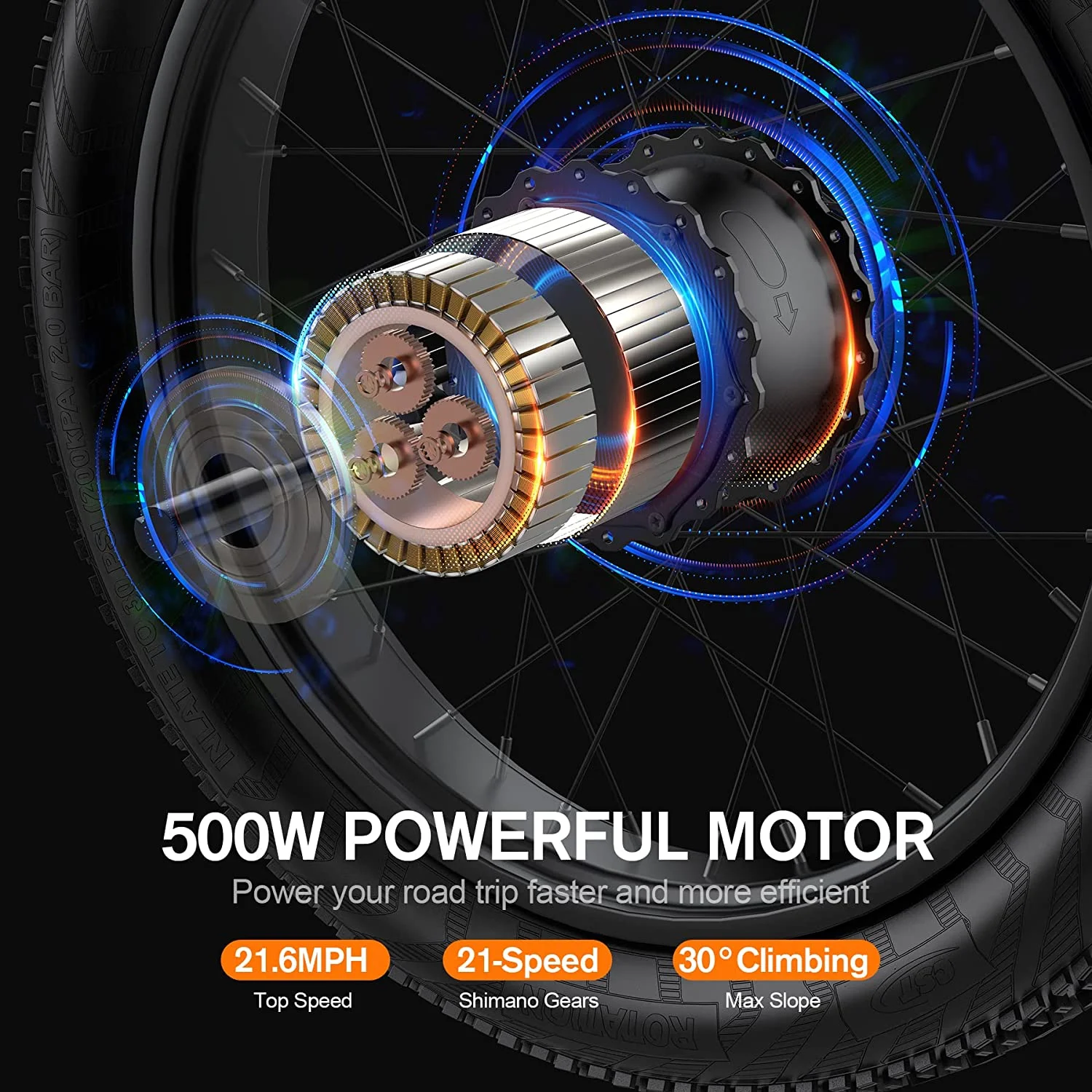 👉STRONG 500W POWER: This 500W Powerful ebike for adults is equipped with a built-in 48V 10Ah rechargeable lithium-ion battery(about 5h charging time) to achieve a top speed of 21.6mph