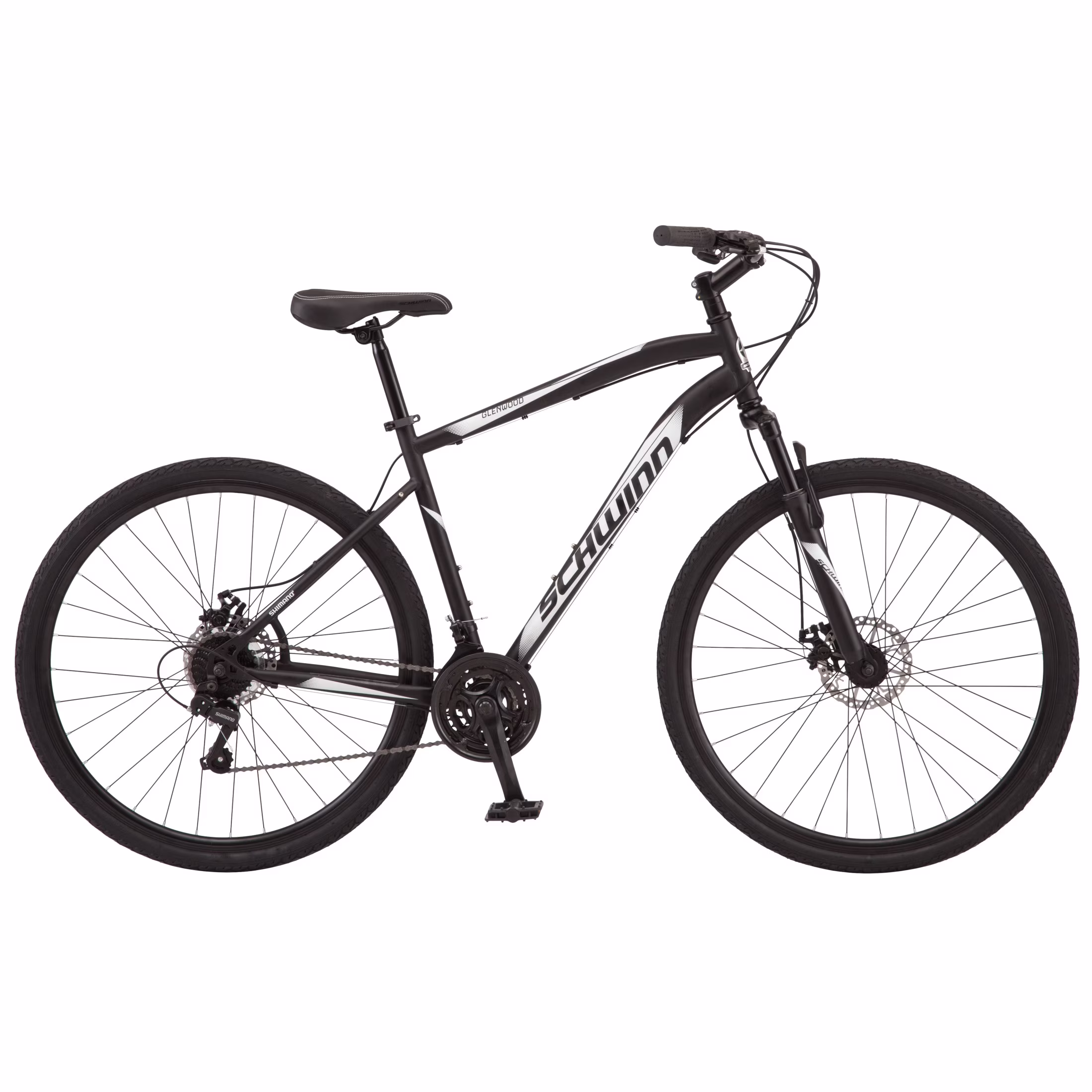 Tooling around the neighborhood? Riding through your favorite park? Or on your way to work? Make your ride the best part of the day with the Glenwood hybrid bike by Schwinn. The Glenwood features a durable steel Schwinn frame and suspension fork that absorbs bumps in the road, giving you a more comfortable ride. 21 speeds let you easily adapt to your terrain with quick, precise gear changes, while the front and rear disc brakes deliver precision stopping power. Plus, alloy double-wall rims with dual sport tires are perfectly suited for pavement and bike path rides. Exercise, commute, or just have a little fun you can do it all with Glenwood. View more from us on our brand page.