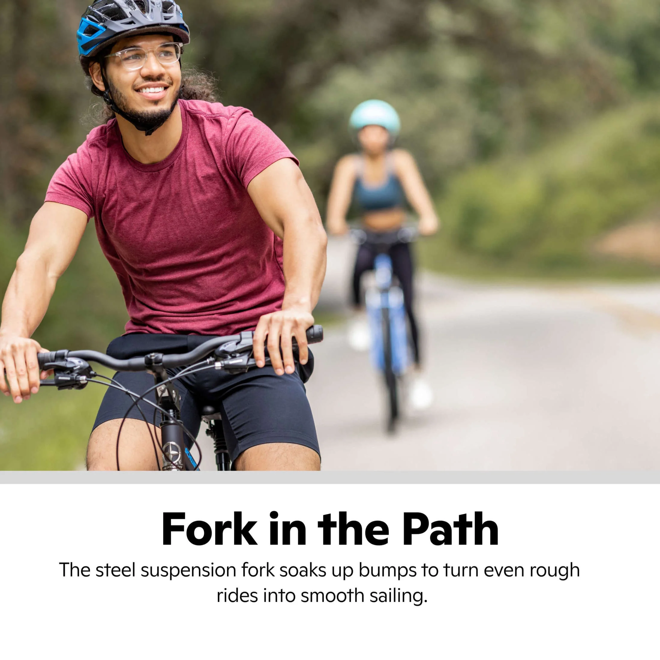- Durable steel hybrid frame with suspension fork to absorb bumps in the road and provide a more comfortable ride.
