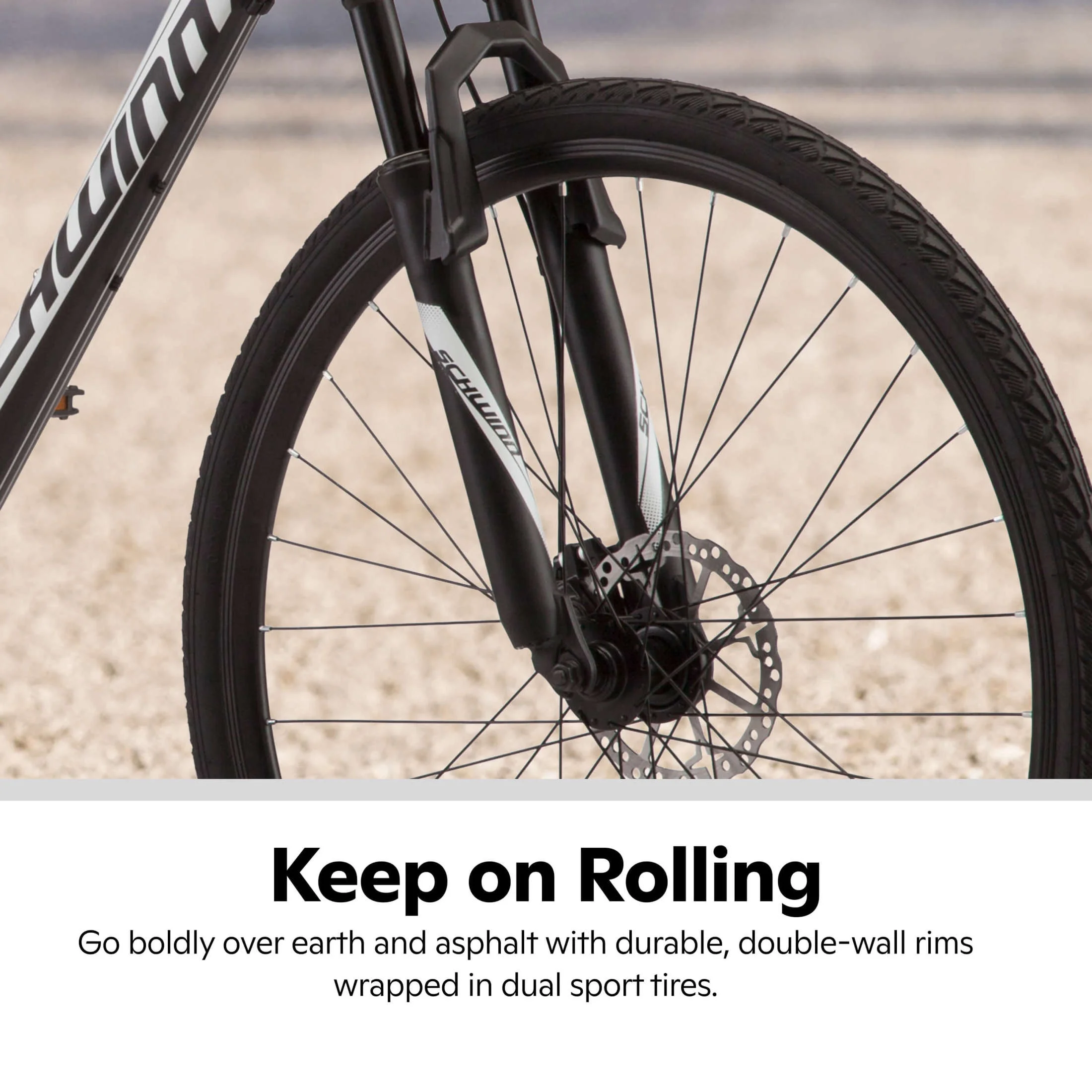 - Alloy double wall rims with dual sport tires are perfect for pavement and bike paths.
